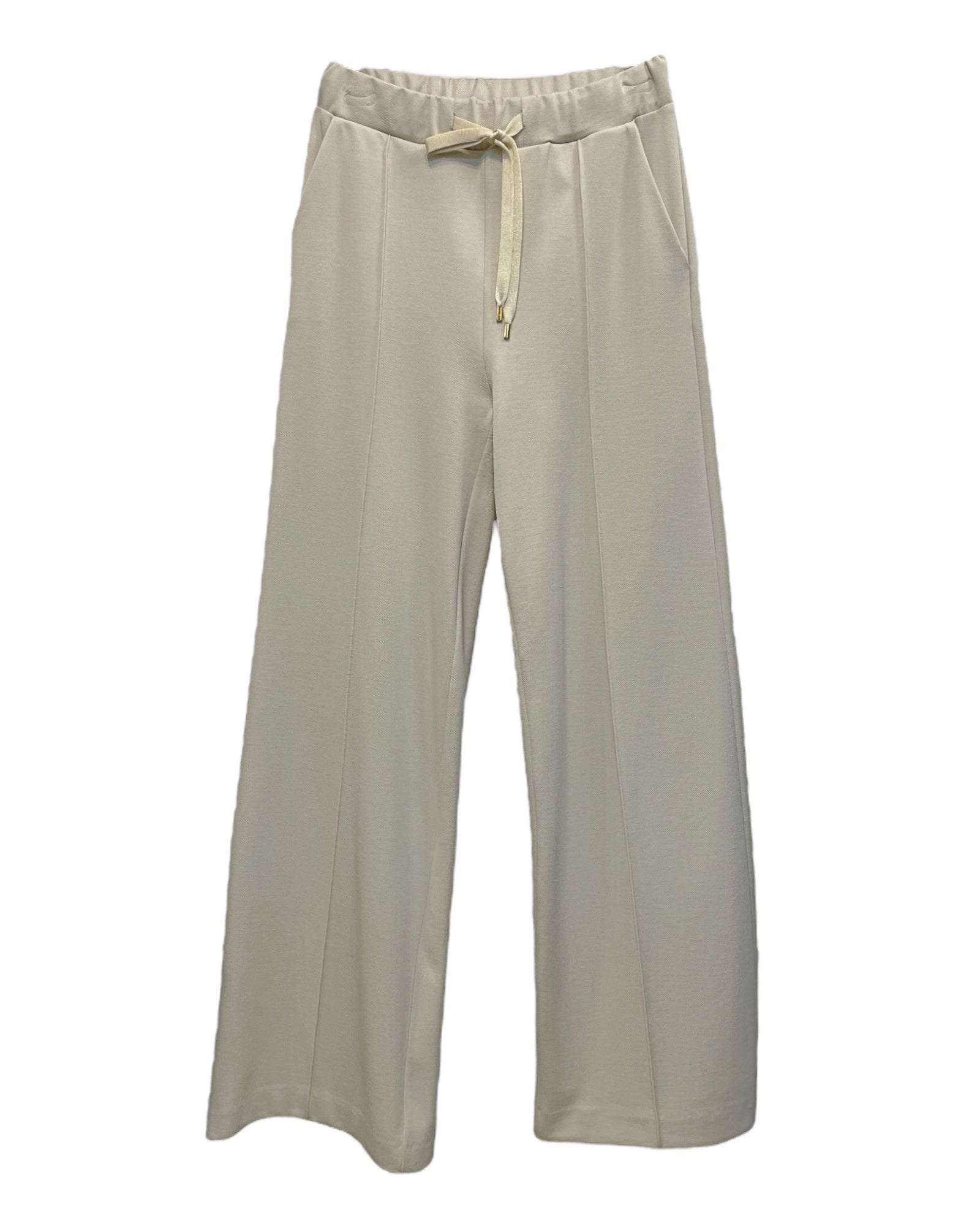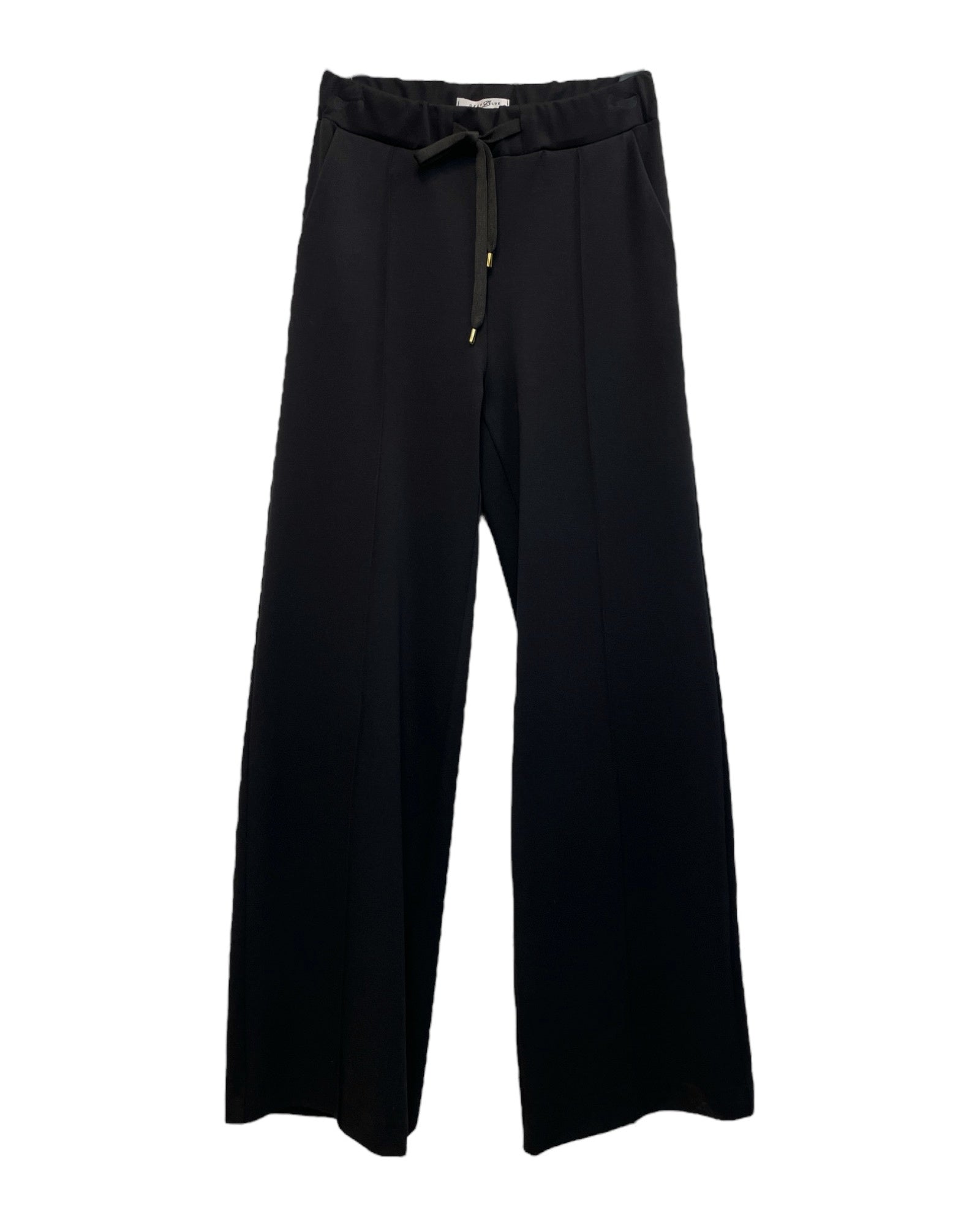Palazzo trousers in stretch fabric. High waist with elastic and drawstring to adjust the fit. Wide leg and bottom, raised pleat detail on the front. Comfortable fit.