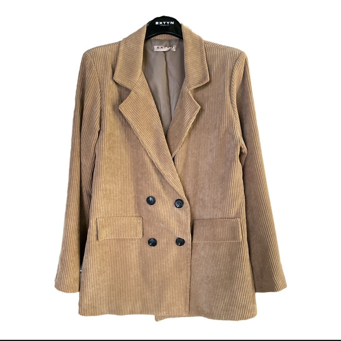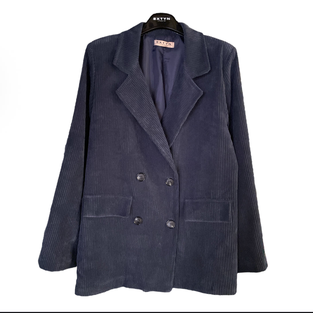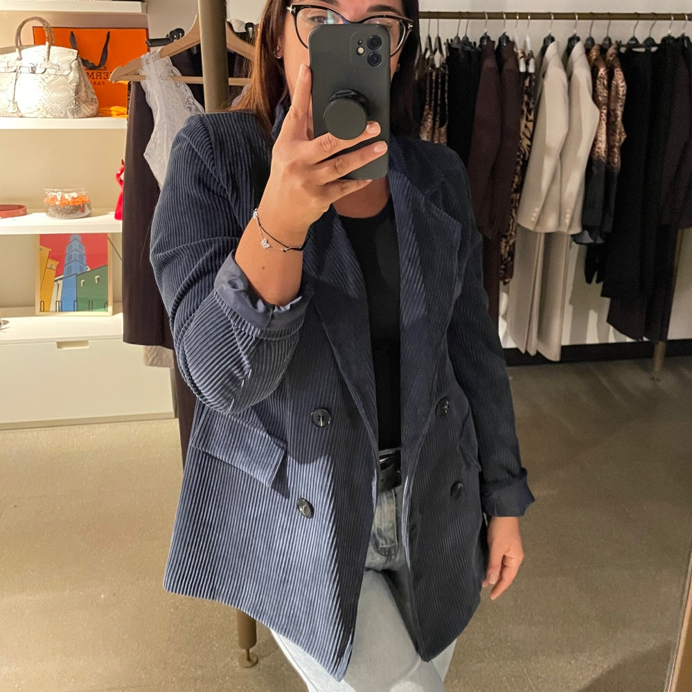 Giacca donna in tessuto velluto a coste. Vestibilità loose. Collo con revers regolari, chiusura doppio petto. Fodera in tessuto lucido. Composizione tessuto 87% poliestere 11% nylon 2% elastan.