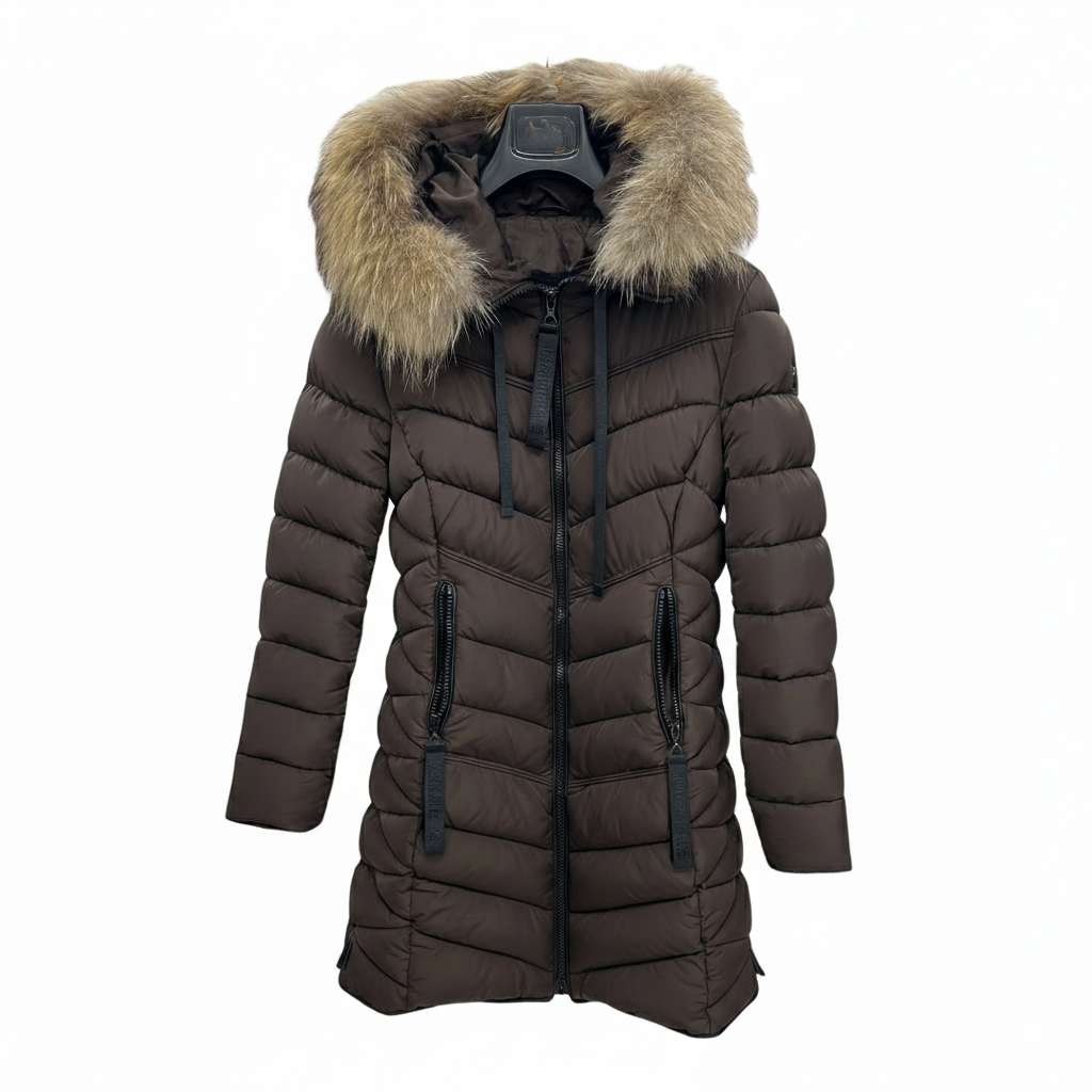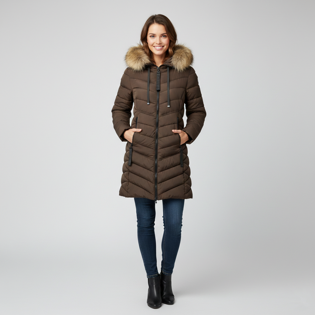 Piumino lungo in tessuto semi-lucido con cappuccio bordato in eco pelliccia. Collo pistagna, chiusura con maxi zip gommata con cordino lungo applicato. Tasche laterali chiuse da zip con cordino applicato, doppio spacchetto laterale. Vestibilità sagomata.