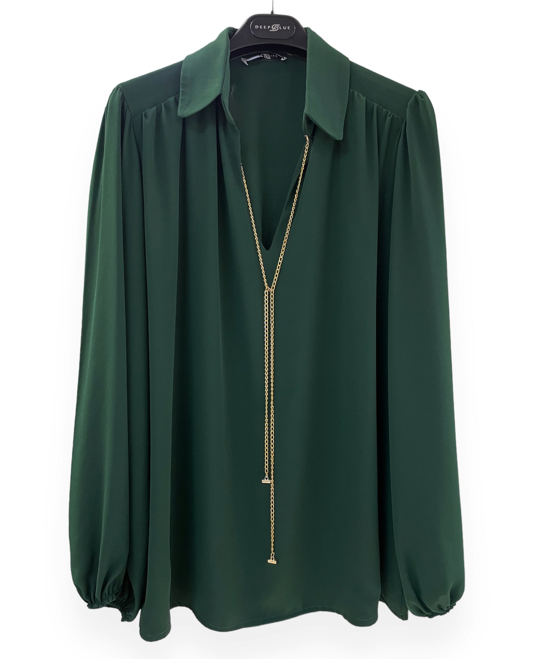 Tunic in 100% viscose fabric. Narrow collar, pointed neckline with necklace applied with hooks. Long sleeves with puffed cuffs with elastic. Comfortable fit.