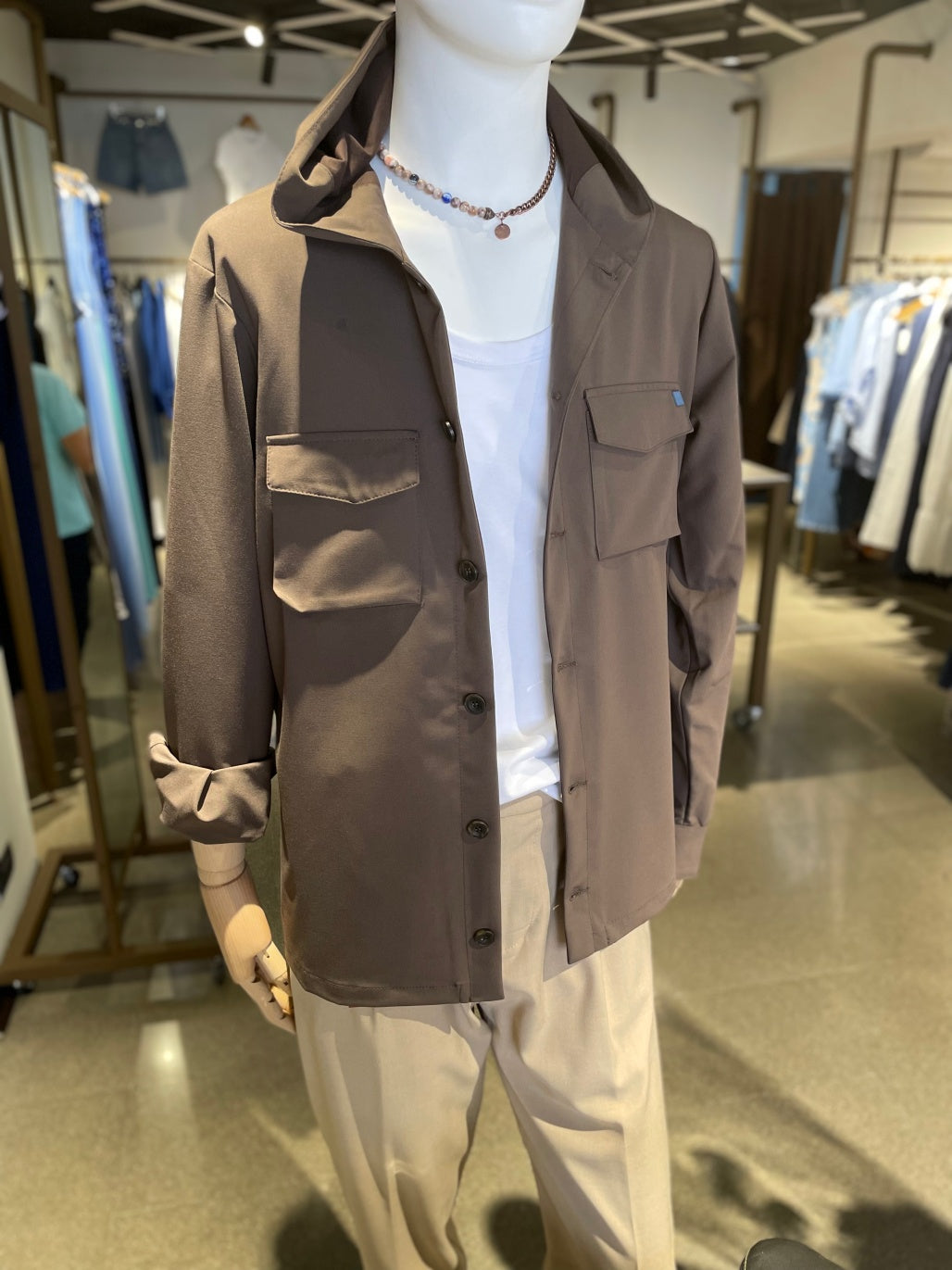 Over Jacket in tessuto tecnico ultra leggero. Cappuccio, tasconi applicati sul petto con pattina. Chiusura con bottoni in tinta a contrasto. Polsini alti chiusi da bottoni. Vestibilità comoda. Perfetta per completare un look urban di tendenza.