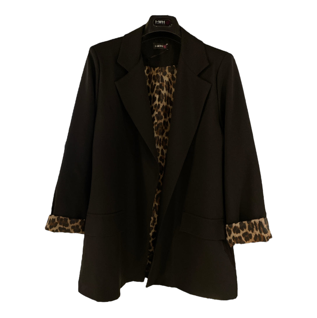Giacca donna oversize in tessuto tecnico. Revers regolari, senza bottoni. Maniche polsini leopardati, fodera in tessuto lucido stampa leopardata. Vestibilità over comoda. Veste dalla XS alla L. Composizione tessuto 95% poliestere 5% elastan.