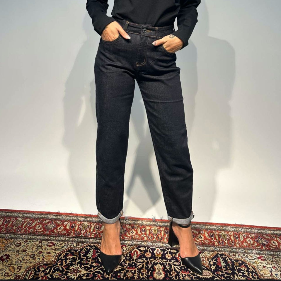 Jeans donna mom-fit in tessuto denim di cotone. Vita regolare, 5 tasche, chiusura con zip e bottone. Lavaggio blue denim dark assoluto. Gamba morbida e fondo alla caviglia con risvolto. Vestibilità regolare, taglia in foto S. Composizione tessuto 51% cotone, 25% poliestere, 22% lyocell, 2% elastan.