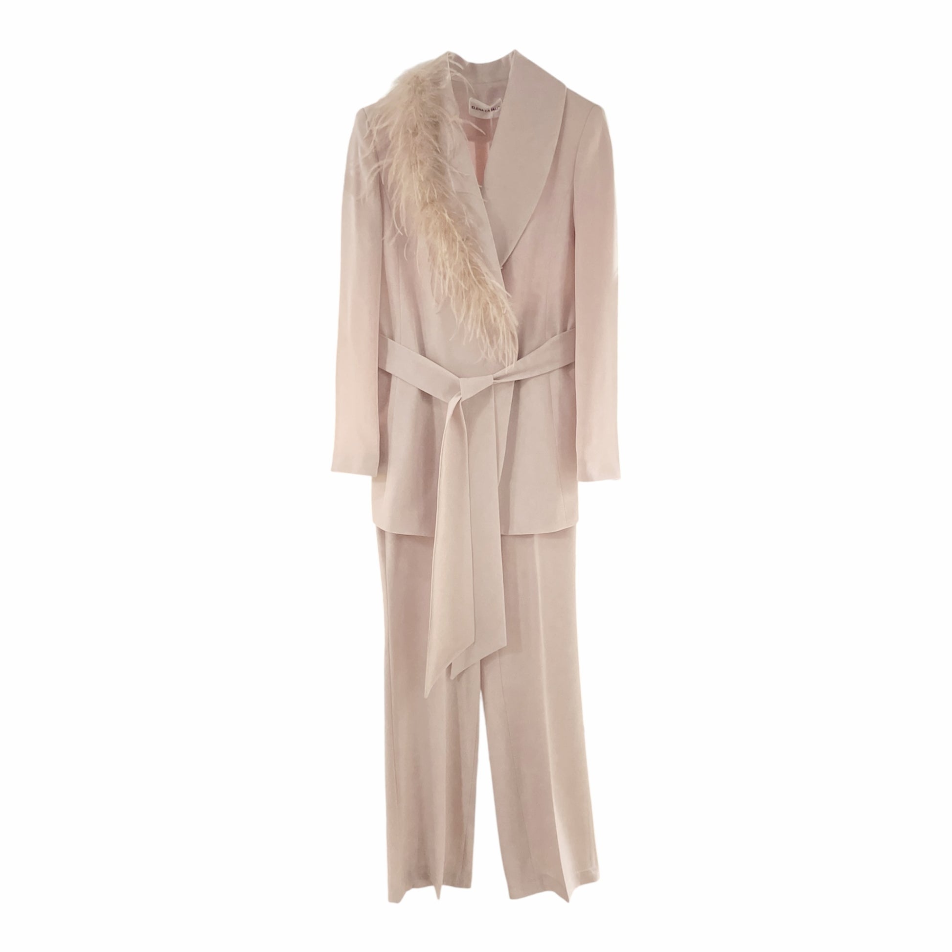 Tailleur elegante in tessuto tecnico fluido. Giacca modello blazer con revers stondati con fila di piume in tinta sul lato destro. Chiusura con fusciacca lunga. Pantalone modello a zampa. Vita regolare con cinturino fisso, chiusura con zip laterale. Gamba slim e fondo che va ad aprirsi dal ginocchio al fondo. Vestibilità regolare.