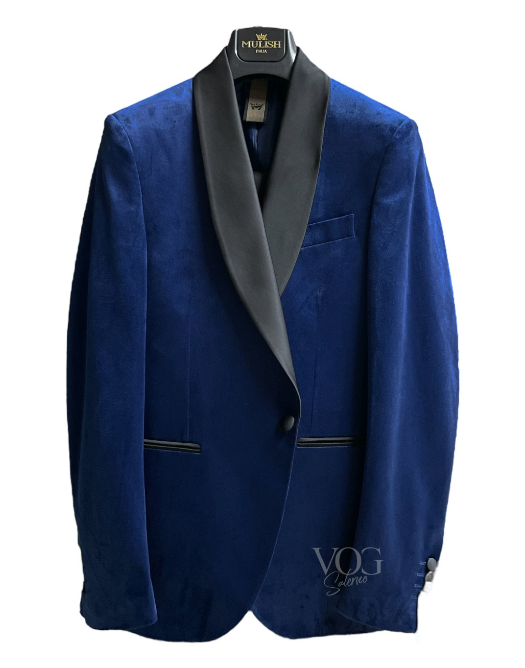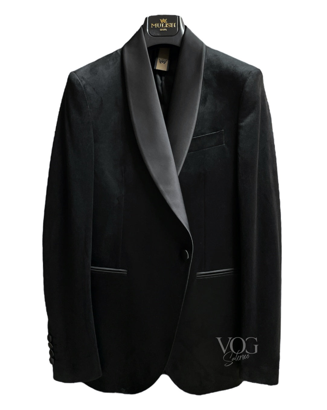 Double fabric tuxedo style formal suit. Slim fit jacket in smooth velvet fabric with shiny fabric shawl collar, closure with a fabric-covered button, side welt pockets with shiny satin fabric edge. Technical fabric. Slim fit trousers in semi-shiny technical fabric, high waist with internal hook and button and zip closure. Rear welt pockets in shiny fabric. Slim fit. Jacket fabric composition 100% polyester, trousers fabric composition 62% polyester 35% viscose 3% elastane.