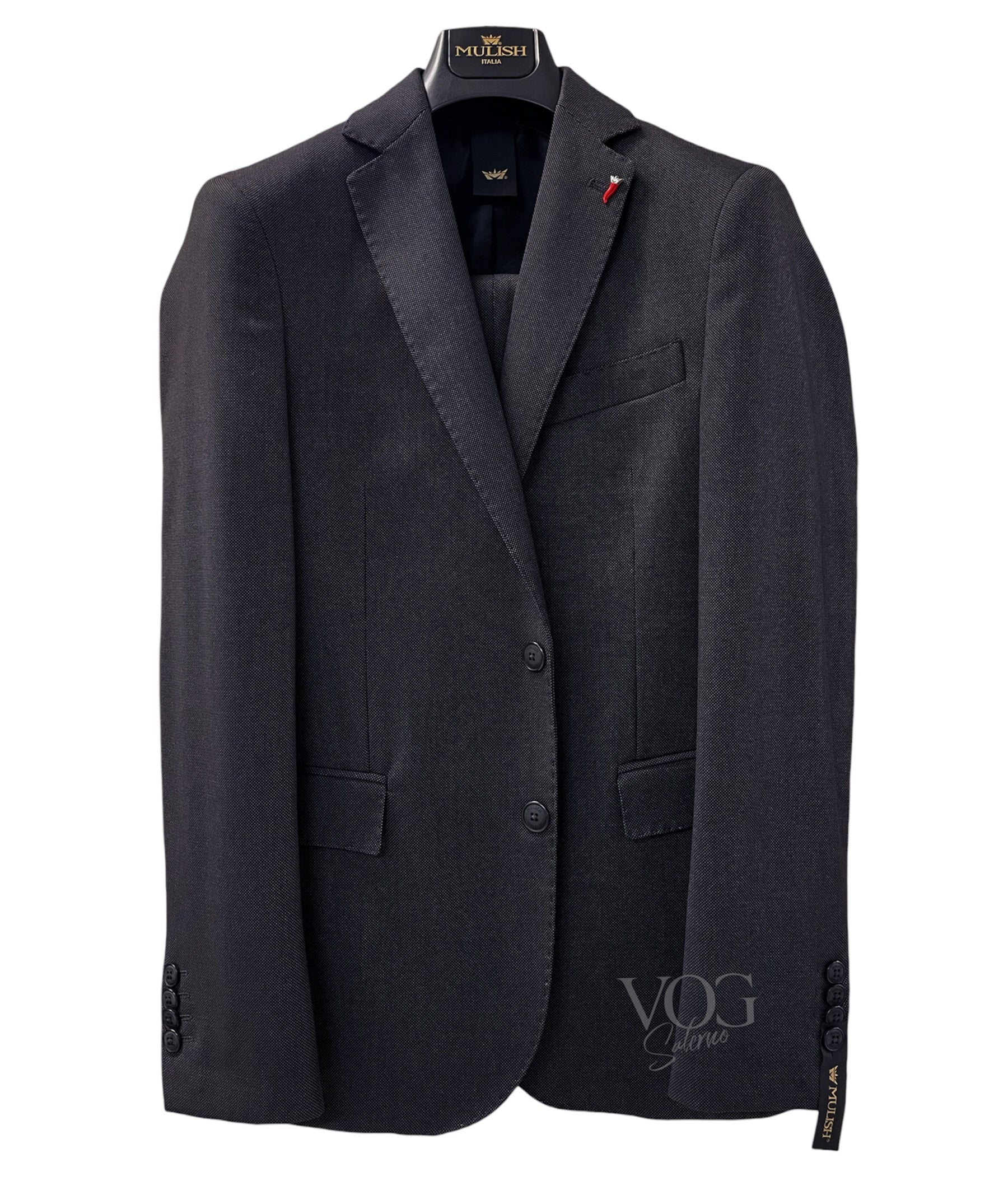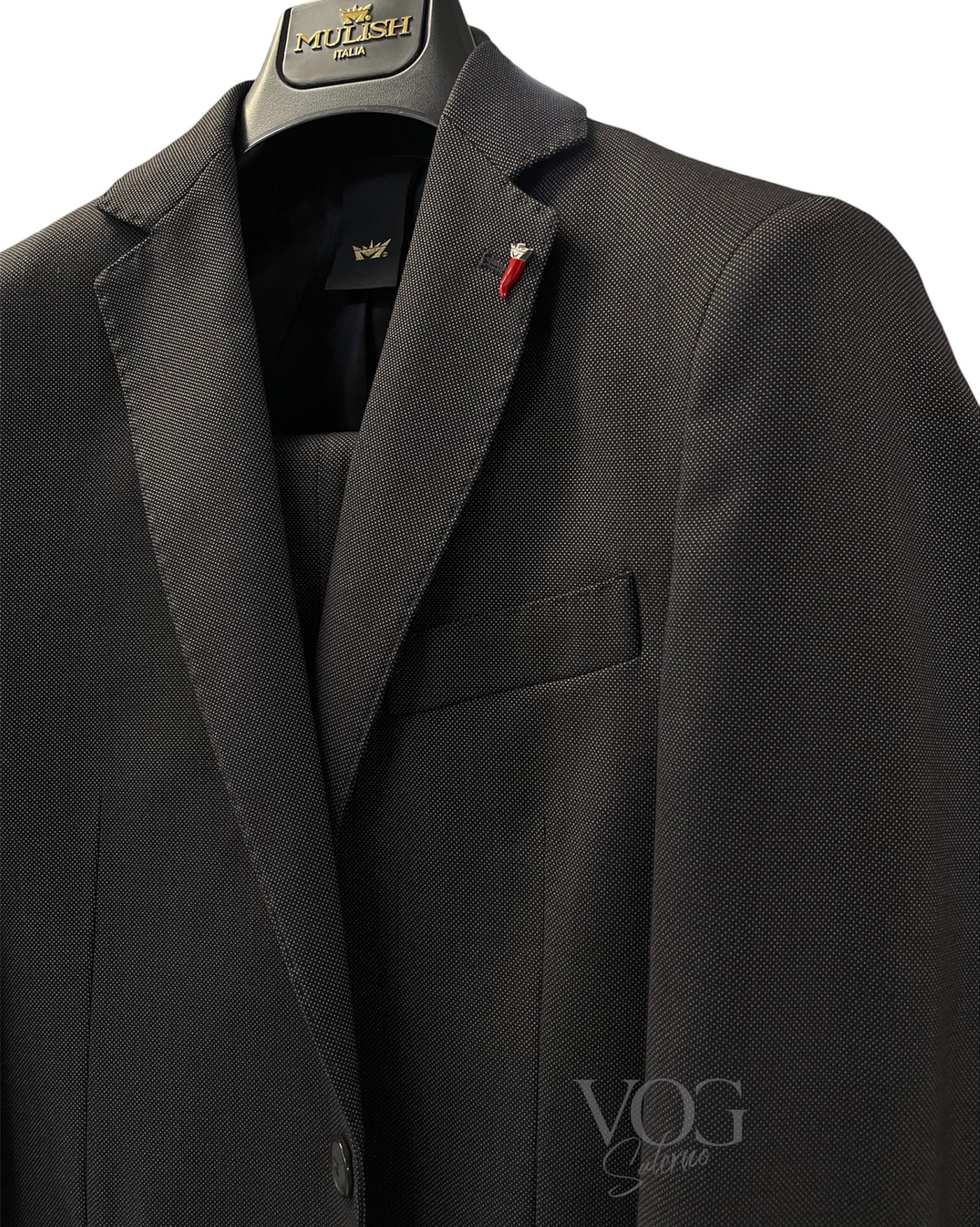 Slim fit suit in stretch viscose blend fabric. Jacket with regular lapel collar, two-button closure, side pockets with applied flap and breast pocket. Regular waist trousers with belt loops, zip and internal hook closure, slim leg and narrow bottom with smooth pleat. Bird's eye weave fabric. Slim fit. Fabric composition 80% polyester, 18% viscose, 2% elastane.