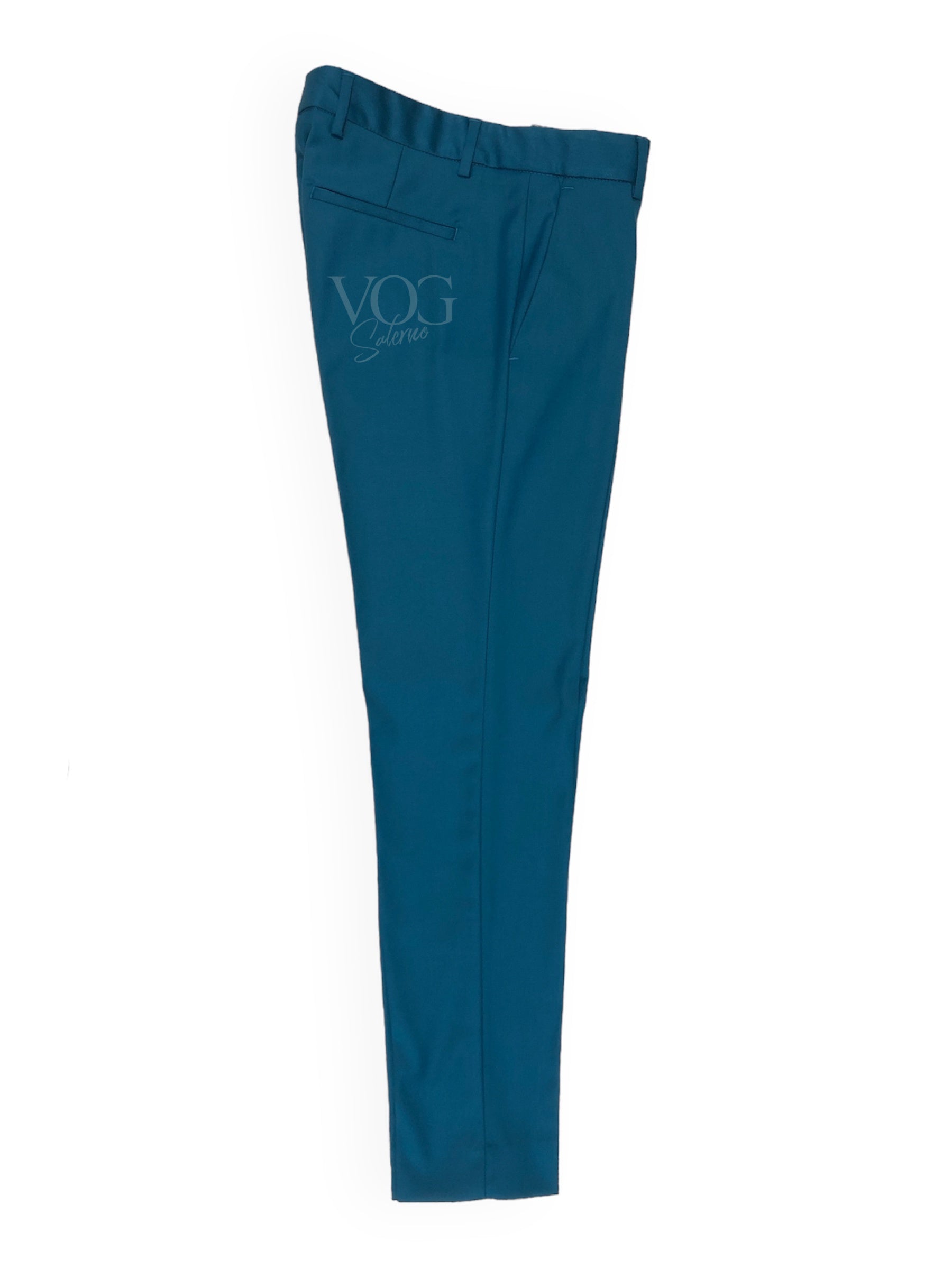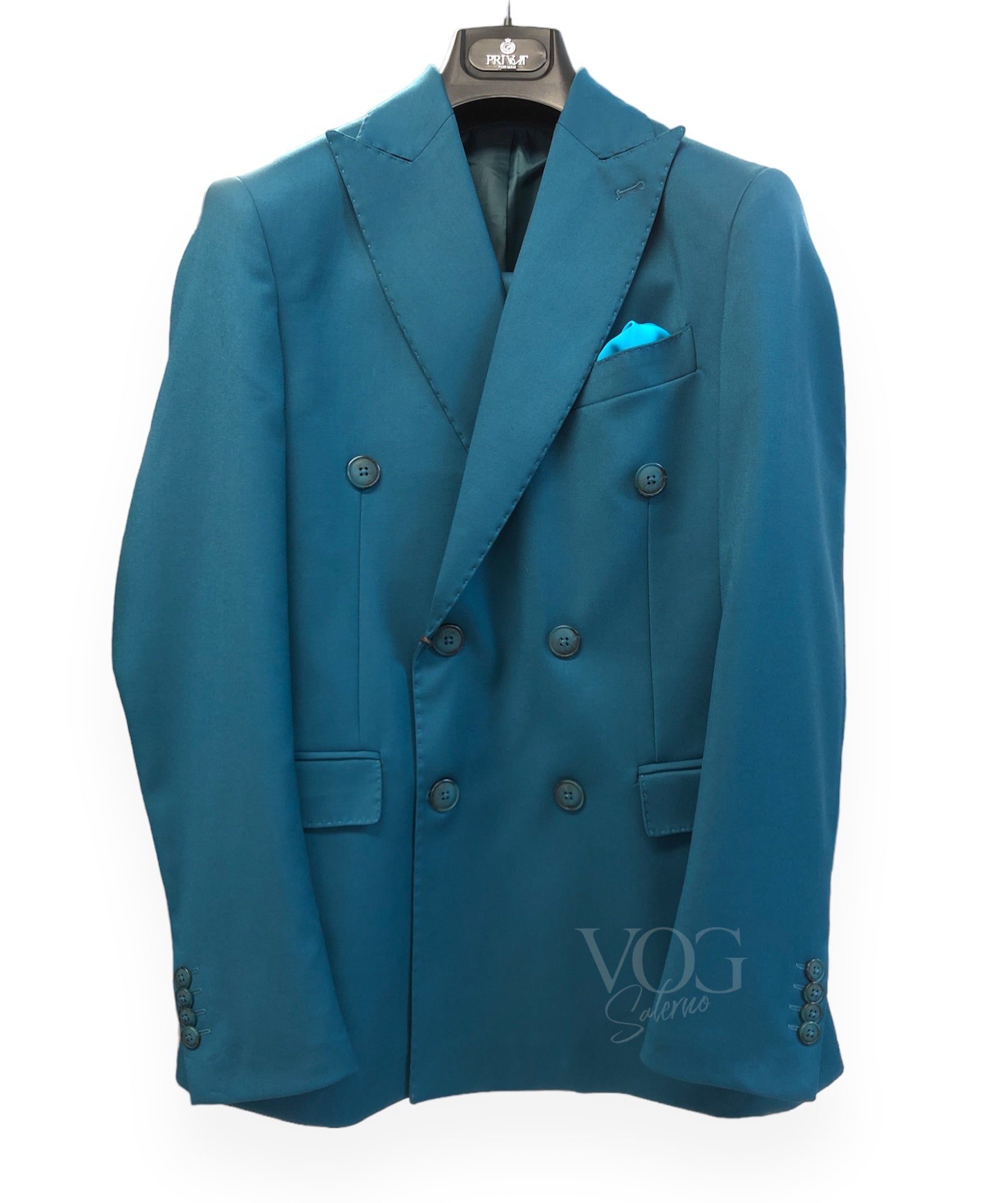 Dress in viscose blend fabric. Peak lapel collar, double-breasted closure with matching buttons. Long sleeves with applied buttons. Matching lining. Trousers with regular waist, belt with belt loops. Zip and button closure and internal hook, narrow leg and bottom. Slim fit. Fabric composition 62% polyester 35% viscose 3% elastane.