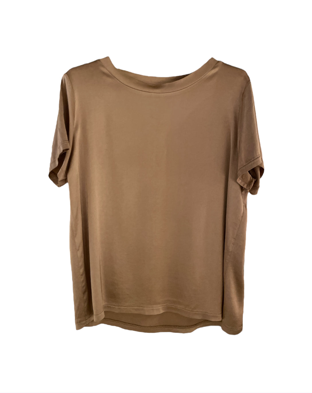 T-shirt in tessuto lucido misto viscosa. Girocollo regolare con bordo liscio, maniche corte. Tessuto effetto raso liscio. Vestibilità regolare. Tessuto 97% viscosa 3% elastan.