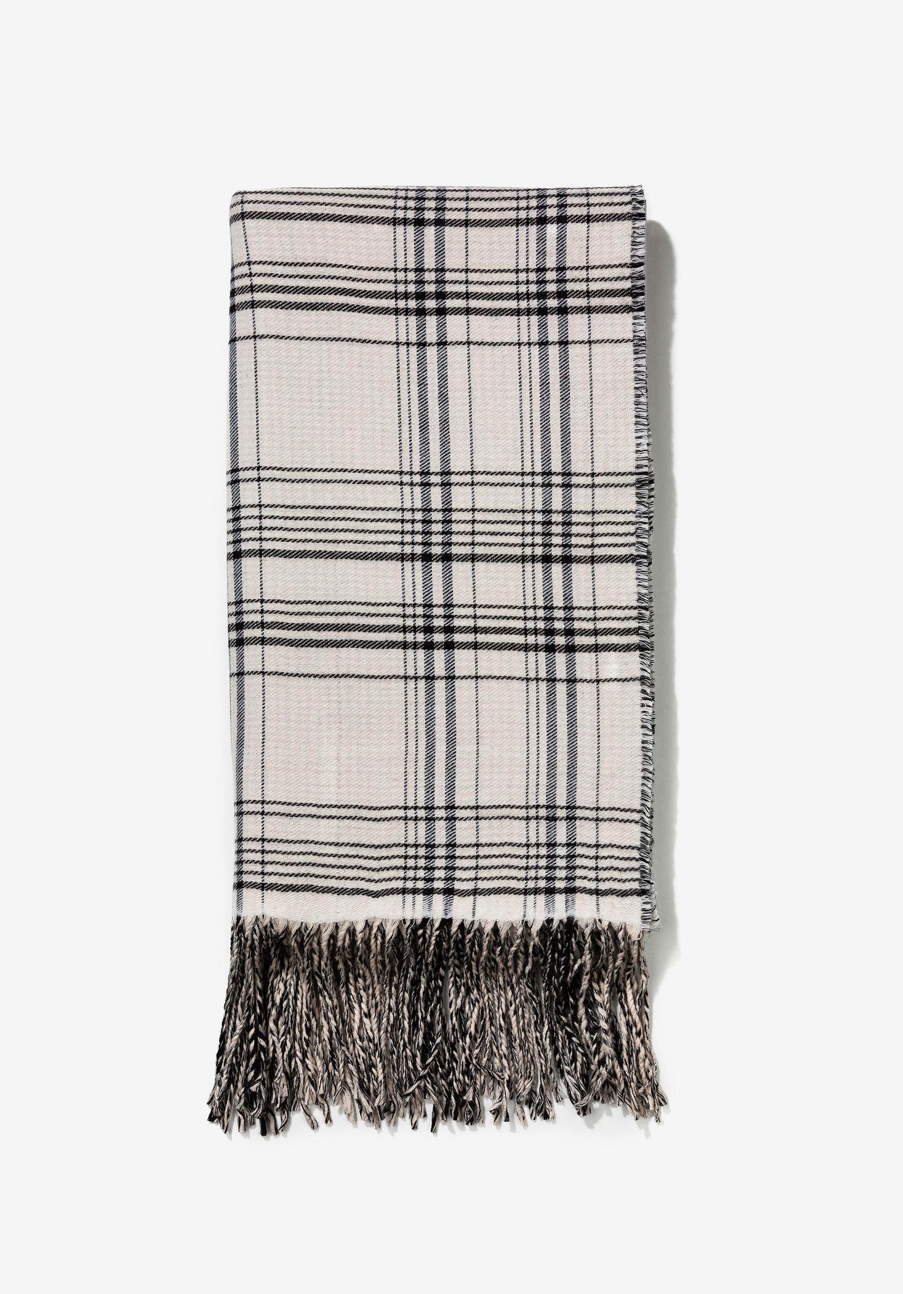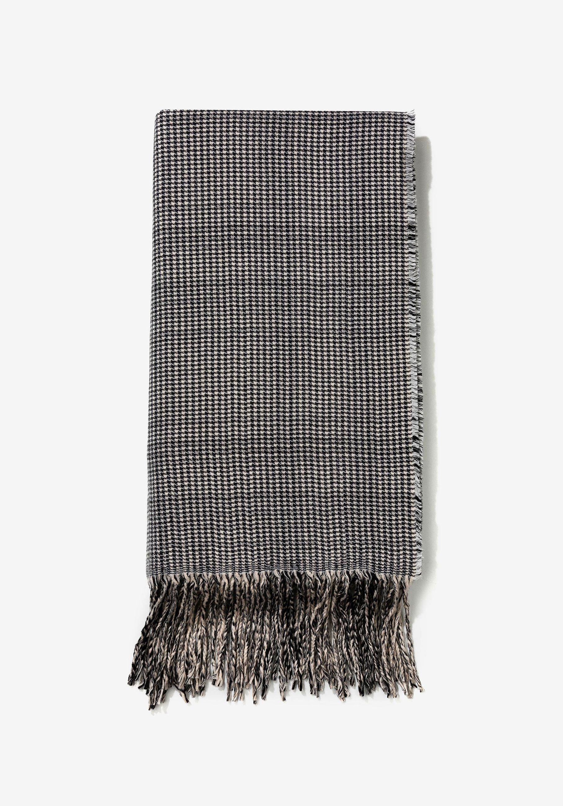 Sciarpa in tessuto misto viscosa double face. Lato 1 fantasia galles, lato 2 micro pied de poule. Bordi con frange.