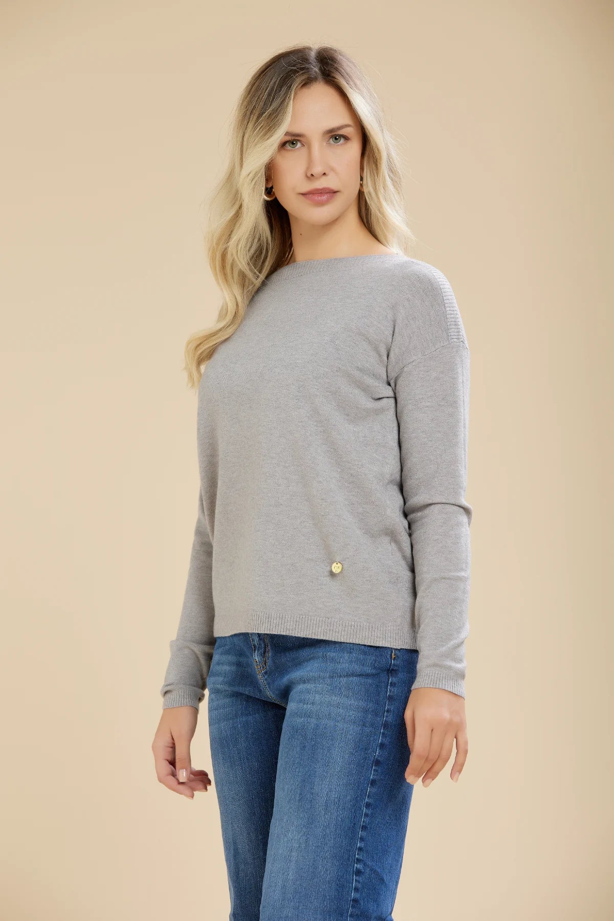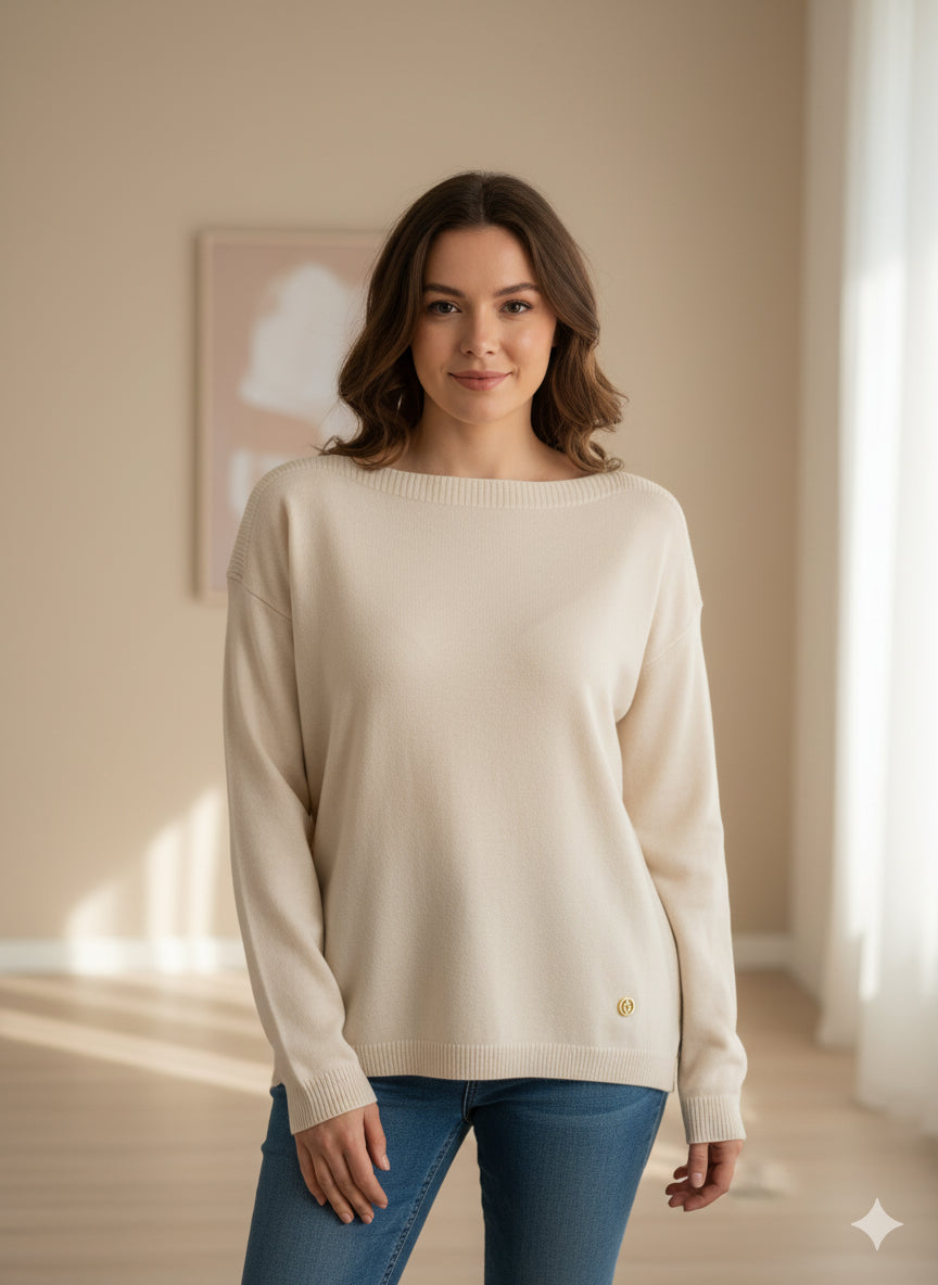 Maglia donna basica in morbido tessuto misto viscosa. Scollo a barca con bordo largo a costine che continuano fino alla spalla, spalla raglan, maniche lunghe. Vestibilità comoda. Taglia in foto I. Composizione tessuto 51% viscosa 28% poliestere 21% nylon.