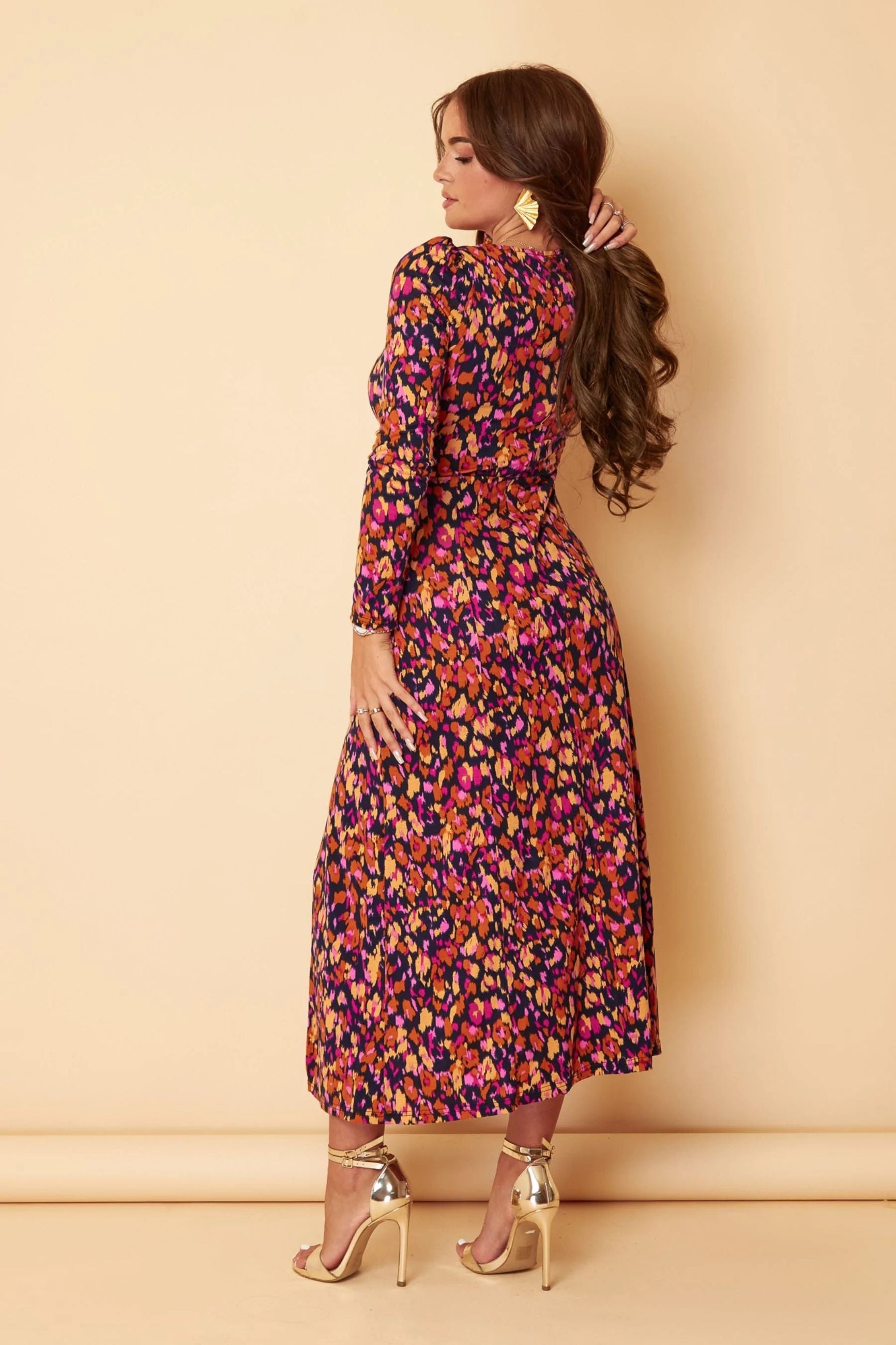 Vestito midi in tessuto maglina elasticizzata. Scollo quadrato morbido, maniche lunghe, chiusura con zip sulla schiena. Fodera in tinta unita. Taglio in vita, gonna longuette sagomata sui fianchi con alto spacco laterale. Taglia in foto 40.