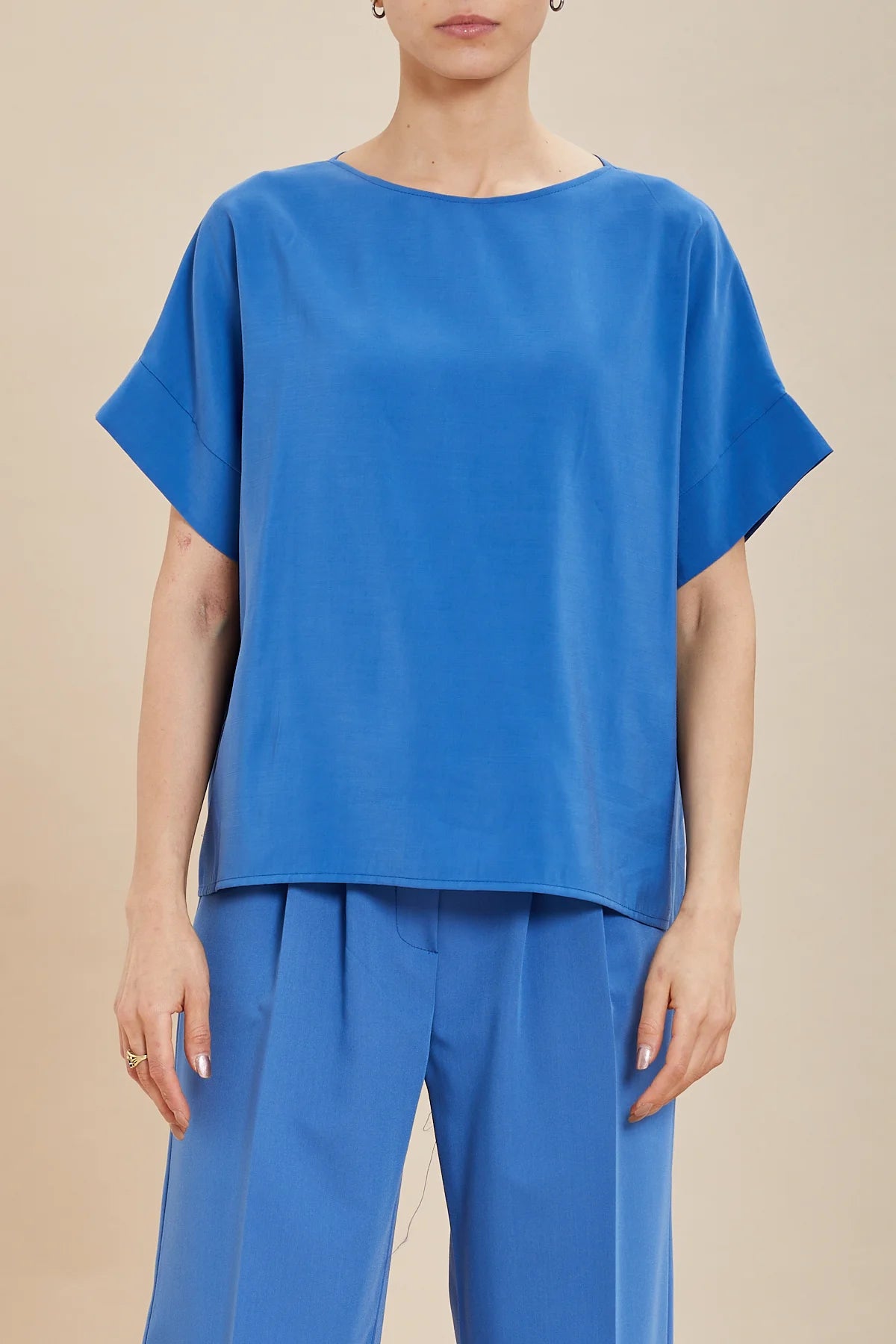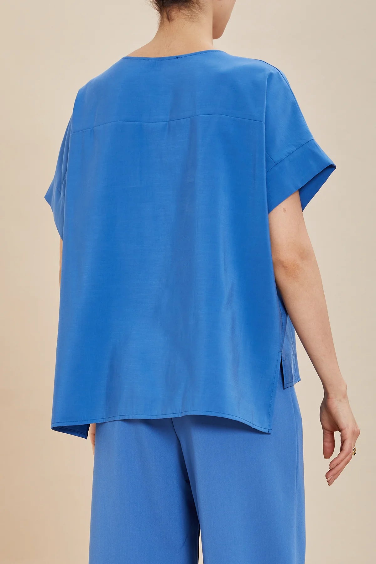 Casacca in tessuto leggero misto viscosa silk touch. Scollo tondo, maniche corte con spalla raglan. Vestibilità ampia, forma quadrata con parte posteriore leggermente più lunga. Crea il completo con il pantalone abbinato . Composizione tessuto 86% viscosa 14% poliestere.
