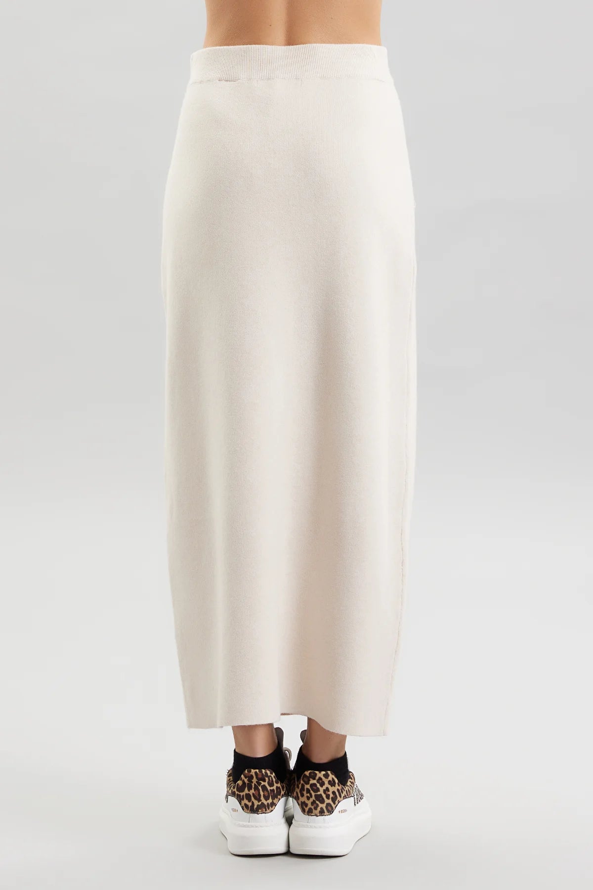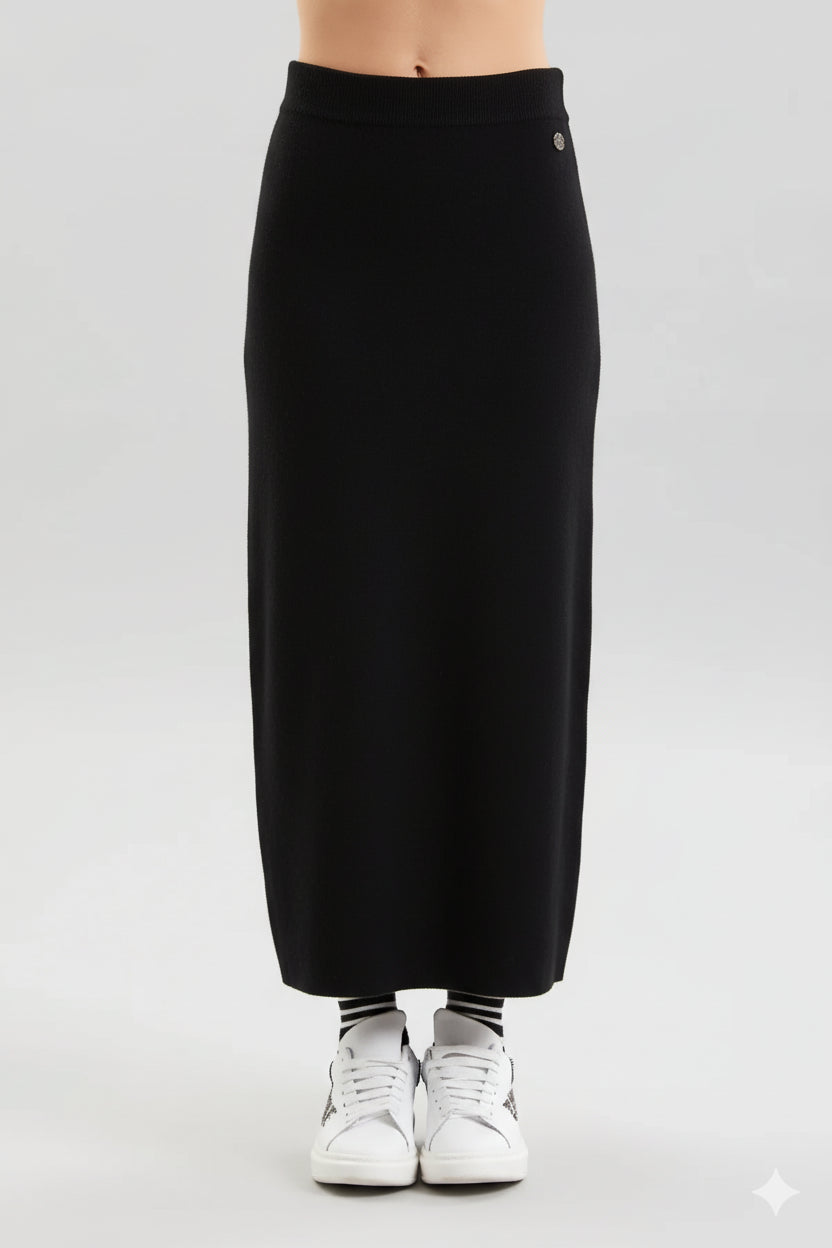Gonna in maglia di viscosa. Vita regolare con elastico, logo brand cucito sul lato. Vestibilità aderente. Crea il completo con la giacca abbinata. Composizione tessuto 51% viscosa, 28% poliestere, 21% nylon.