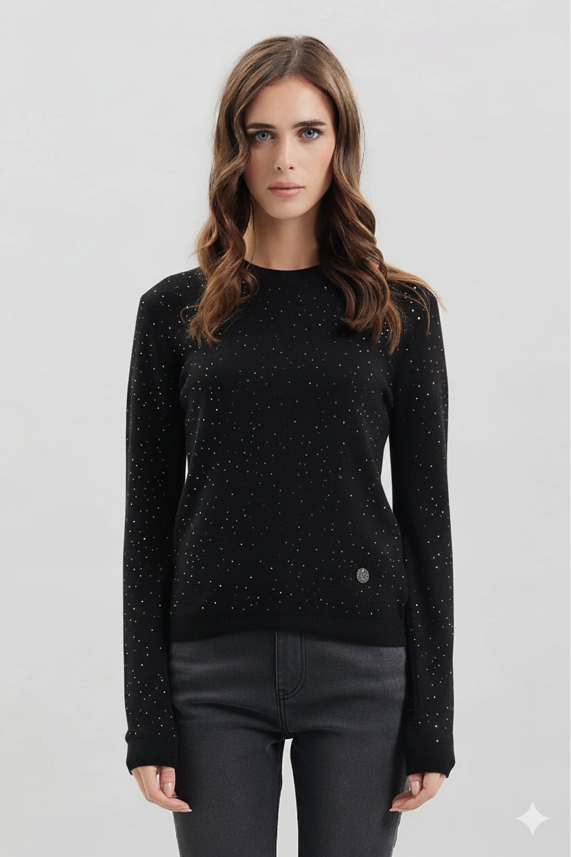 Maglia donna basic in morbido tessuto misto viscosa con micro paillettes applicate. Girocollo regolare, vestibilità slim. Bordi rifiniti a canaletti, logo brand cucito sul fondo. Composizione tessuto 51% viscosa, 28% poliestere, 21% nylon.