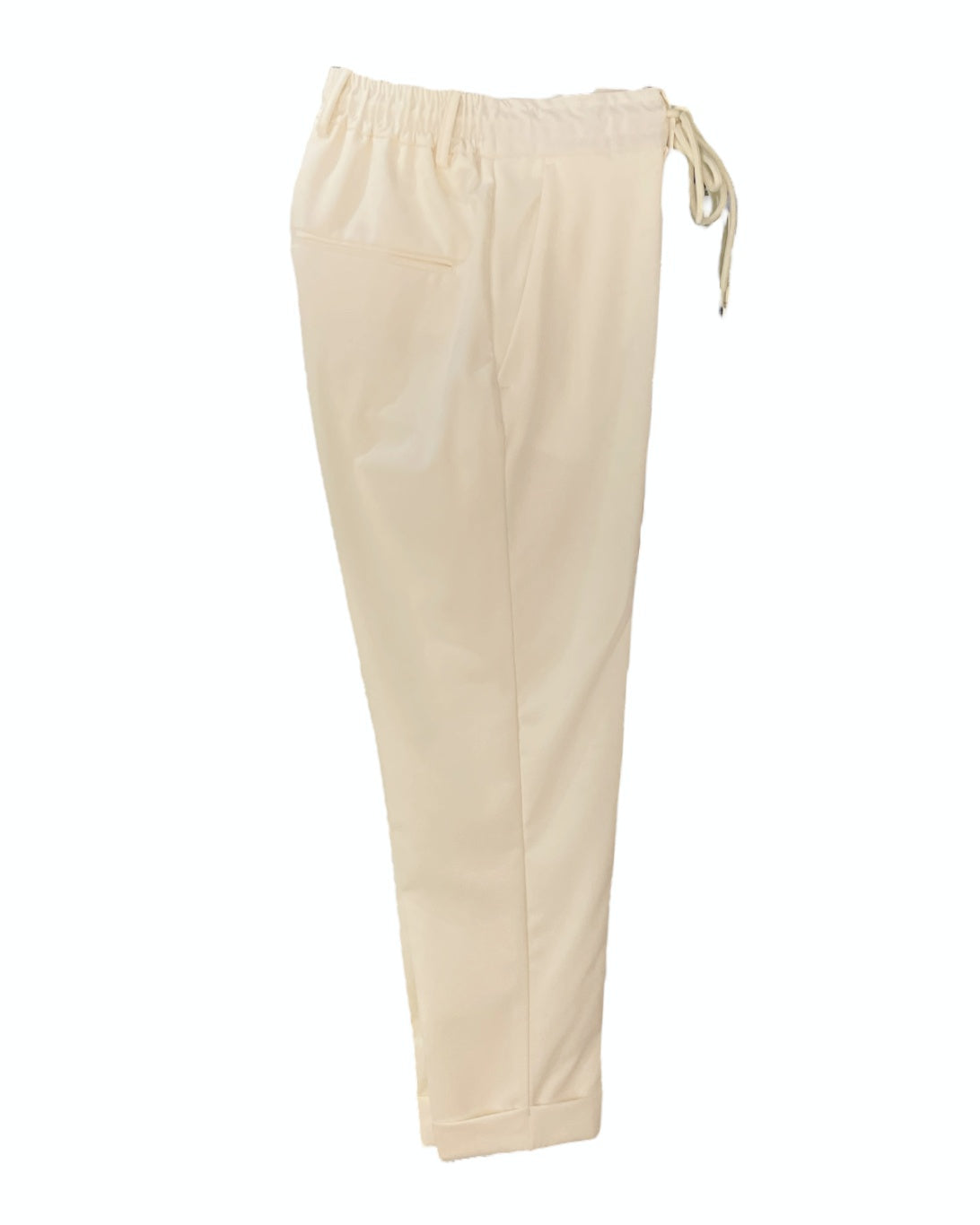 Pantalone modello pantalaccio in tessuto leggero misto viscosa. Vita regolare con elastico sulla schiena e cinturino fisso sul davanti con coulisse in tessuto e chiusura con zip e bottone. Tasche a filo laterali, tasche a filetto posteriori. Gamba con piega stirata, vestibilità slim e fondo stretto con piega con risvolto. Lunghezza capri. Composizione tessuto 74% poliestere 20% viscosa 6% elastan.