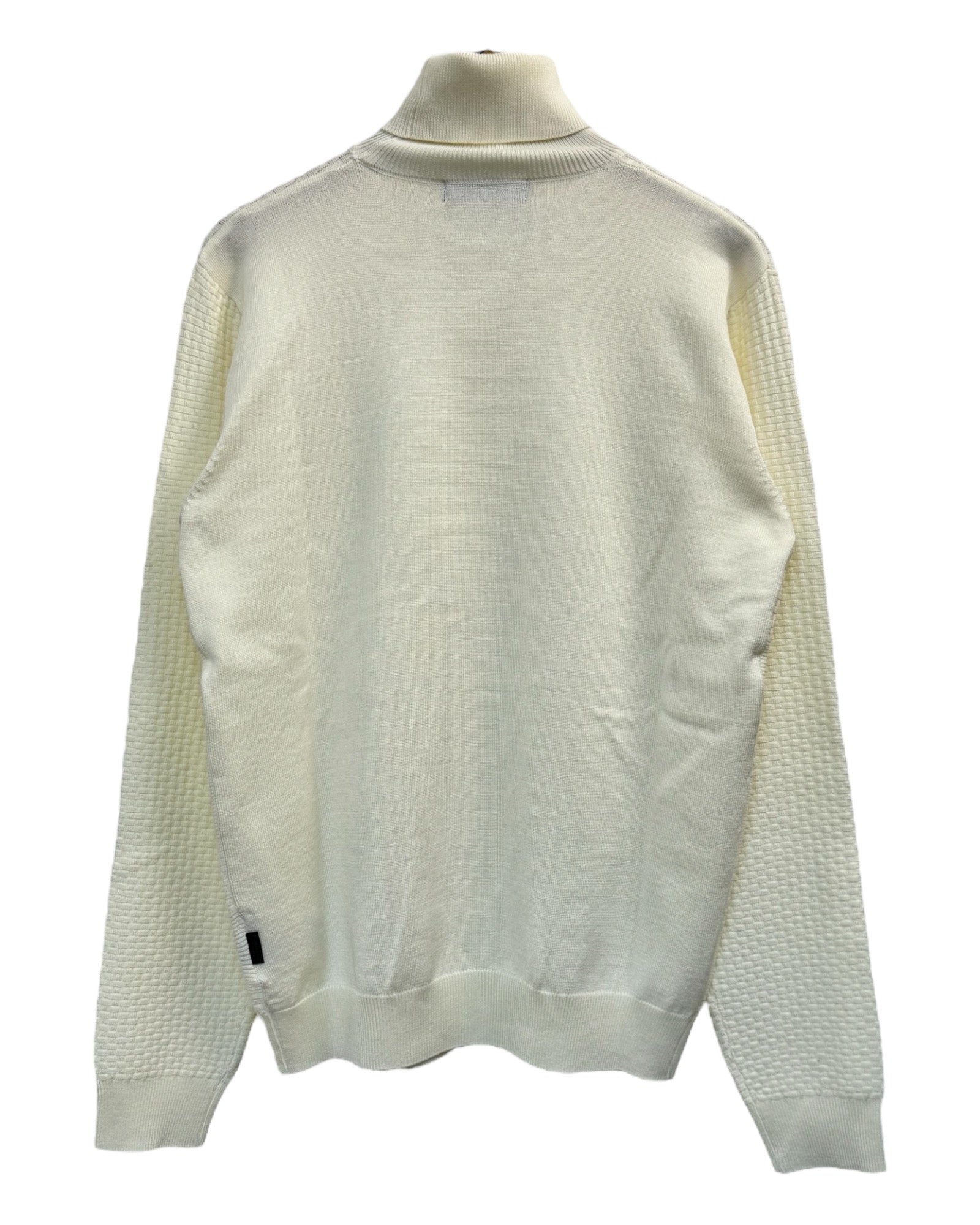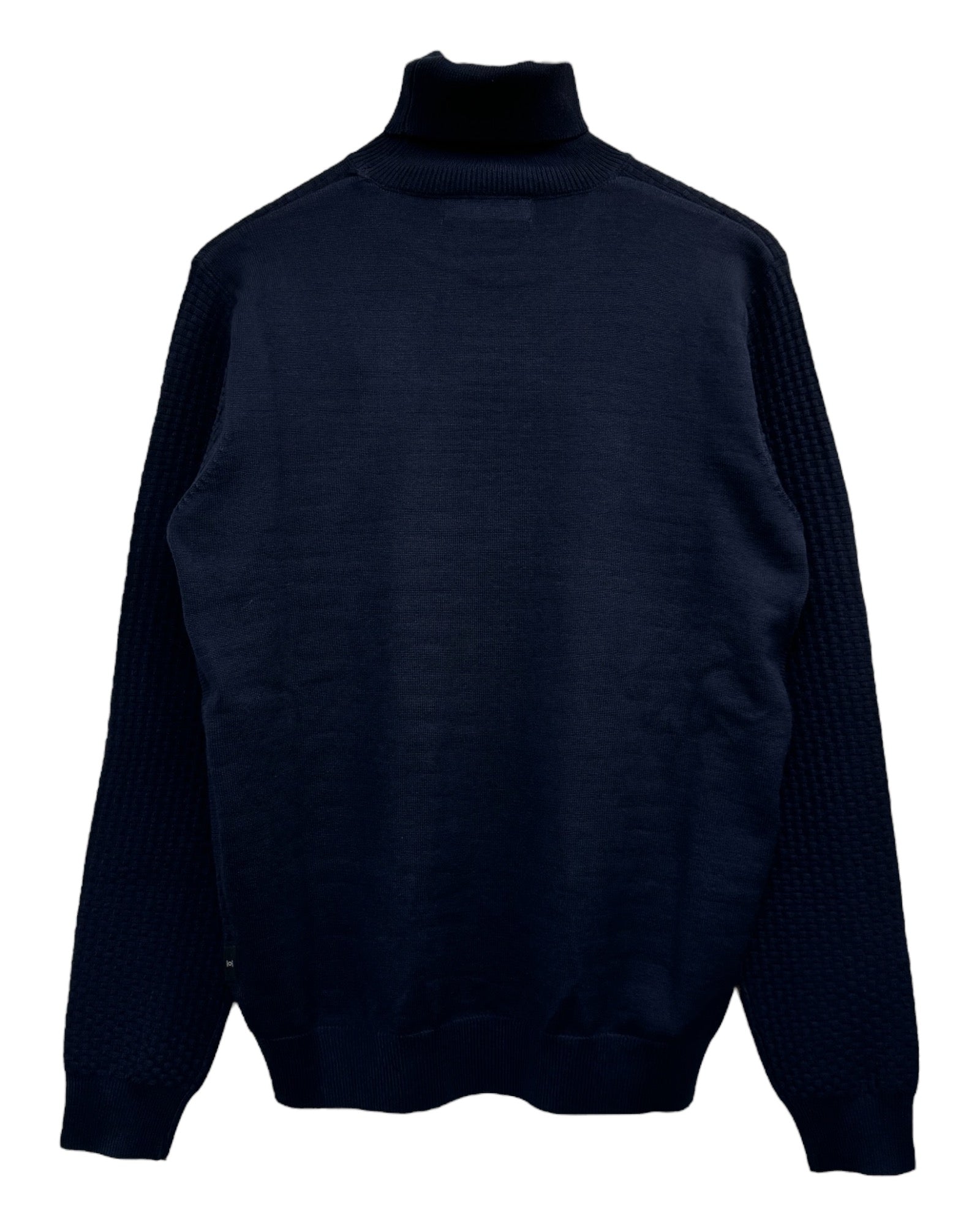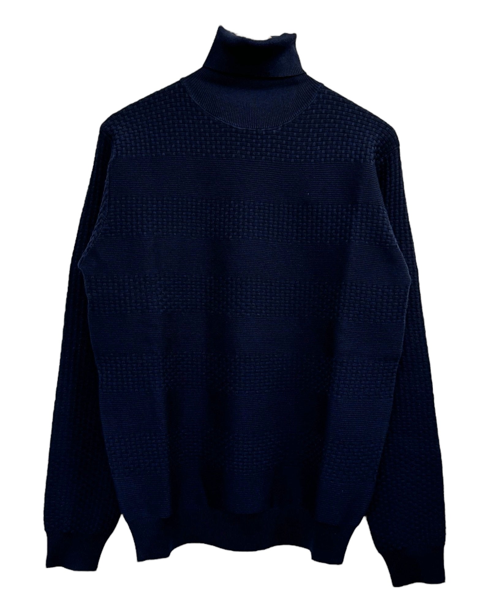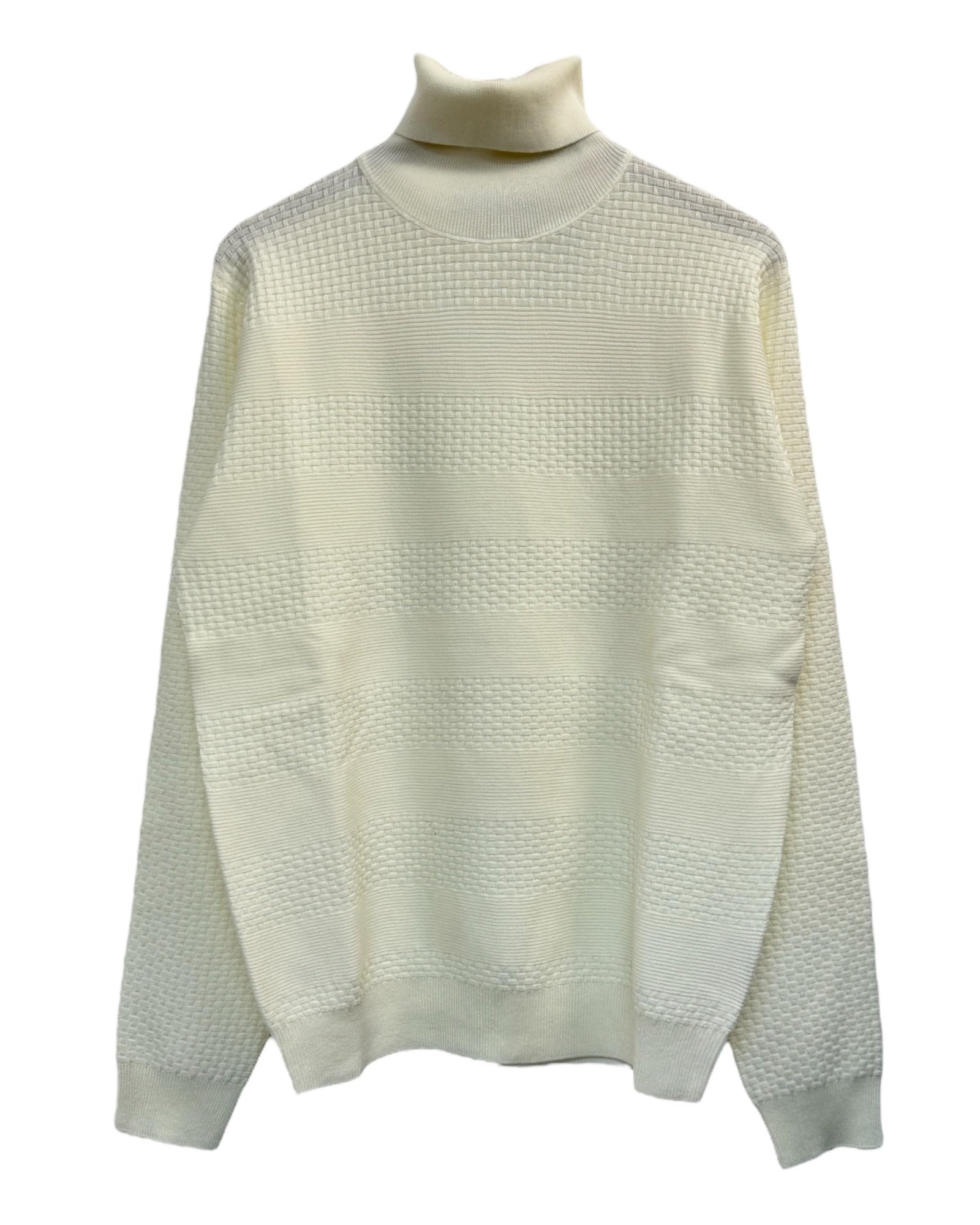 Turtleneck sweater in viscose blend "jersey tech" fabric. High neck, cuffs and bottom finished with channels. Double workmanship on the front, with thin stripes and woven effect, sleeves worked with woven effect, smooth back. Regular fit. Fabric composition 70% viscose 30% nylon.