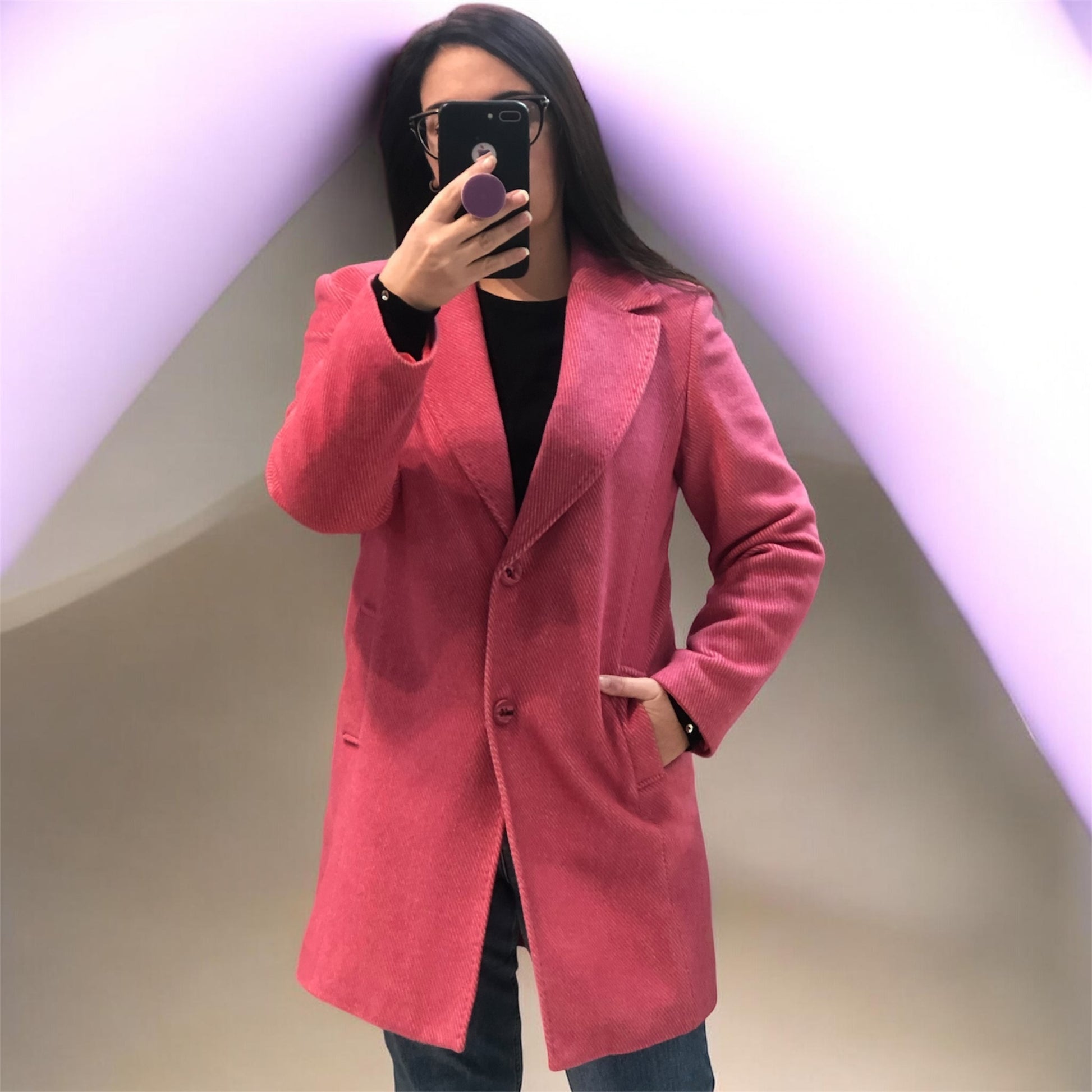 Cappottino in tessuto morbido misto lana. Tessuto lavorato a zig-zg. Collo con revers ampi, bordi impunturati. Chiusura centrale a due bottoni. Tasche laterali con pattina. Composizione tessuto 50% acrilico, 25% poliammide 20% lana 5% elastan.