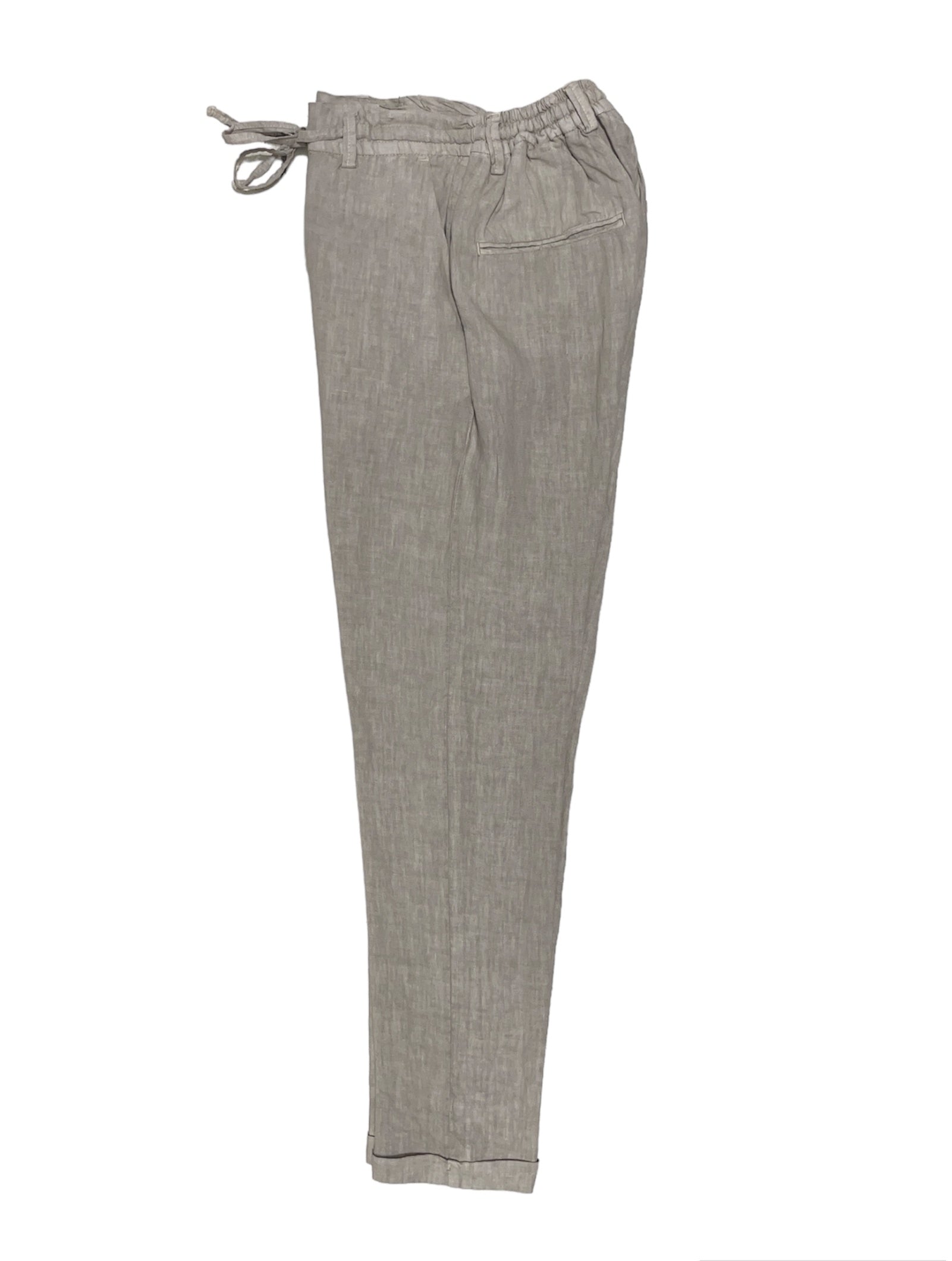 Pantalaccio in tessuto 100% lino lavato. Vita regolare con cinturino fisso sul davanti ed elastico sulla schiena, coulisse per regolare la vestibilità e chiusura con zip e bottone. Tasche a filo laterali e taschino posteriore. Gamba asciutta e fondo stretto con piega con risvolto. Vestibilità slim asciutta.
