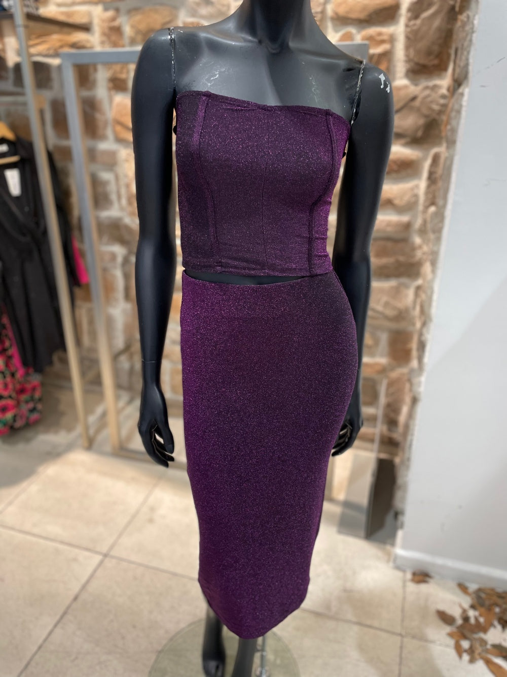 Midi-length skirt in stretch fabric. High waist with internal elastic band. Calf length, central back slit. Tone-on-tone lurex fabric. Size in photo S. Fabric composition 62% nylon, 28% metallic fibers, 10% elastane. Create the outfit with the matching top.