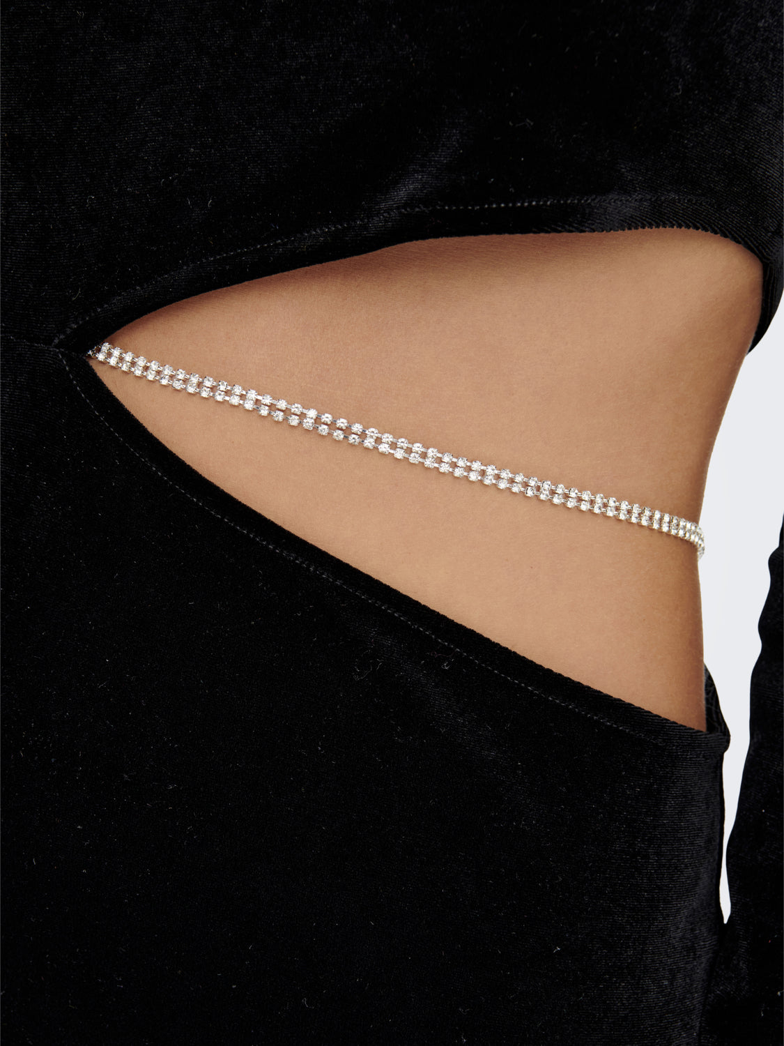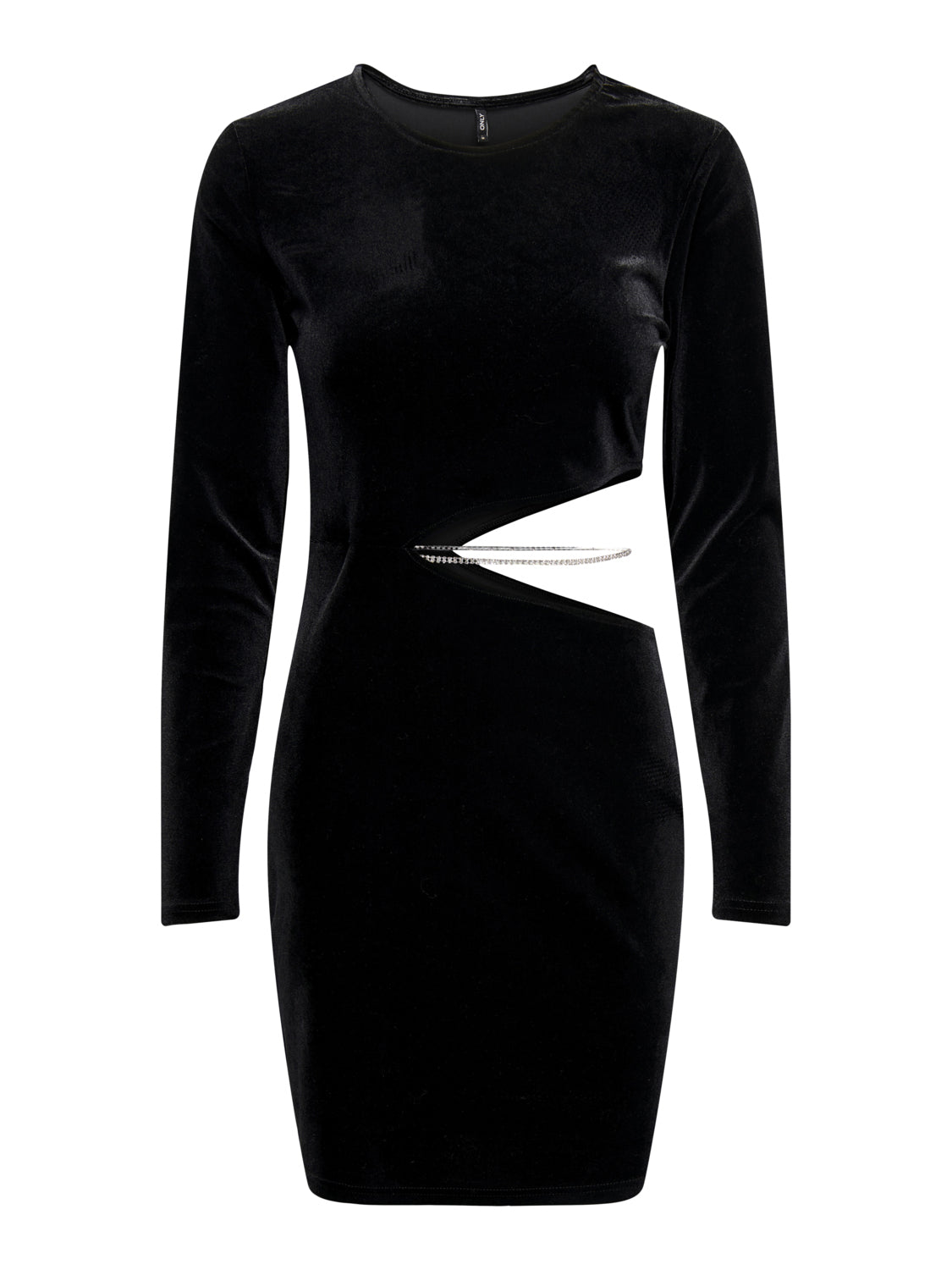 Vestito mini in morbido tessuto velluto liscio. Girocollo regolare con bordo liscio. Maniche lunghe. Vestibilità aderente, gonna corta. Ampia apertura laterale con dettaglio gioiello rimovibile. Taglia in foto S. Composizione tessuto 95% poliestere 5% elastan.