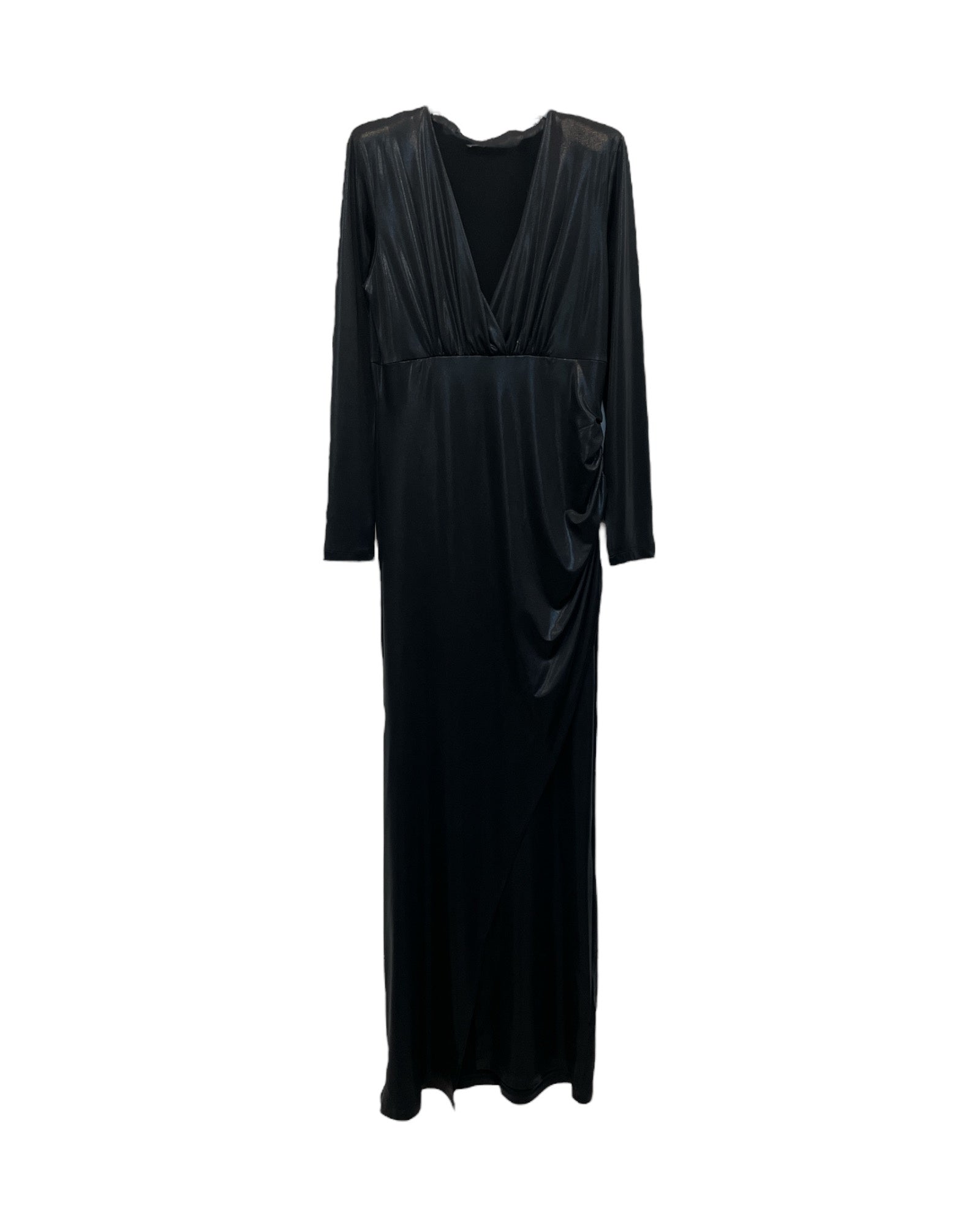 Elegant long dress in stretch jersey coated fabric. Crossover V-neck, draped on the side. Long sleeves. Long skirt with side wrap slit. Tight fit. Size in photo S.