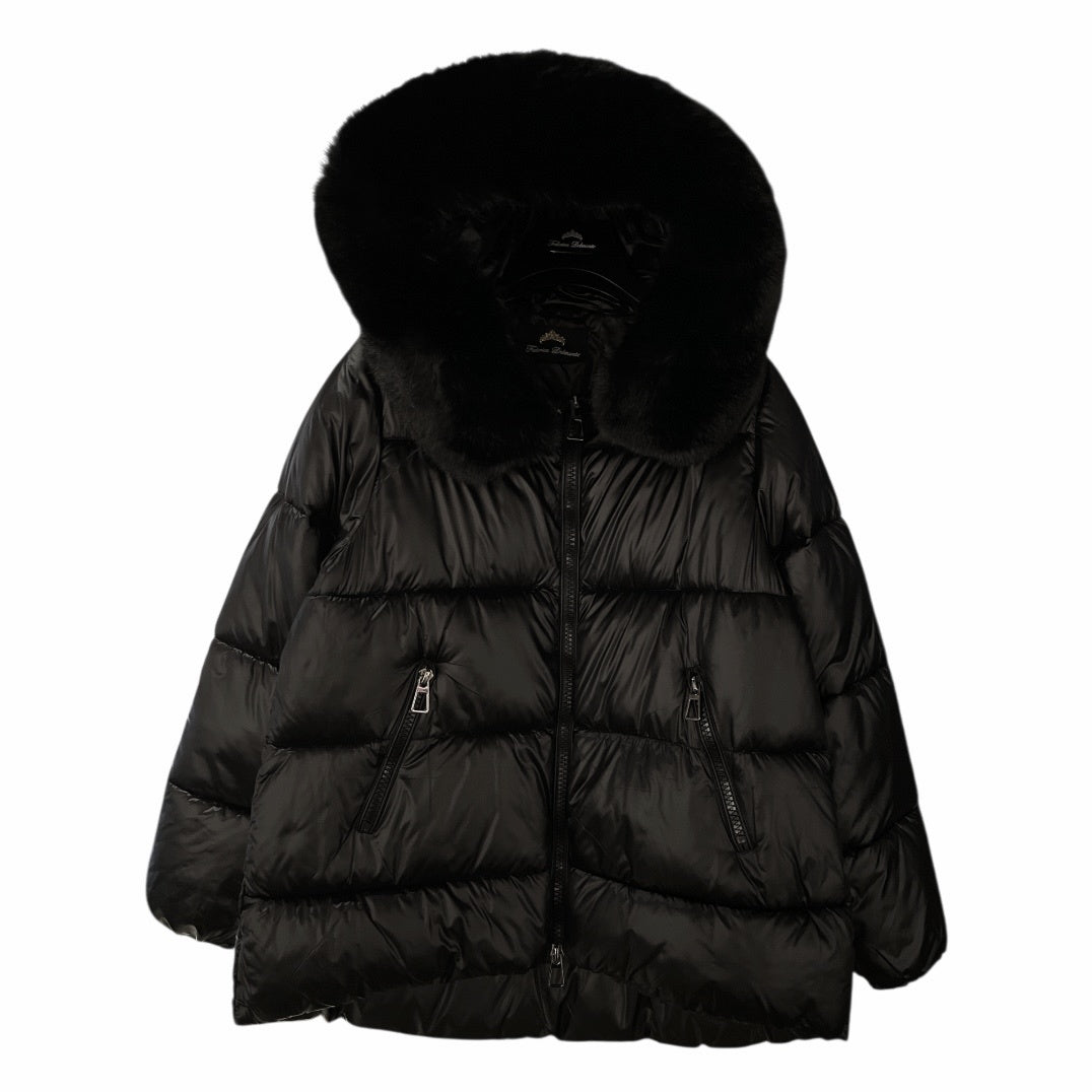 Piumino donna in tessuto tecnico lucido. Ampio cappuccio con bordo in eco-pelliccia. Vestibilità a cappetta. Chiusura con zip, tasche laterali con zip. Fondo stondato più lungo dietro. Vestibilità regolare.