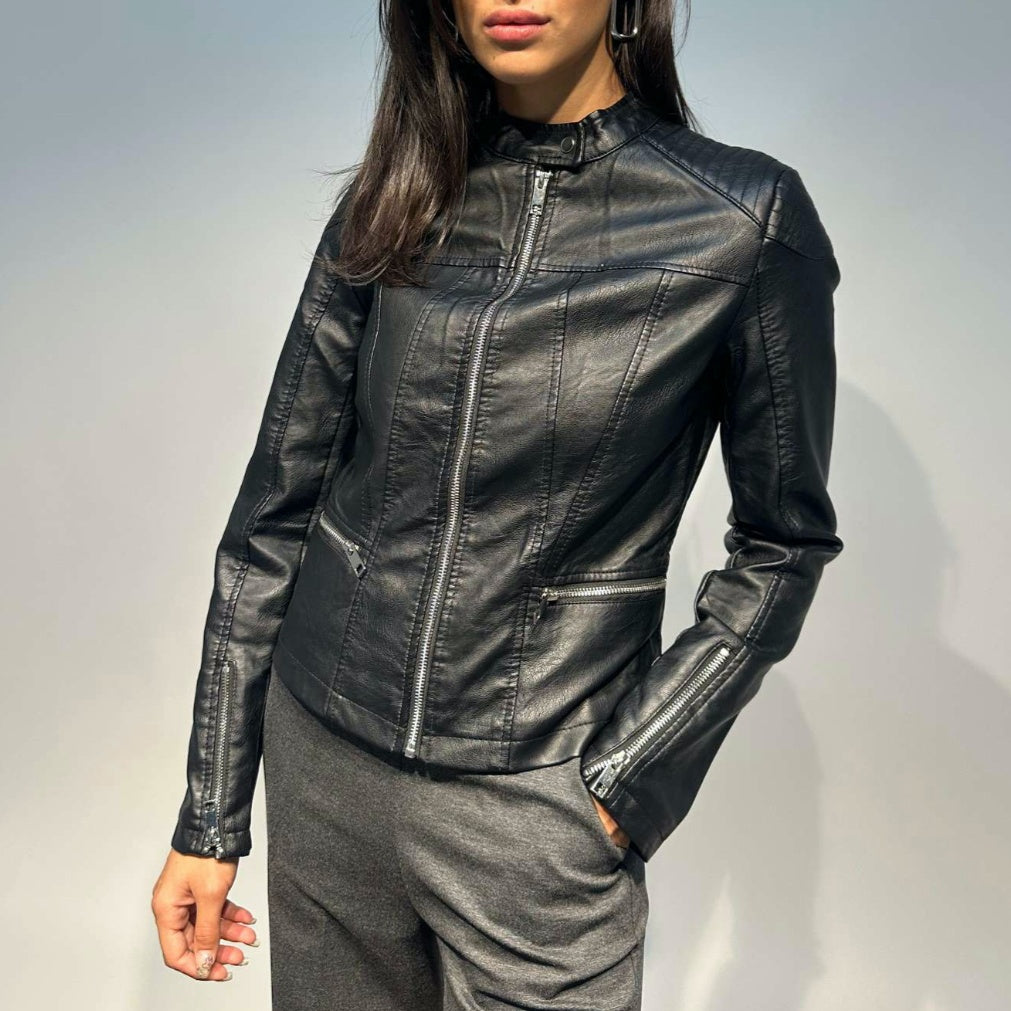 Giubbino ecopelle donna modello biker. Collo pistagna con bottone automatico e chiusura con zip. Dettaglio zip su entrambi i lati e sui polsi. Vestibilità molto aderente, consigliamo di acquistare una taglia in più. Composizione tessuto 100% poliuretano.