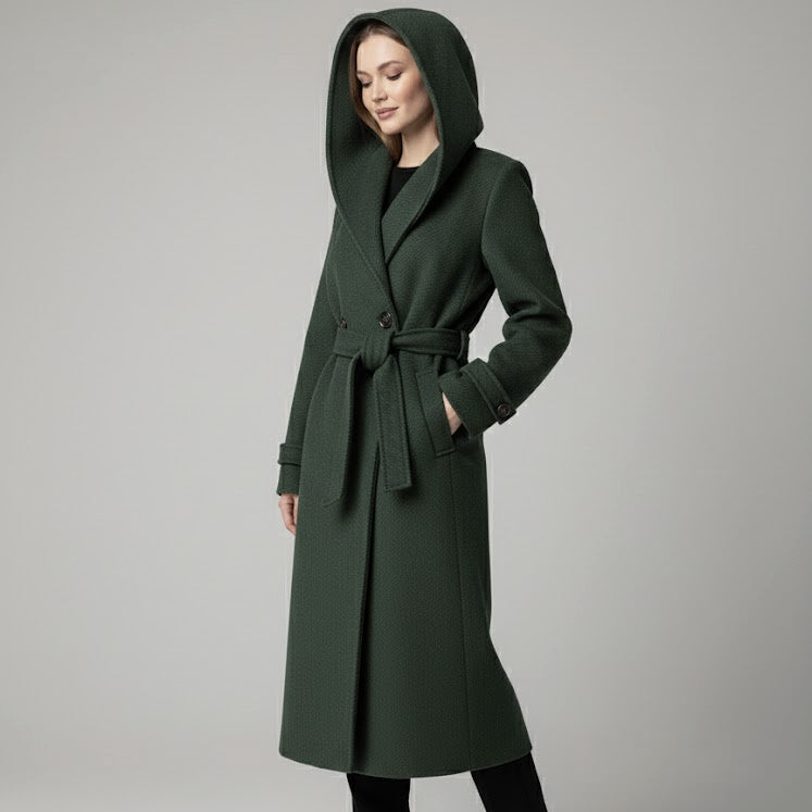 Cappotto donna lungo in panno lavorato. Cappuccio molto ampio, chiusura centrale con doppio bottone effetto doppio petto e cintura in tessuto, tasche laterali. Capo foderato. Tessuto lavorato in diagonale. Vestibilità regolare. Composizione tessuto 100% poliestere.
