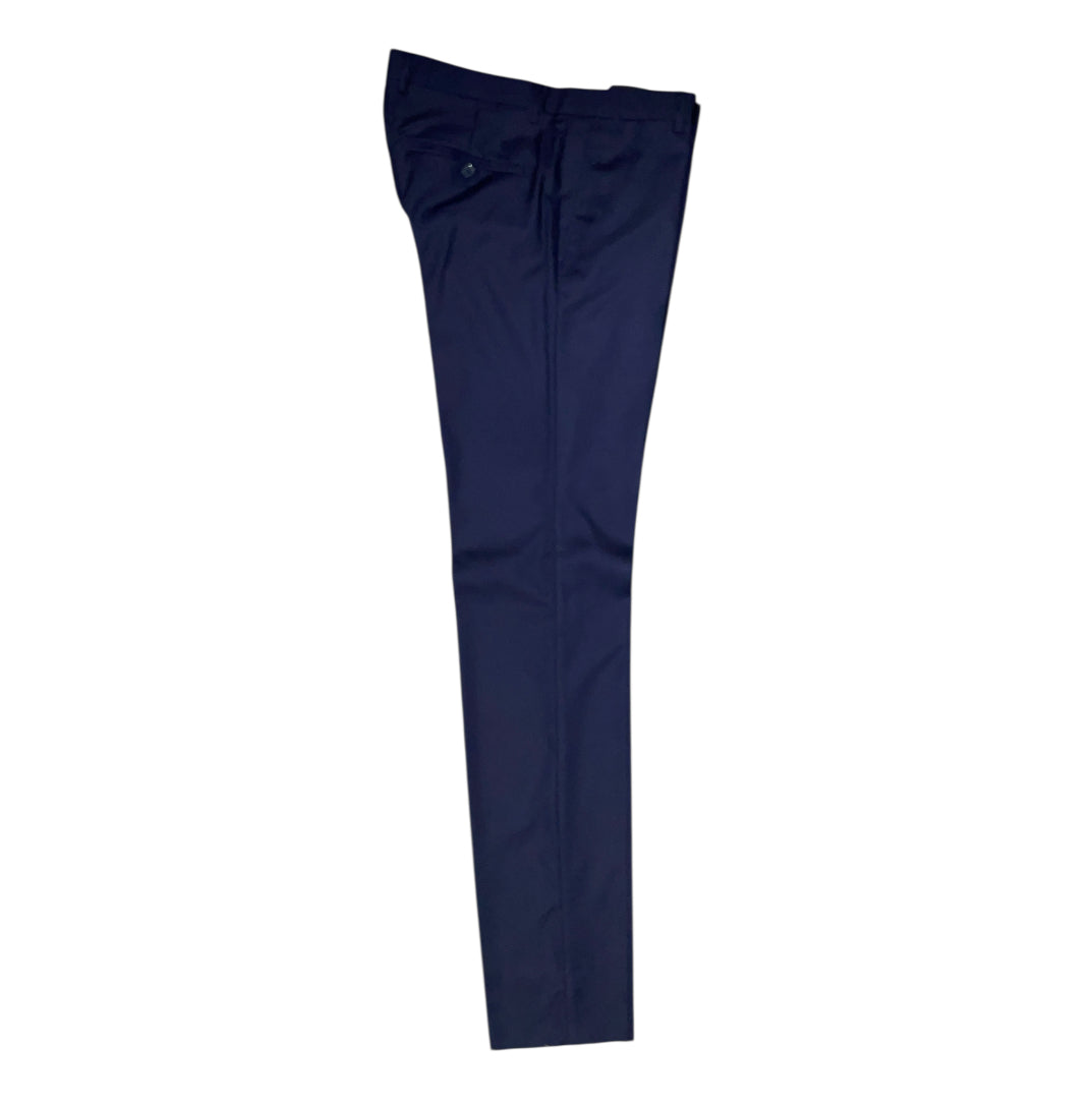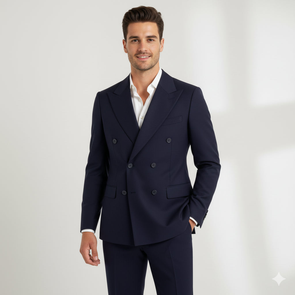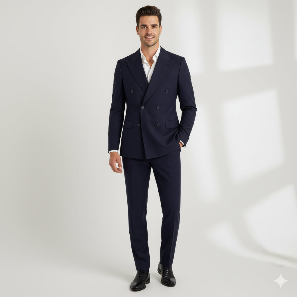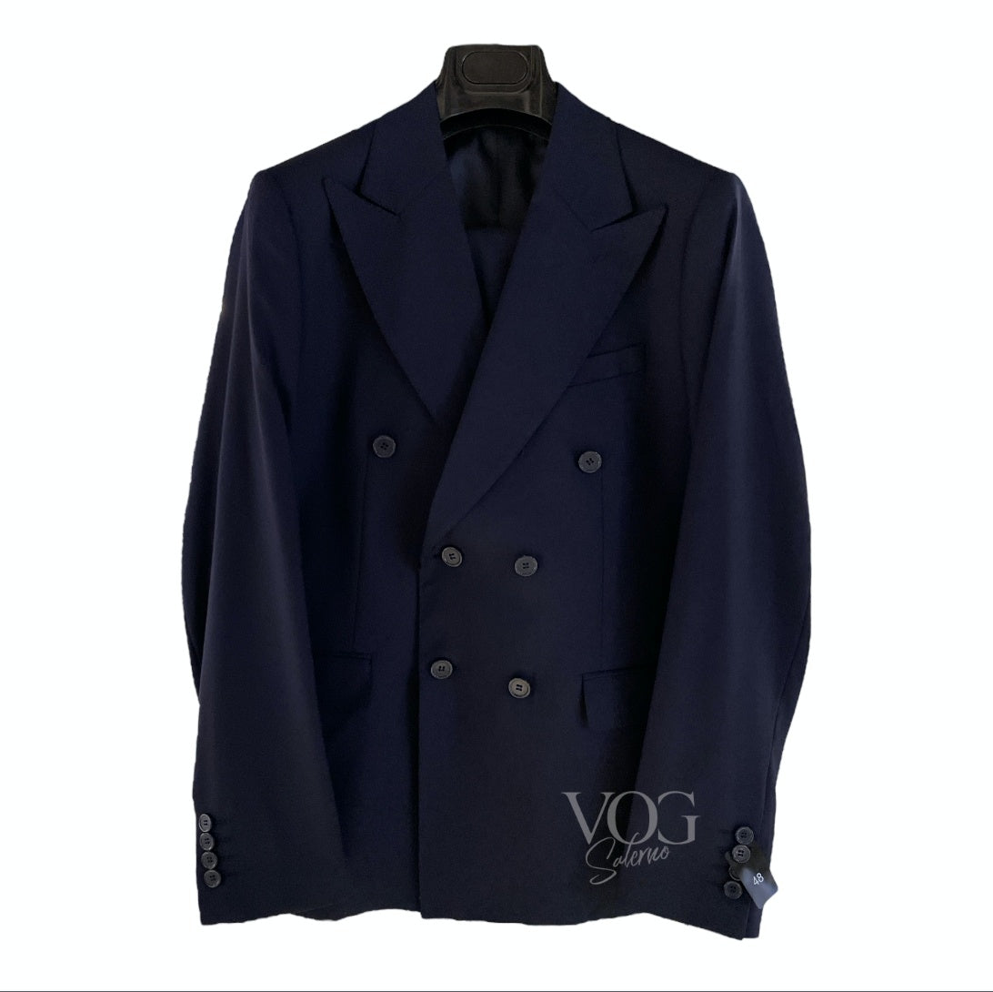 Abito basico in tessuto poliviscosa. Collo con revers a lancia, chiusura doppio petto con bottoni in tinta, tasche applicate. Capo foderato. Pantalone vita regolare, cinturino fisso con passanti, chiusura con zip, pattina con bottone e gancio interno. Tasche a filo laterali e taschini posteriori con bottone. Gamba e fondo slim, piega non rifinita. Composizione tessuto 80% poliestere 20% viscosa.