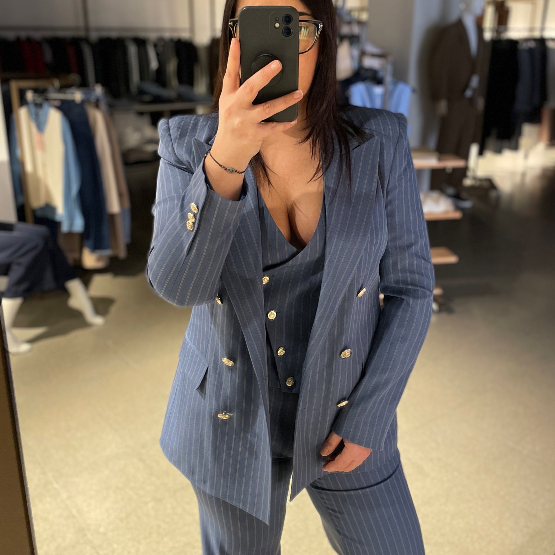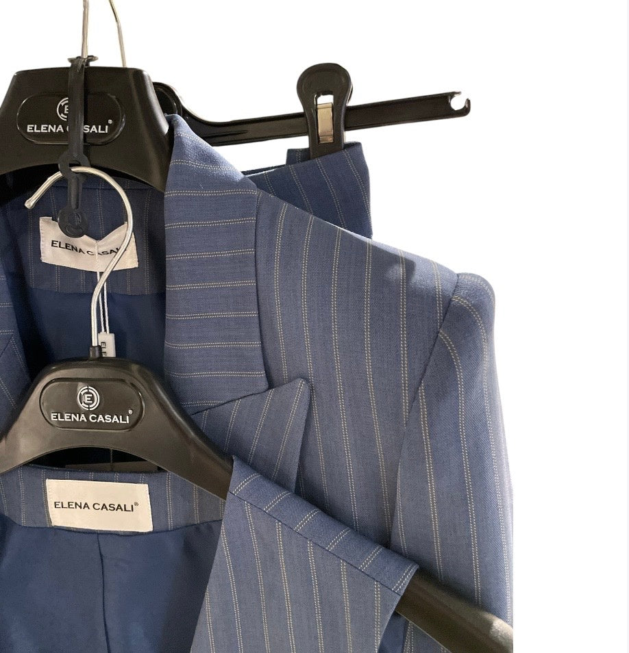 Tailleur donna tre pezzi in tessuto tecnico motivo gessato riga doppia. Giacca lunga con spalline ampie, revers a lancia, chiusura doppio petto con bottoni in stile militare, applicati anche ai polsi. Gilet corto con abbottonatura laterale, bottoni dorati. Pantalone vita medio/alta, chiusura con bottone e zip, tasche a filo laterali. Gamba e fondo dritti. Vestibilità regolare, taglia in foto 44.