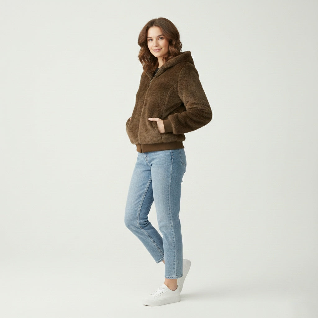 Eco pelliccia modello felpa bomber. Cappuccio comodo, chiusura con zip in tinta, tasche laterali. Polsi e fondo in tessuto elastico tipico del modello bomber. Vestibilità regolare.