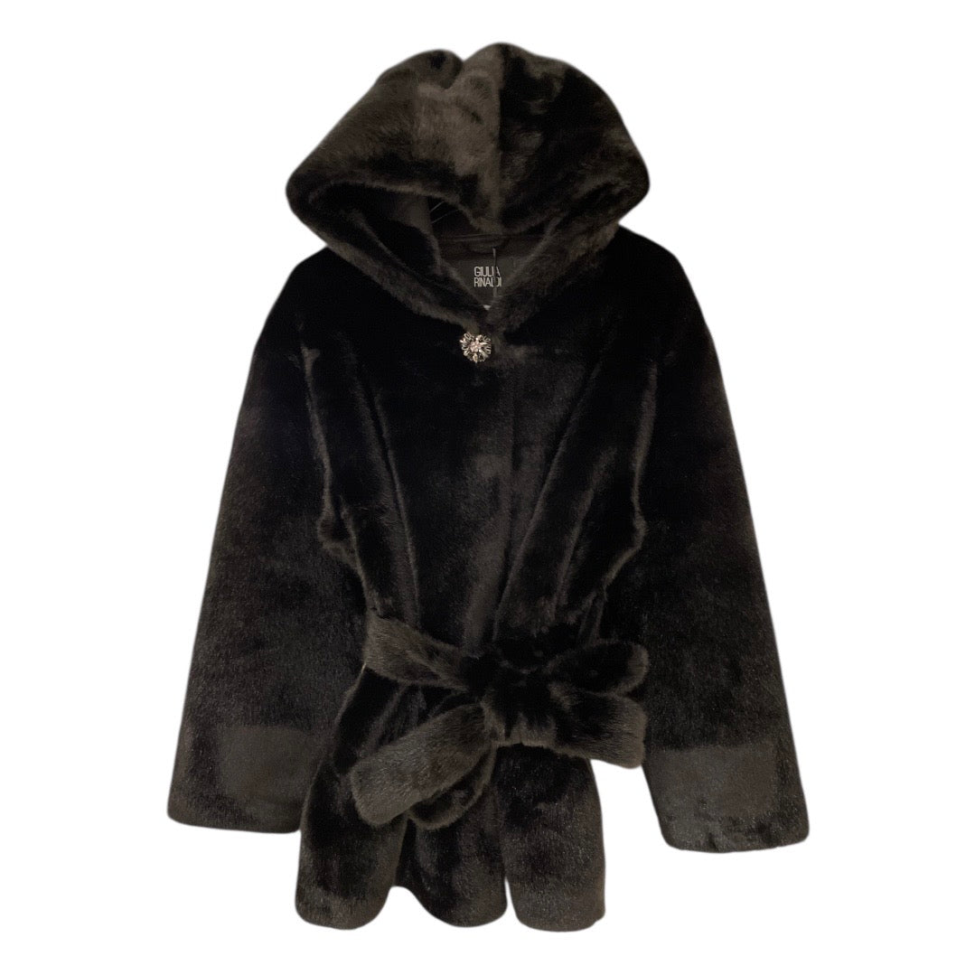 Pelliccia ecologica in tessuto ultra soft. Ampio cappuccio, chiusura al collo con bottone gioiello e bottoni a scomparsa interni, cintura in vita. Tasche laterali, capo foderato. Veste dalla XS ampia alla M.