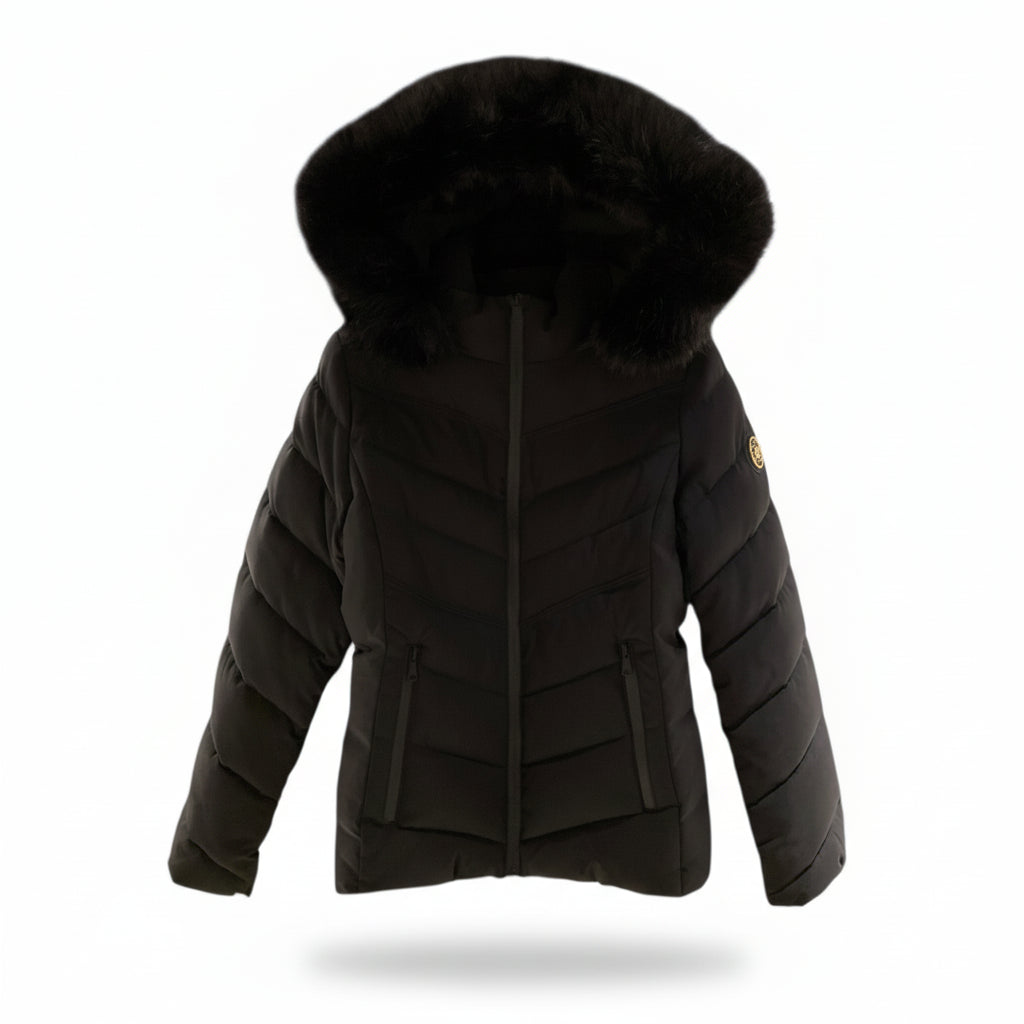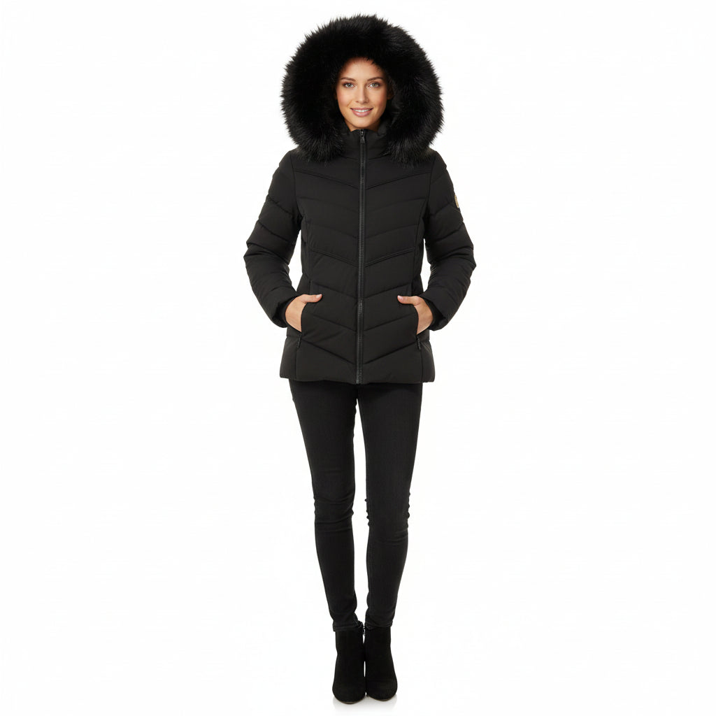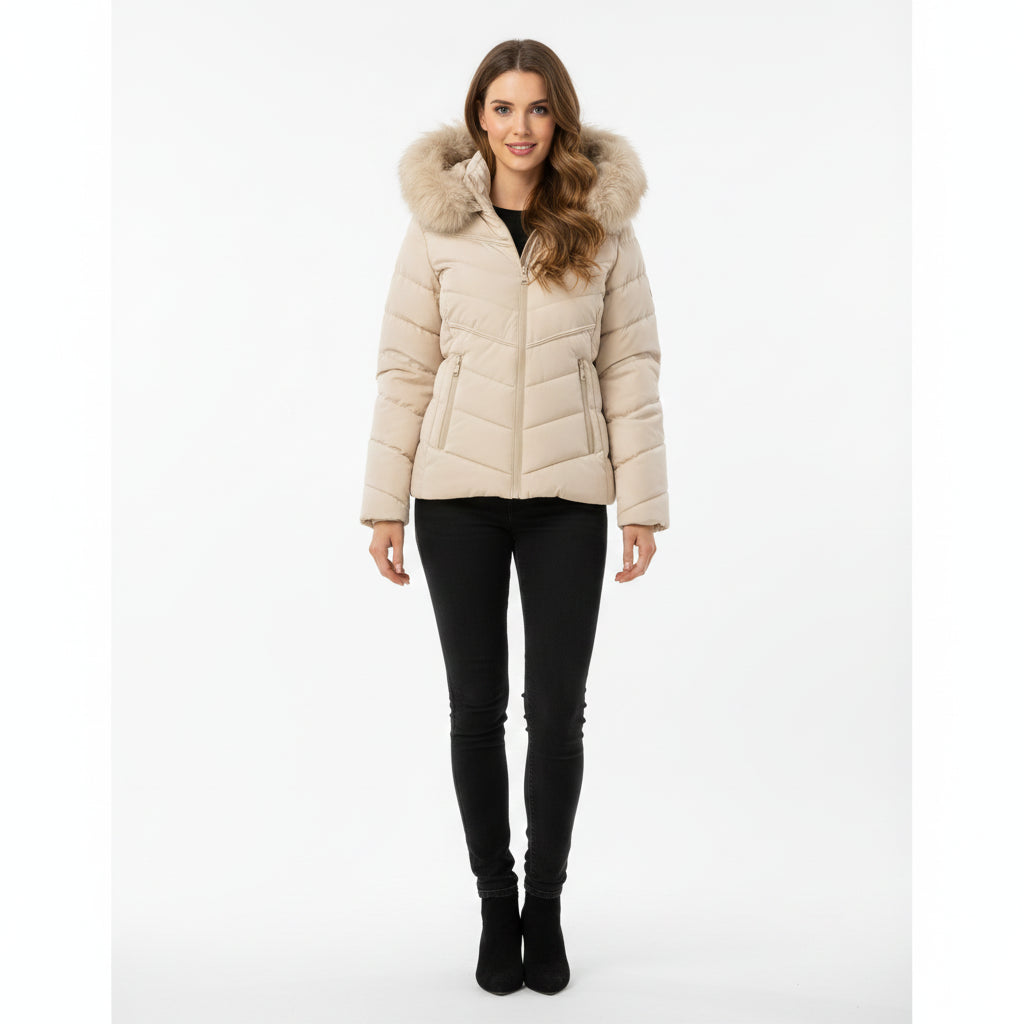 Piumino donna corto in tessuto tecnico effetto mat. Cappuccio con bordo di pelliccia folto. Chiusura con zip centrale in tinta, tessuto lavorato diagonale. Vestibilità sagomata.
