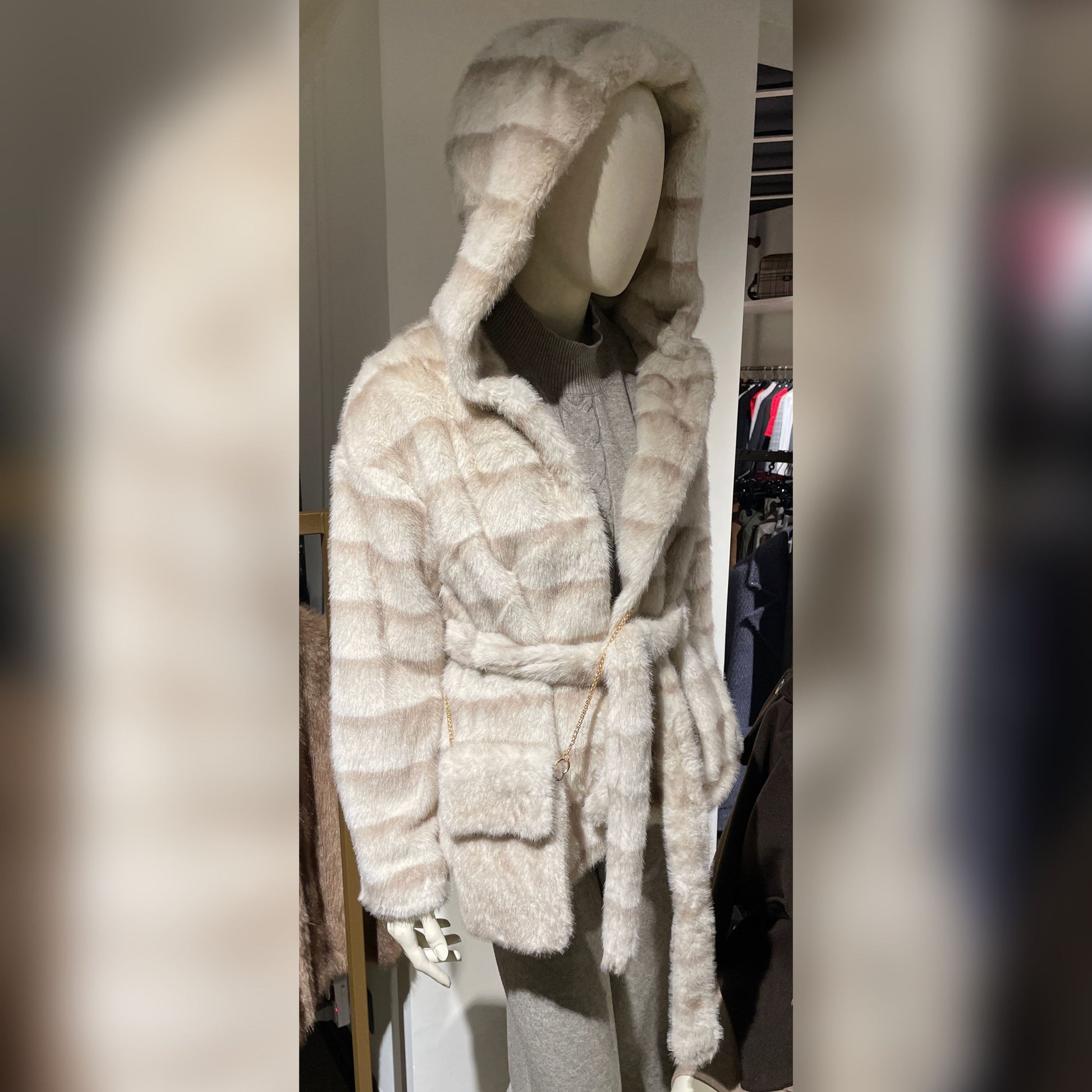 Pelliccia ecologica corta in tessuto effetto visone. Ampio cappuccio, chiusura con bottoni automatici a scomparsa. Fodera in tinta, tasche laterali. Vestibilità comoda, veste dalla XS ampia alla L giusta.
