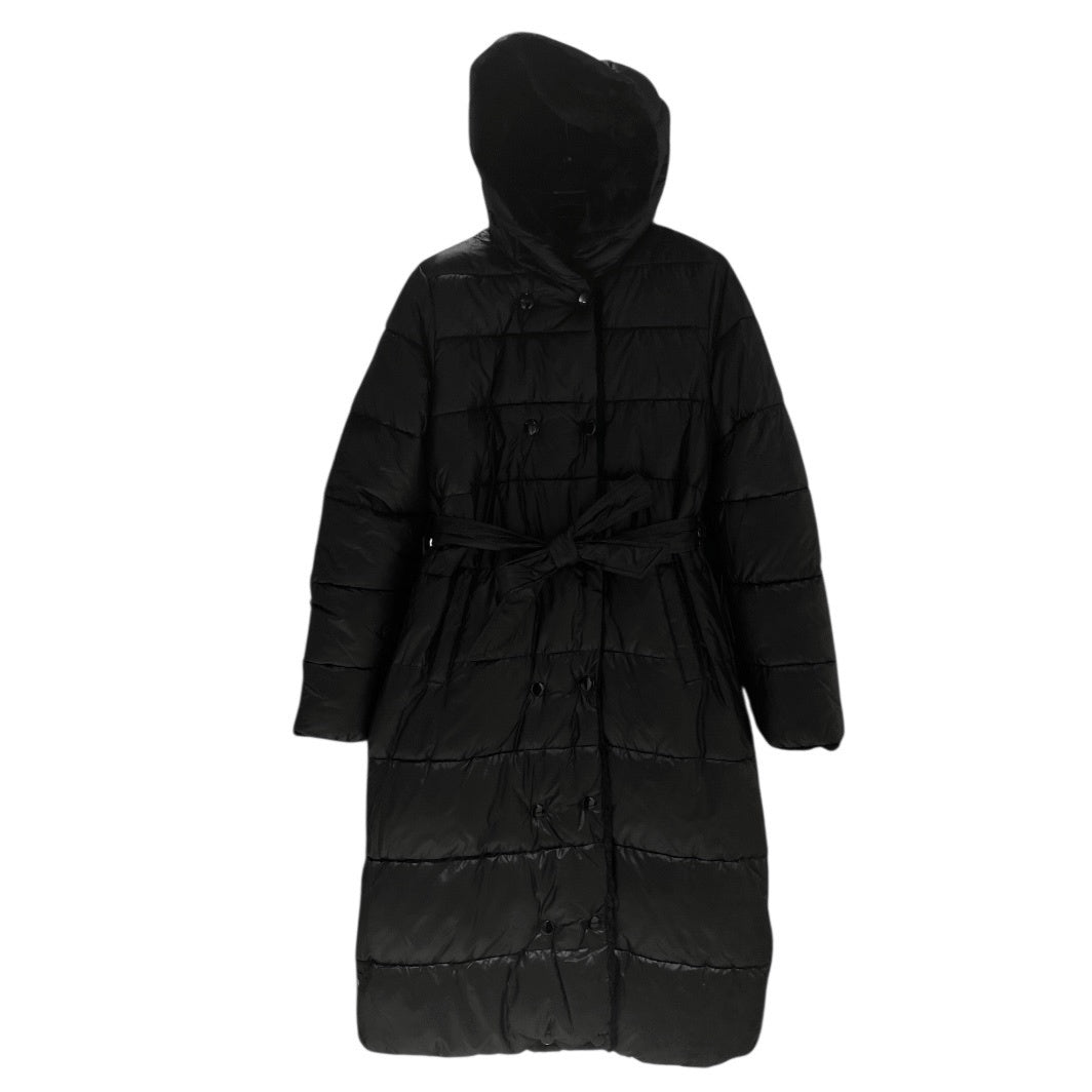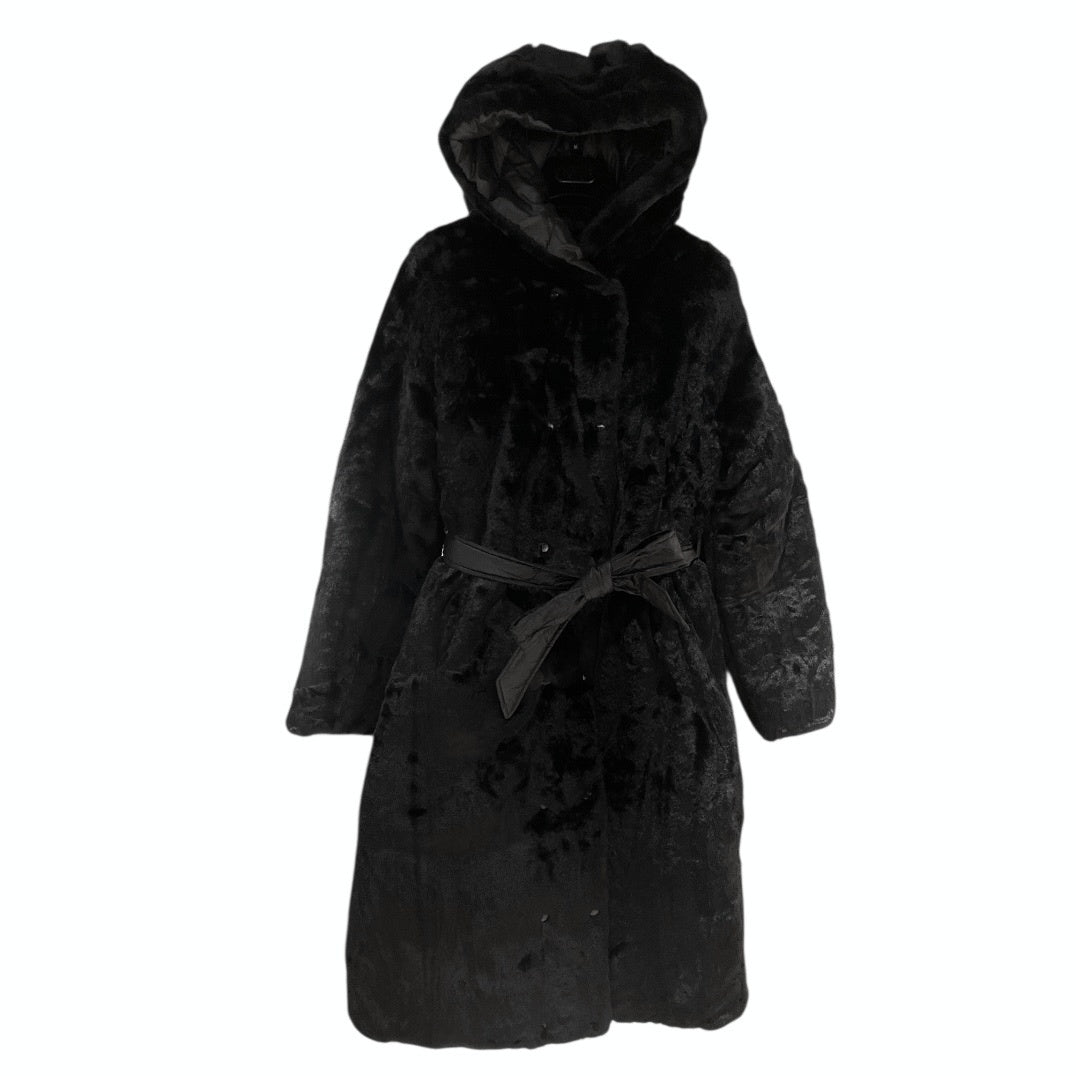 Piumino donna lungo reversibile doppio petto e doppio tessuto. Parte esterna in piumino lavorato, parte interna in ecopelliccia tipo astrakan. Chiusura con zip e coperta da pattina larga con bottoni automatici doppio petto, fusciacca in tessuto tecnico in vita. Lunghezza al polpaccio.