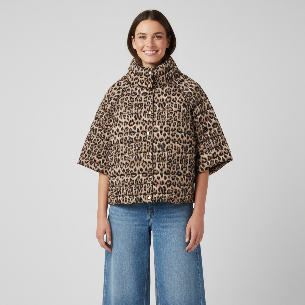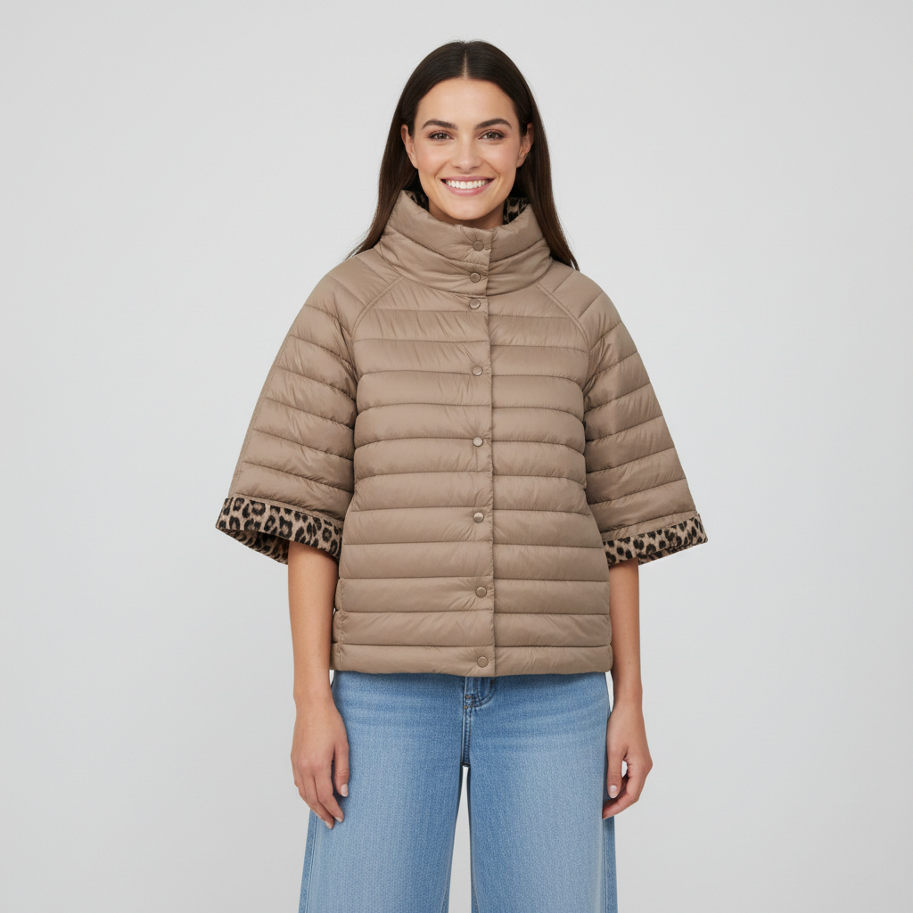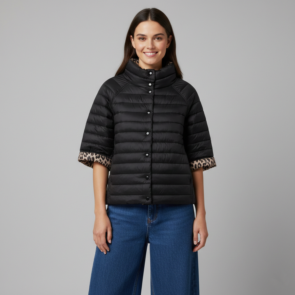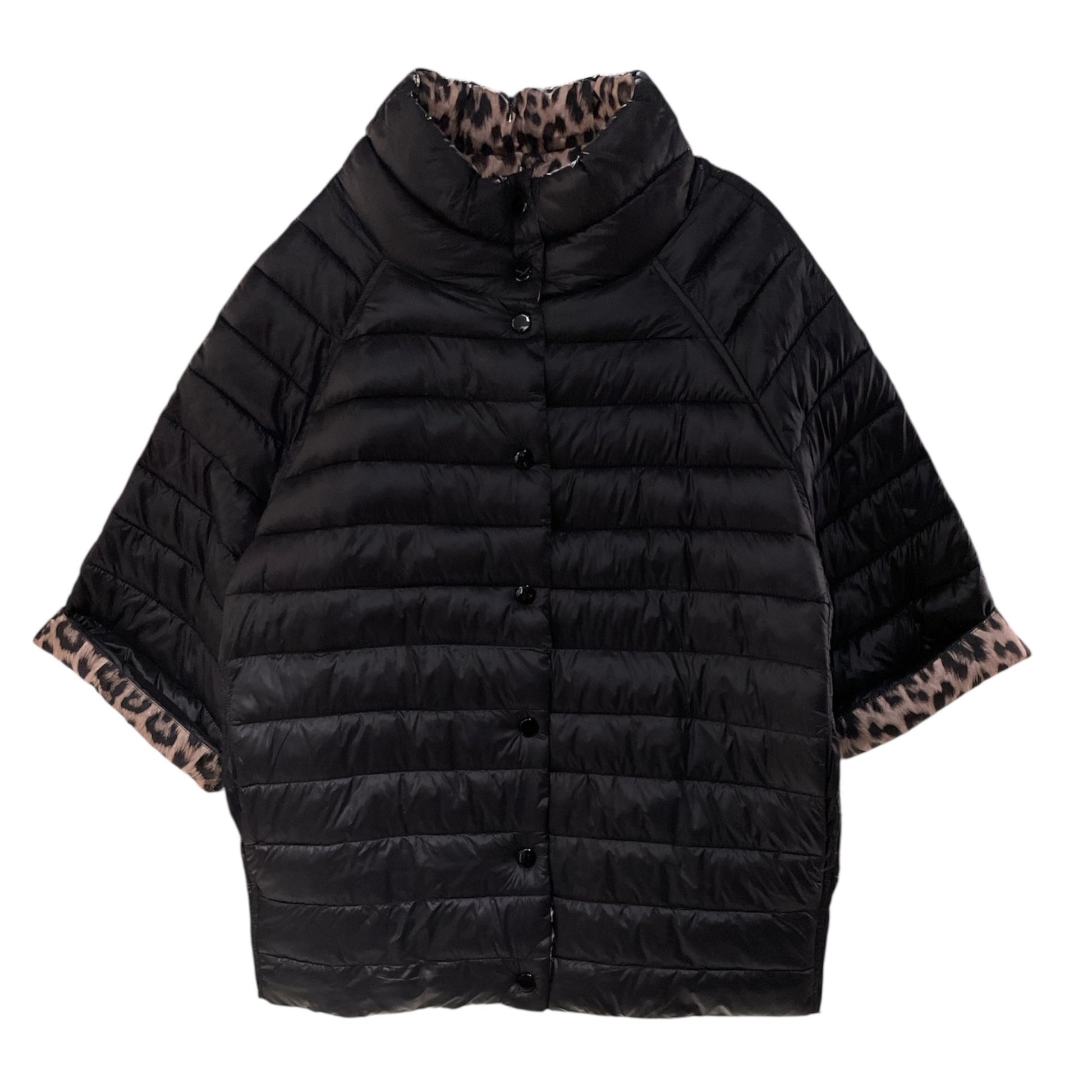 Giubbino donna 100% grammi modello cappetta double face. Collo pistagna, chiusura con bottoni automatici, tasche laterali. Maniche a 3/4. Doppio colore, tinta unita da un lato, fantasia maculata dall'altro. Vestibilità comoda. Composizione tessuto esterno 100% nylon, fodera 100% poliammide, imbottitura 100% poliestere.