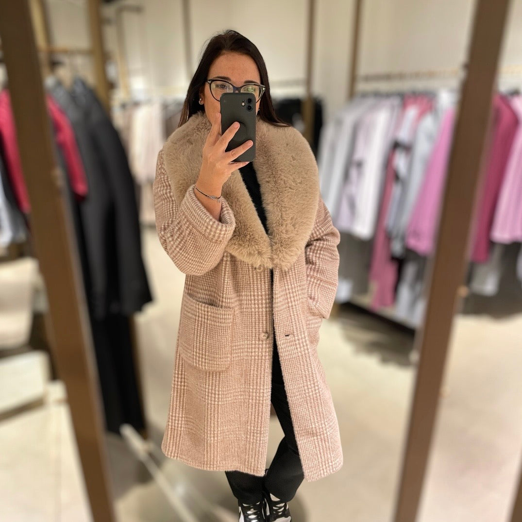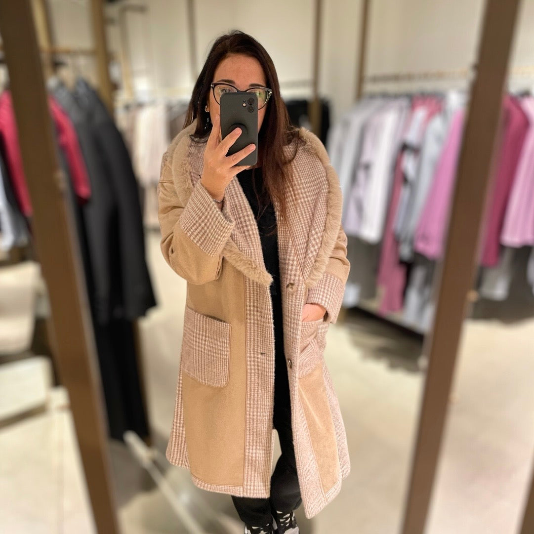Cappotto donna lungo double face. Lato cappotto in tessuto morbido effetto peluche, fantasia pied de poule, ampio collo in pelliccia ecologica, tasche a toppa quadrate. Lato doppio tessuto con bordi fantasia pied de poule e corpo in tessuto scamosciato, tasche applicate. Chiusura a due bottoni, vestibilità comoda. Veste S/M/L.