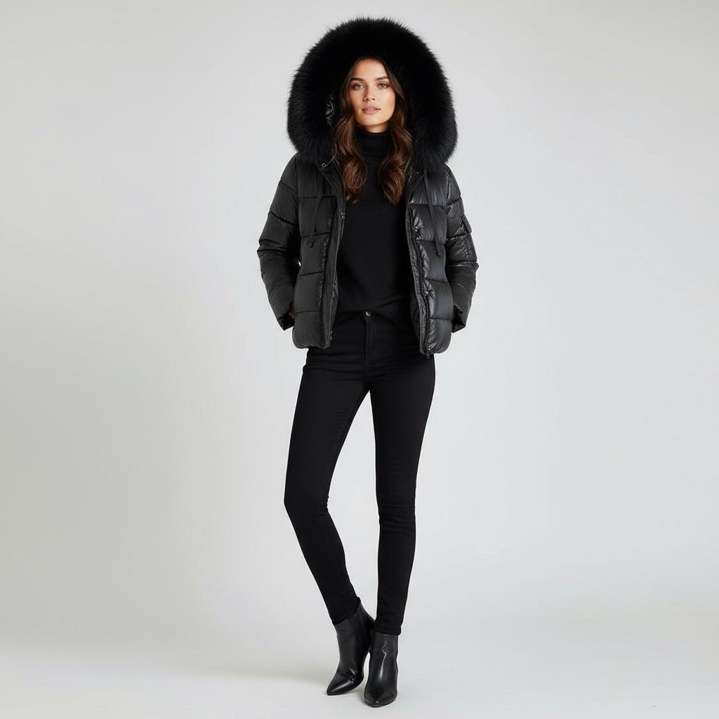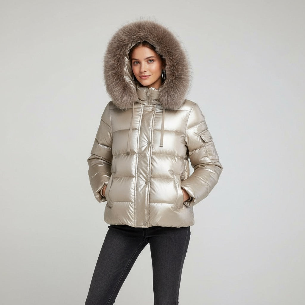 Giubbino corto in tessuto nylon cangiante. Ampio cappuccio con bordo in ecopelliccia staccabile. Chiusura con zip centrale coperta da pattina con bottoni automatici. Tasche laterali con bordo largo. Maniche lunghe con polsino interno elasticizzato, tasca applicata su un braccio. Fondo stondato con elastico. Vestibilità regolare.