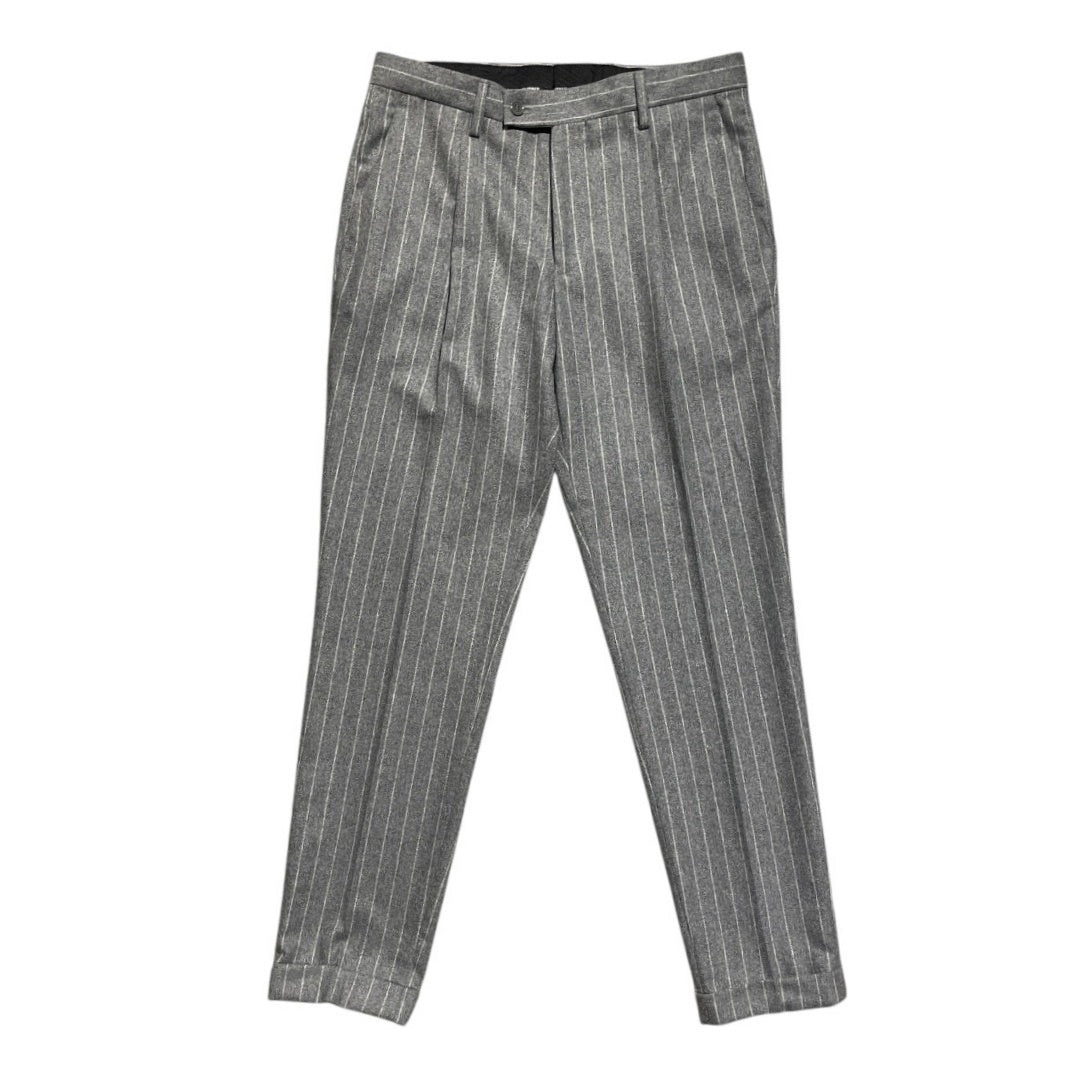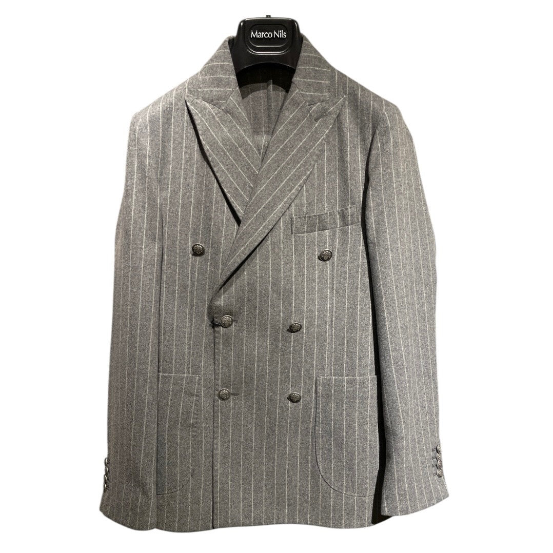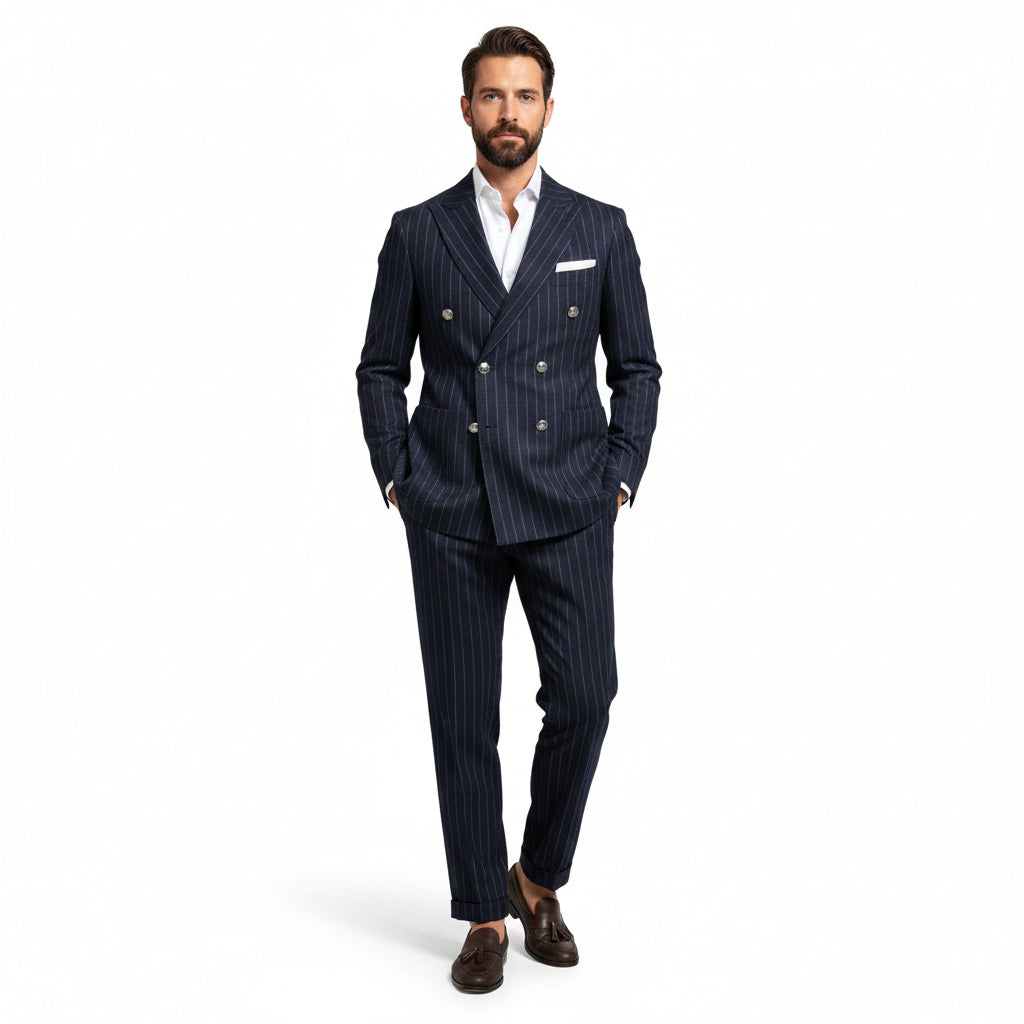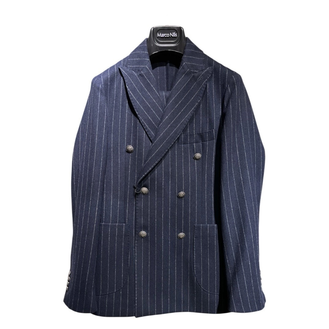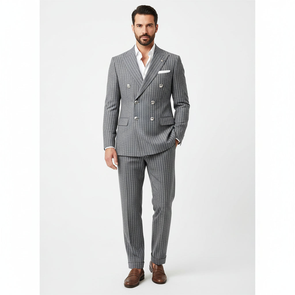 Abito uomo in tessuto misto lana motivo gessato. Collo con revers regolari, chiusura doppio petto con bottoni in stile militare. Capo foderato su spalle e braccia. Pantalone vita regolare, cinturino fisso con pences, chiusura con zip e pattina con bottone e gancio interno. Tasche a filo laterali e taschini posteriori con bottone. Gamba e fondo dritti, piega con risvolto. Composizione tessuto 70% poliestere 15% lana 15% viscosa.