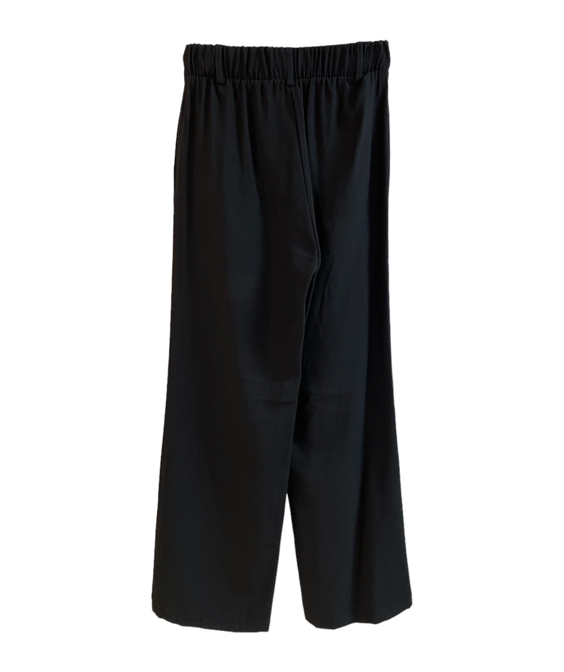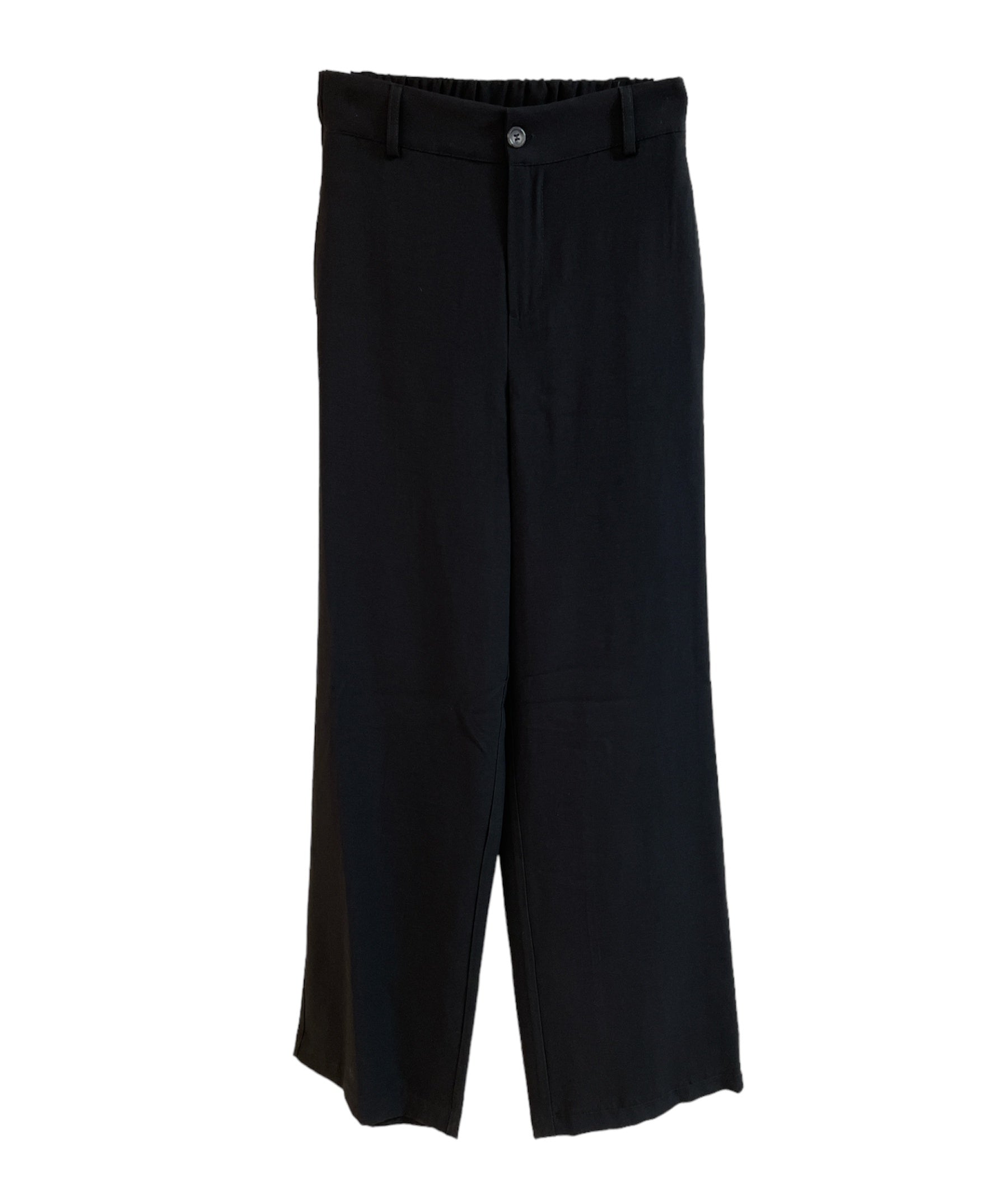 Pantalone in tessuto leggero misto viscosa. Vita alta con elastico sulla schiena, cinurino fisso con passanti sul davanti, chiusura con zip e bottone. Tasche a filo laterali. Gamba e fondo ampi. Vestibilità regolare. Crea il tailleur con la giacca blazer abbinata. Composizione tessuto 91% viscosa 9% poliestere.