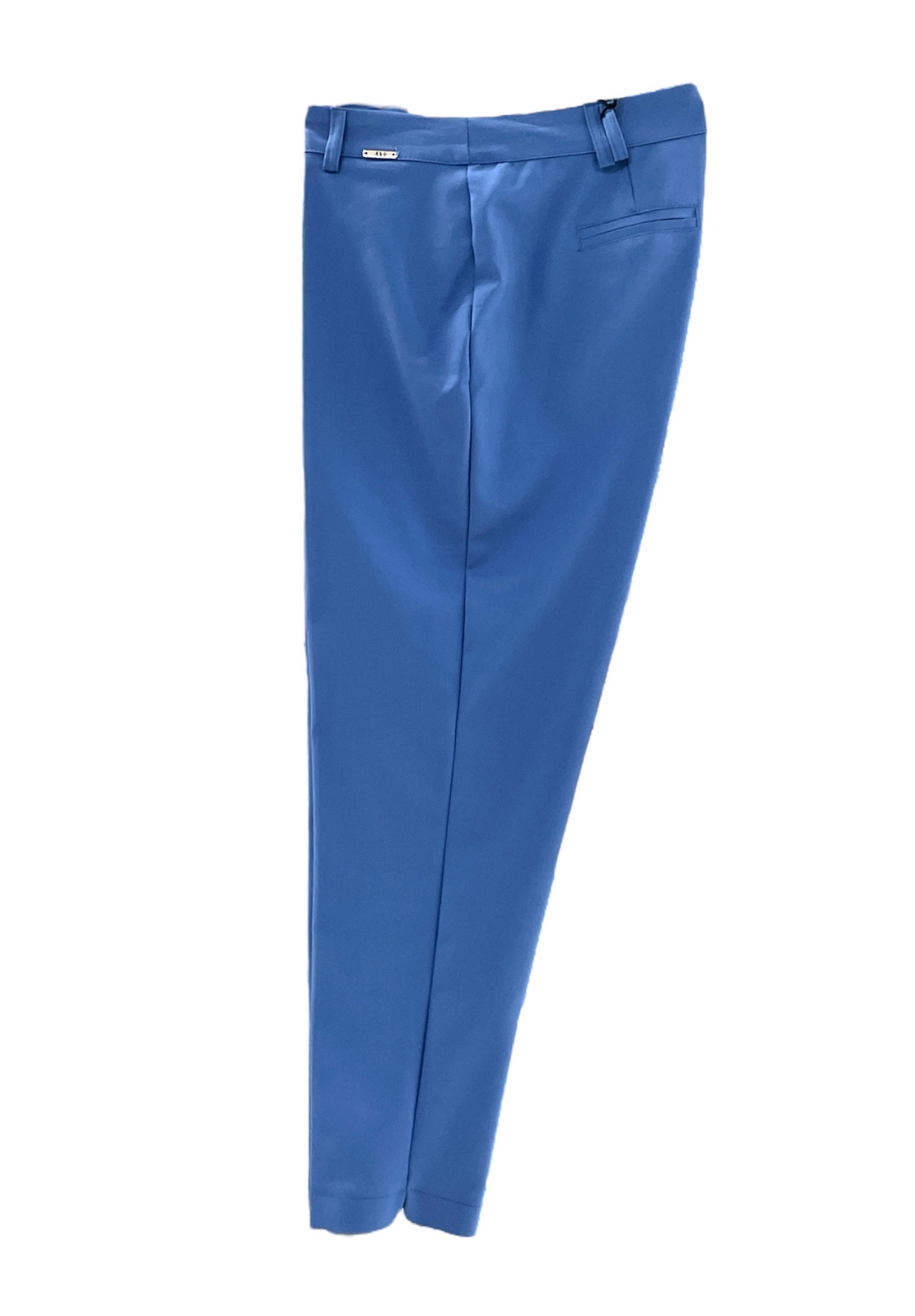 Pantalone basico in tessuto elasticizzato misto cotone. Vita alta, cinturino fisso con passanti, chiusura con zip e bottone. Tasche a filo laterali. Gamba e fondo stretti, spacchetti sul fondo. Vestibilità slim regolare.