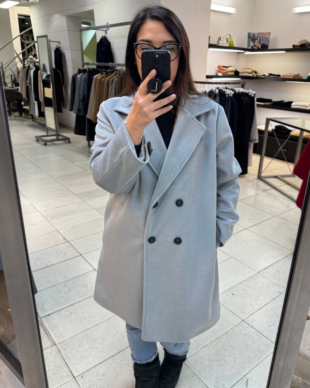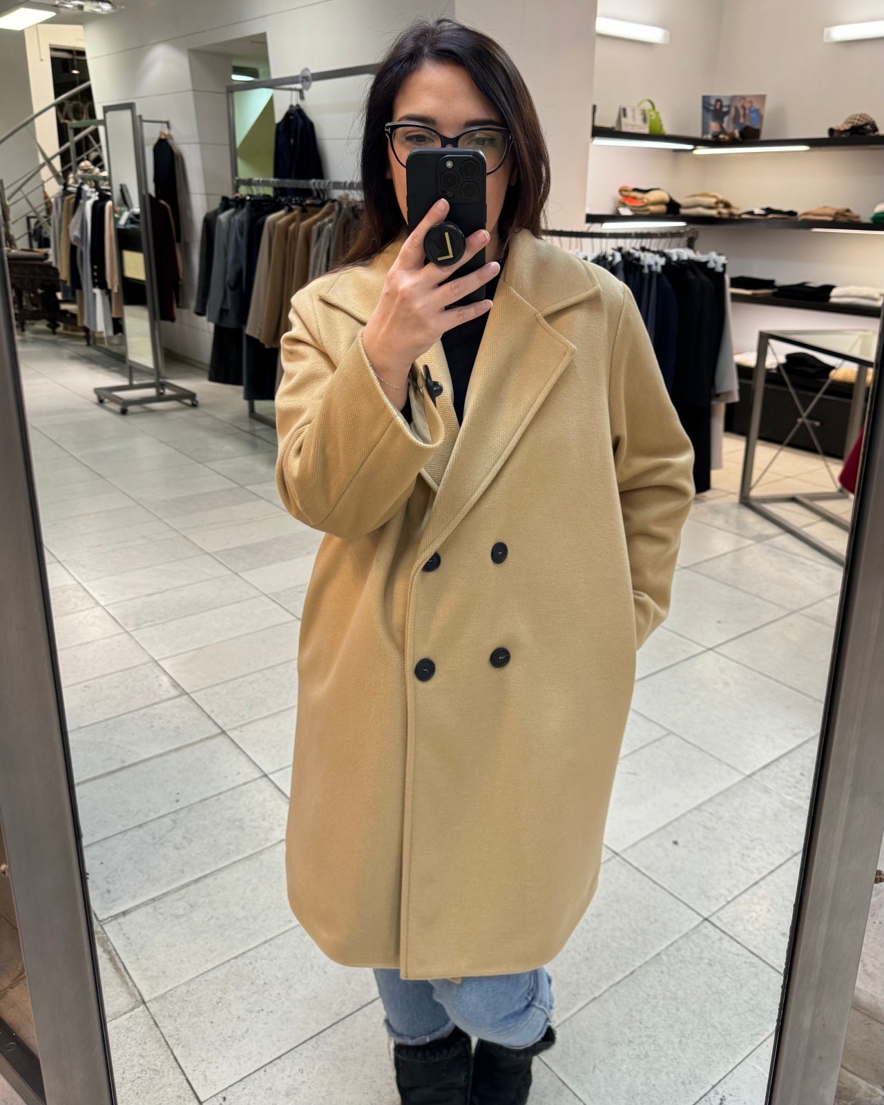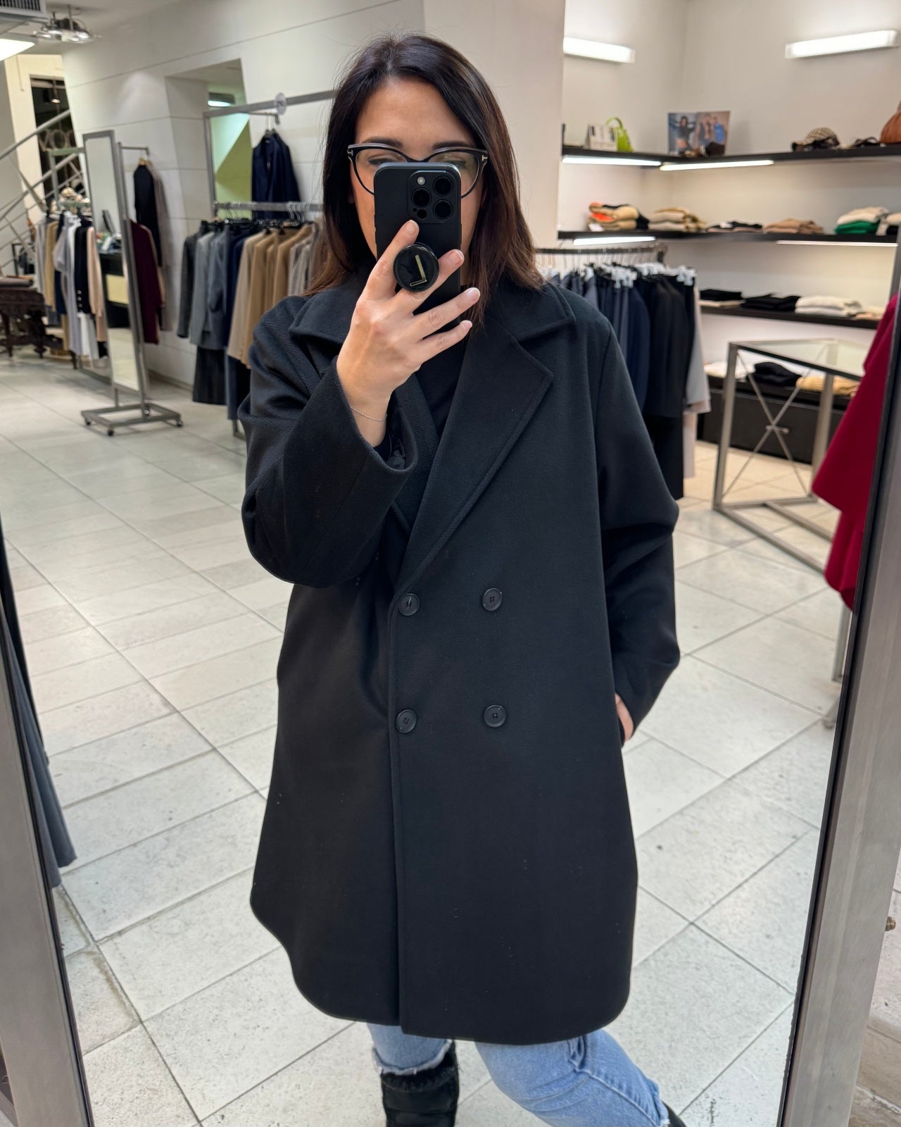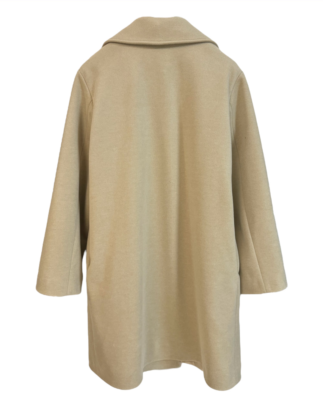 Cappotto midi in tessuto velour misto viscosa. Collo con revers ampi, chiusura doppio petto con bottoni a contrasto, tasche a filo laterali. Capo foderato, vestibilità comoda. Composizione tessuto 90% poliestere 10% viscosa.