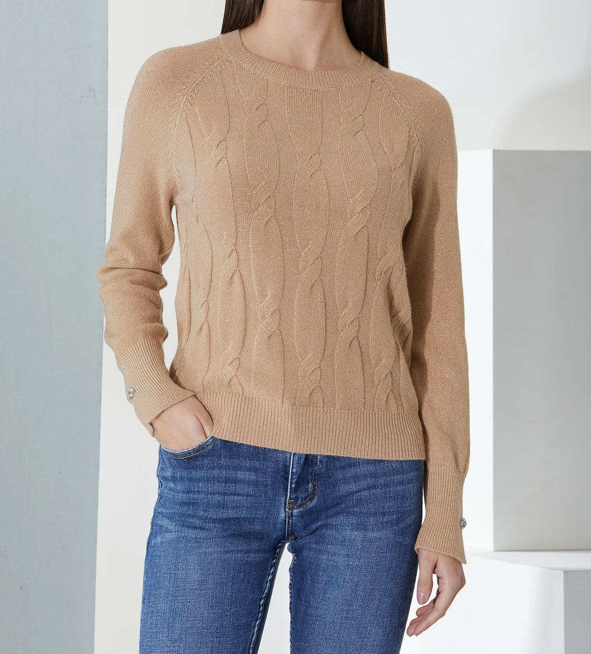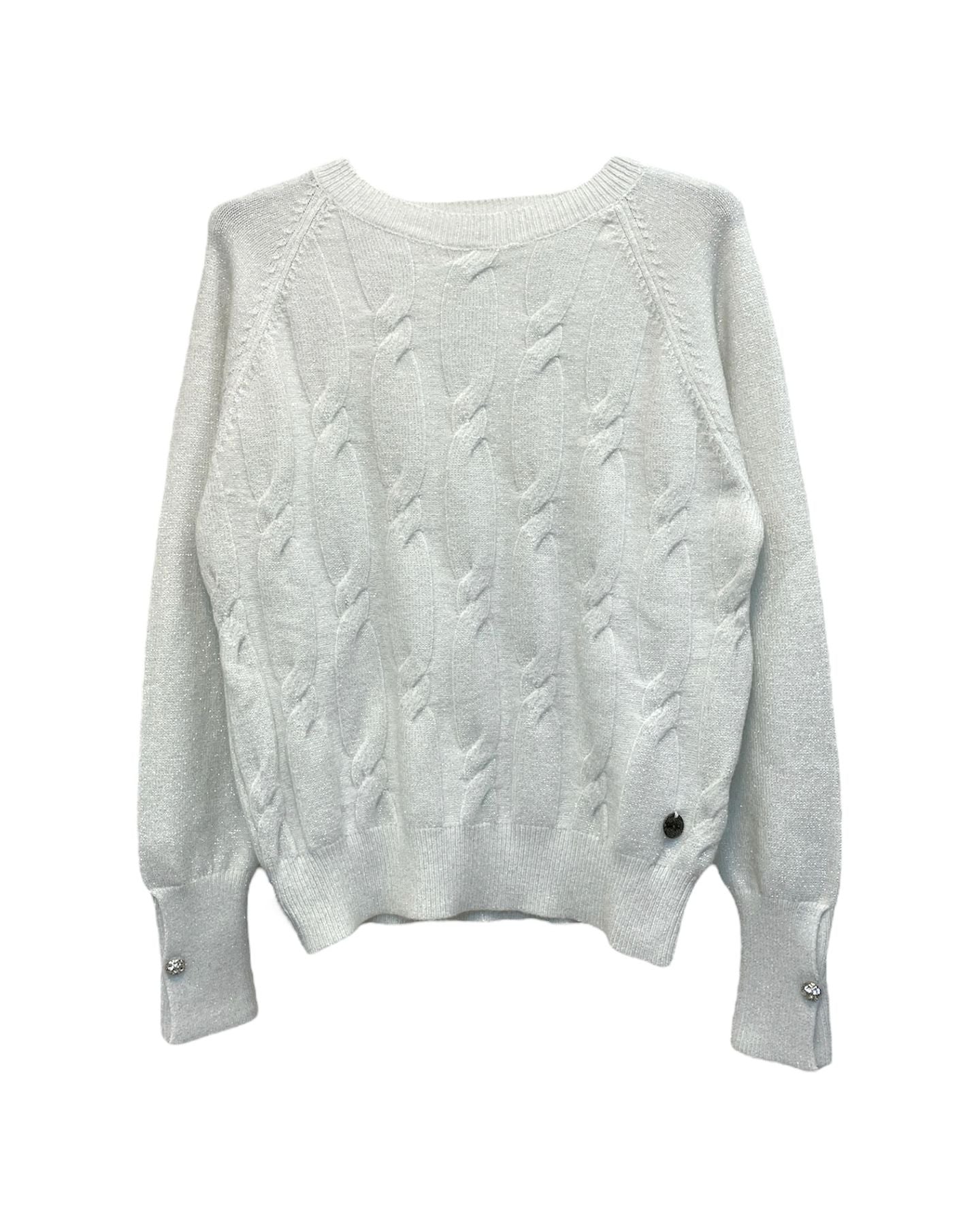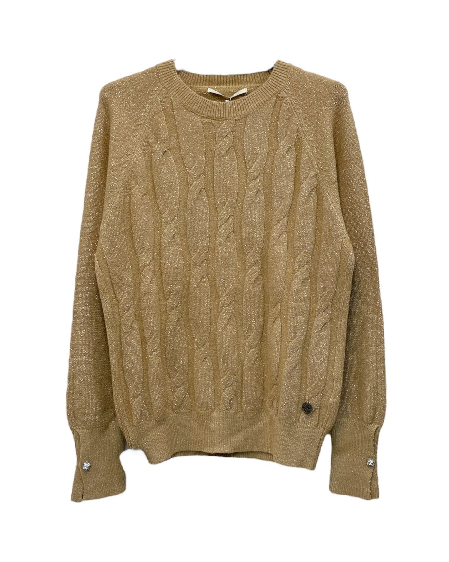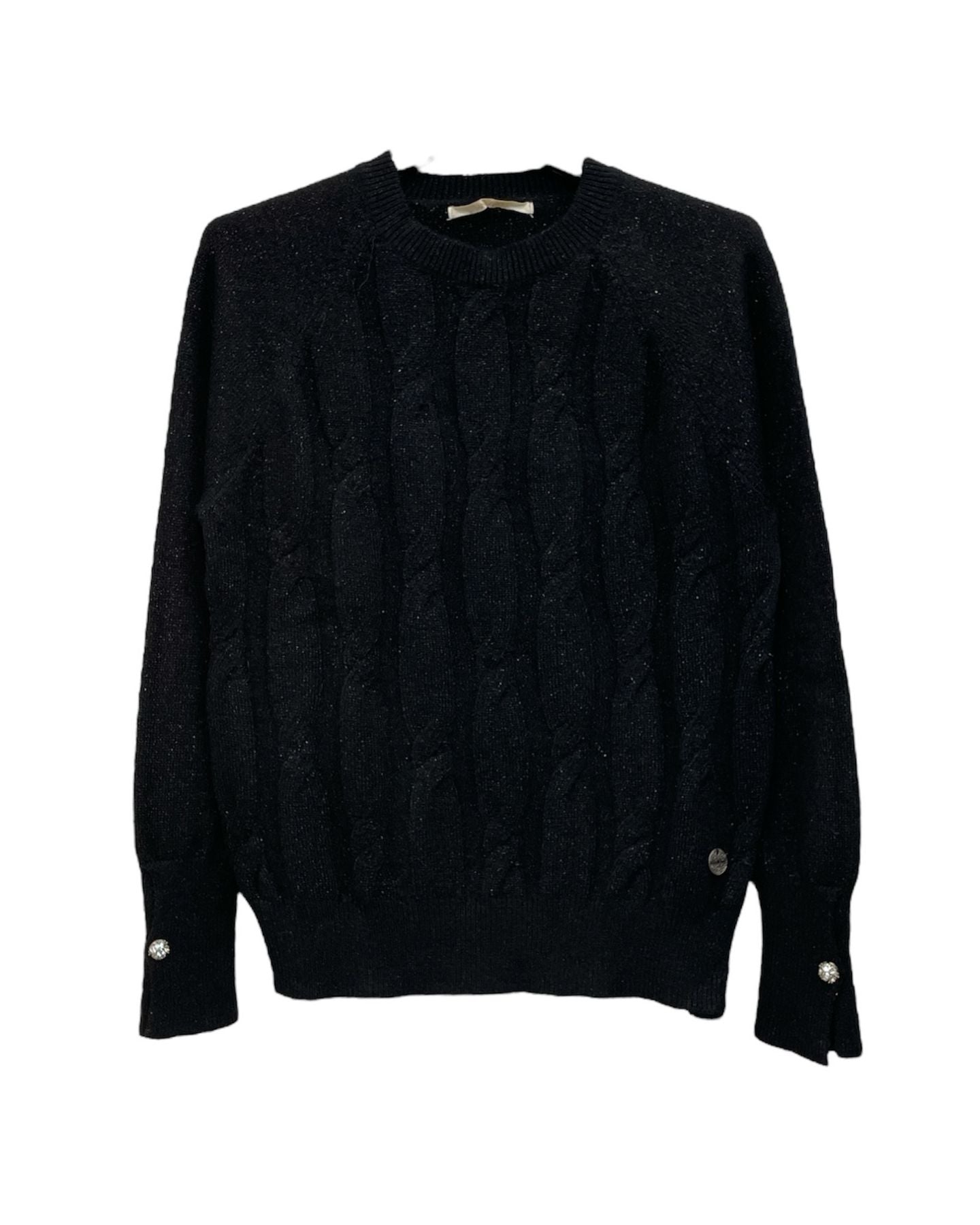 Maglia in morbido tessuto misto viscosa con inserti in lurex. Girocollo, bordi e polsini rifiniti a costine. Motivo a trecce su tutta la superficie, vestibilità regolare.