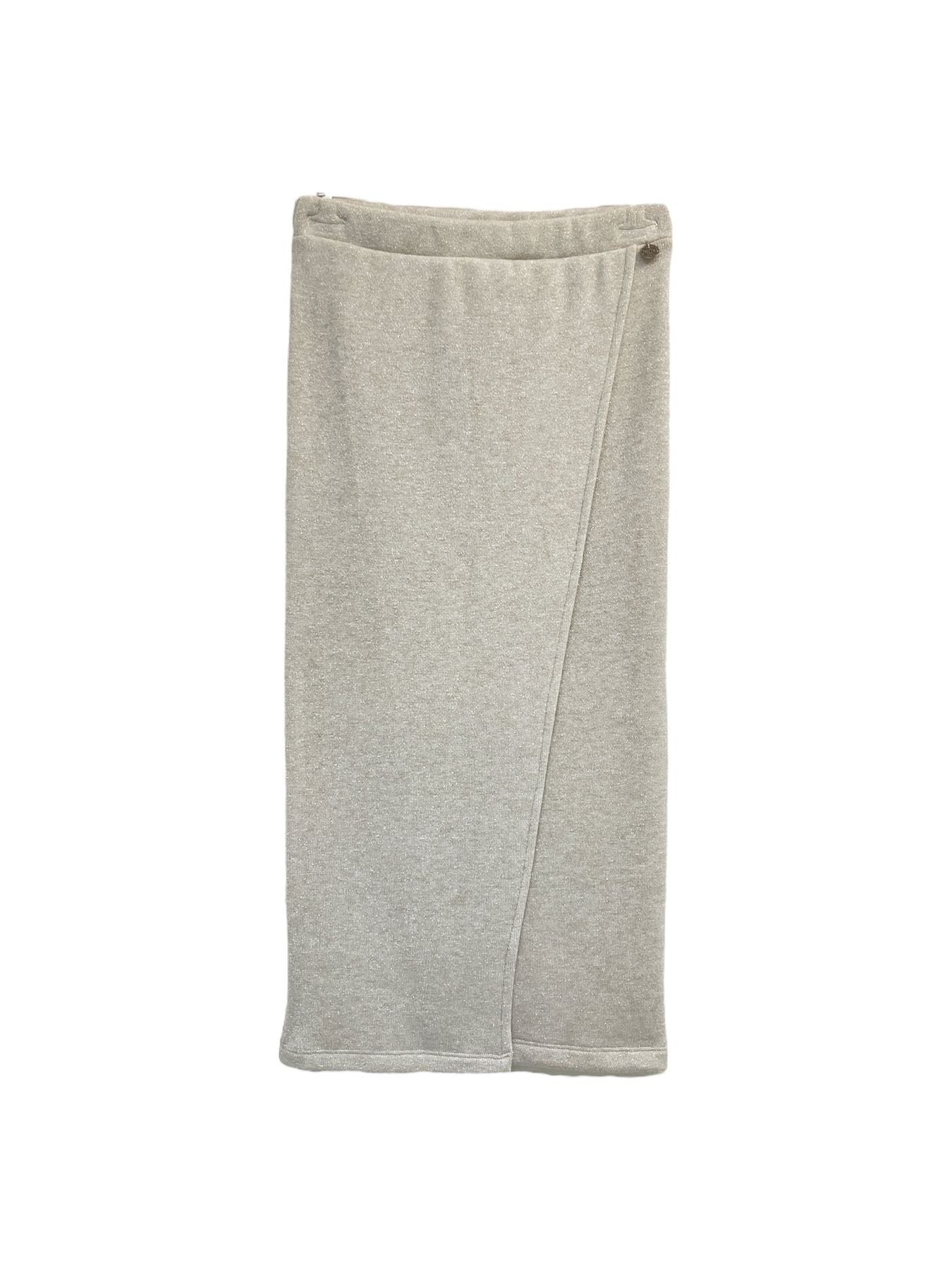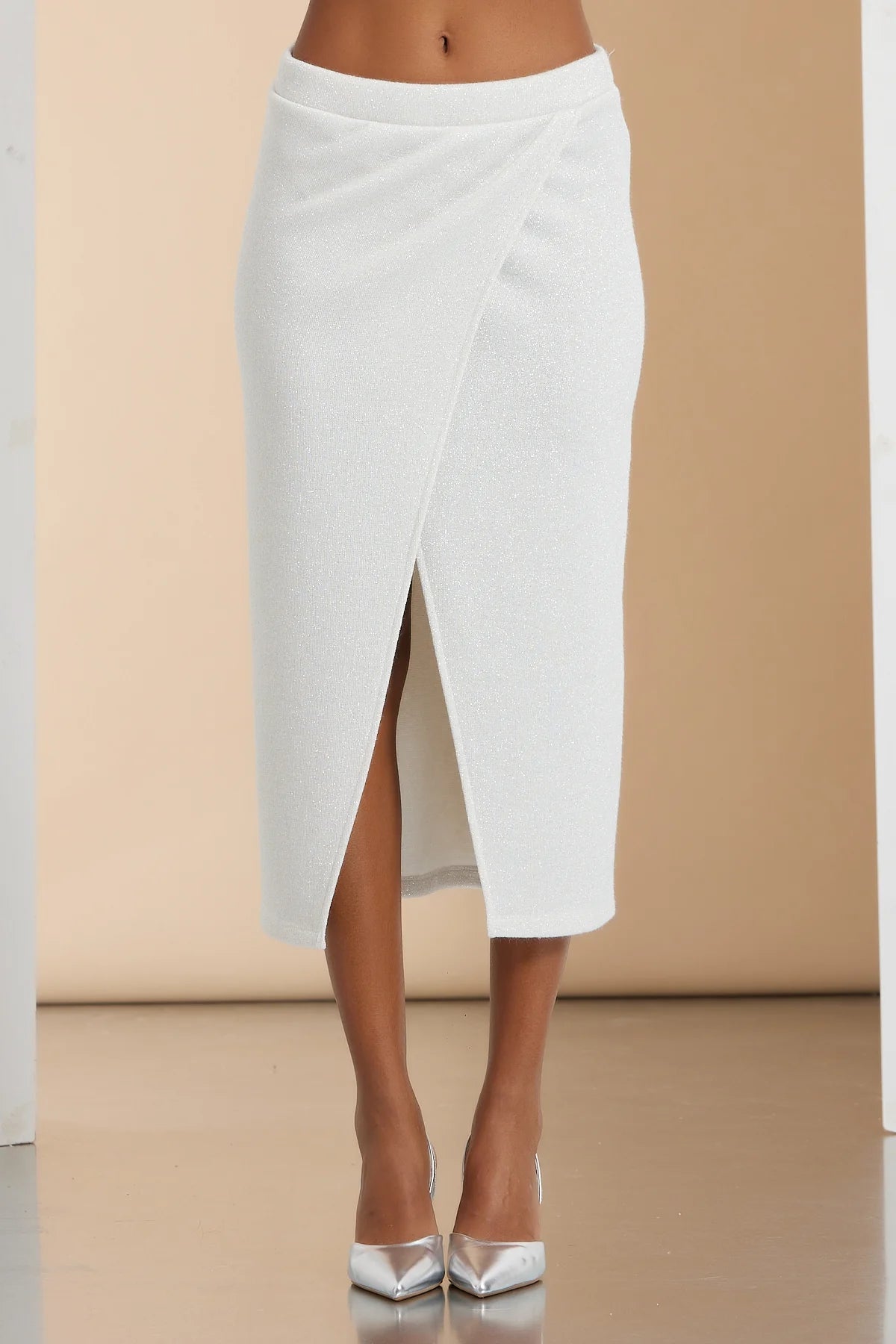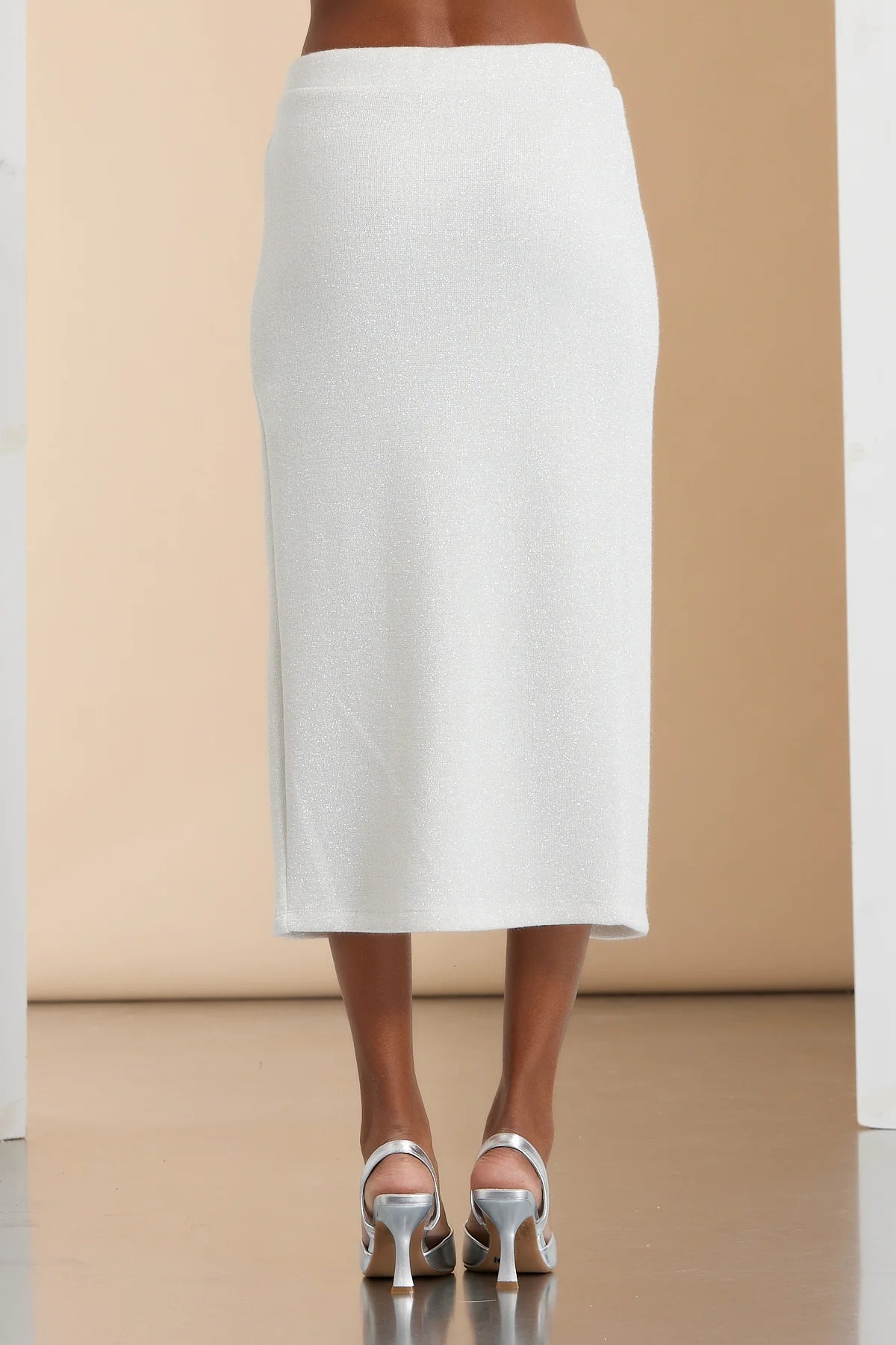 Gonna in maglina morbida con inserti in lurex tono su tono. Vita regolare con elastico, vestibilità morbida sui fianchi. Apertura laterale finto portafoglio con spacco centrale. Crea il completo con la felpa crop.