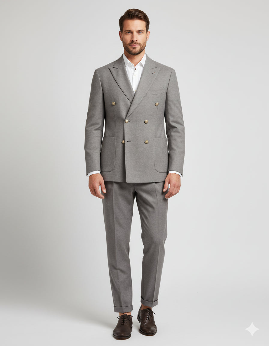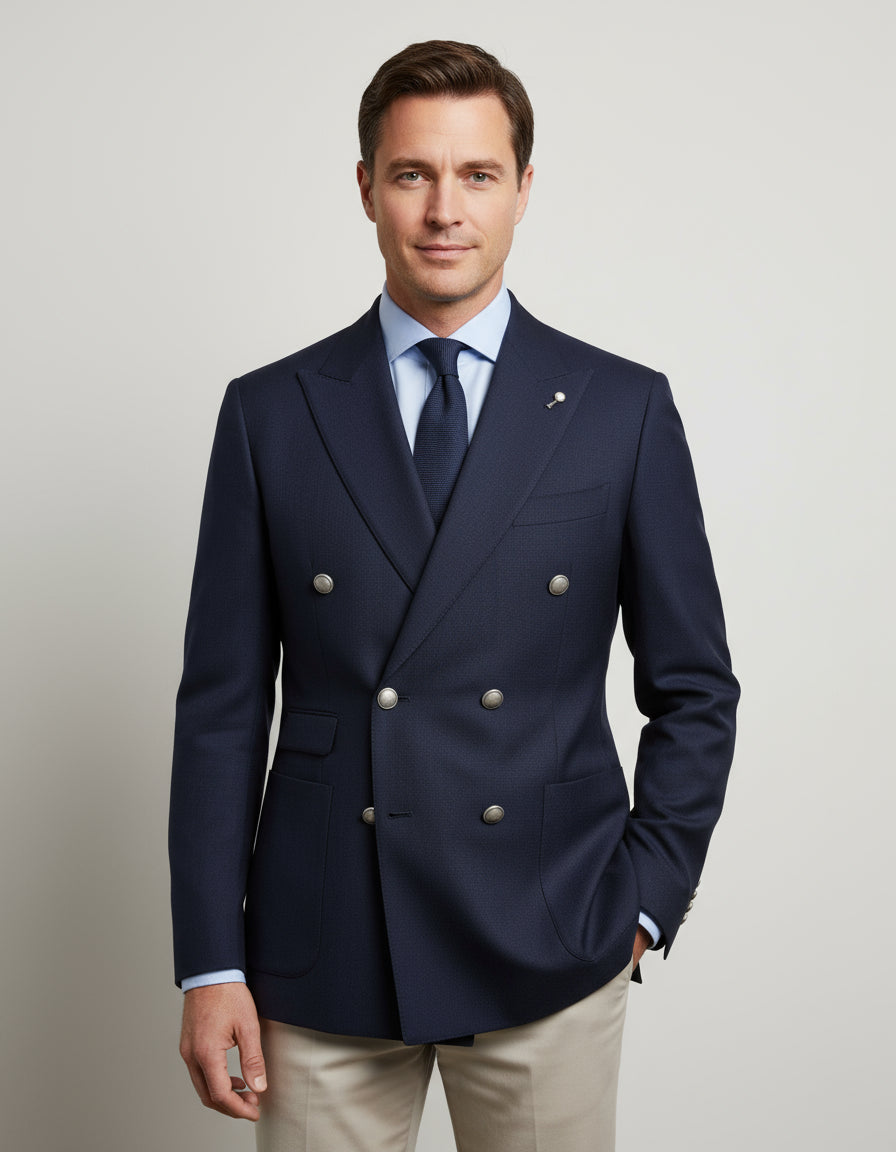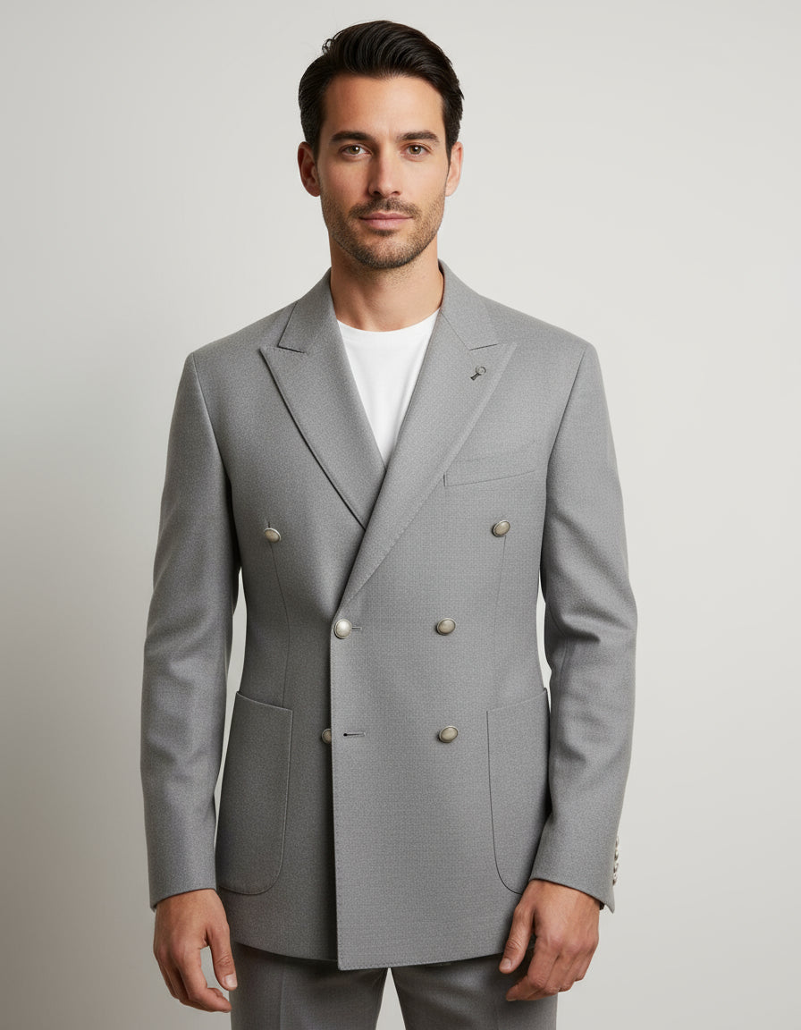 Giacca uomo doppio petto in tessuto misto viscosa mano lana. Revers a lancia, chiusura doppio petto con bottoni ottonati. Taschino sul petto e tasche a toppa sul davanti. Capo non foderato. Vestibilità regolare. Crea l'abito con i pantaloni abbinati. Composizione tessuto 68% poliestere 30% viscosa 2% elastan.