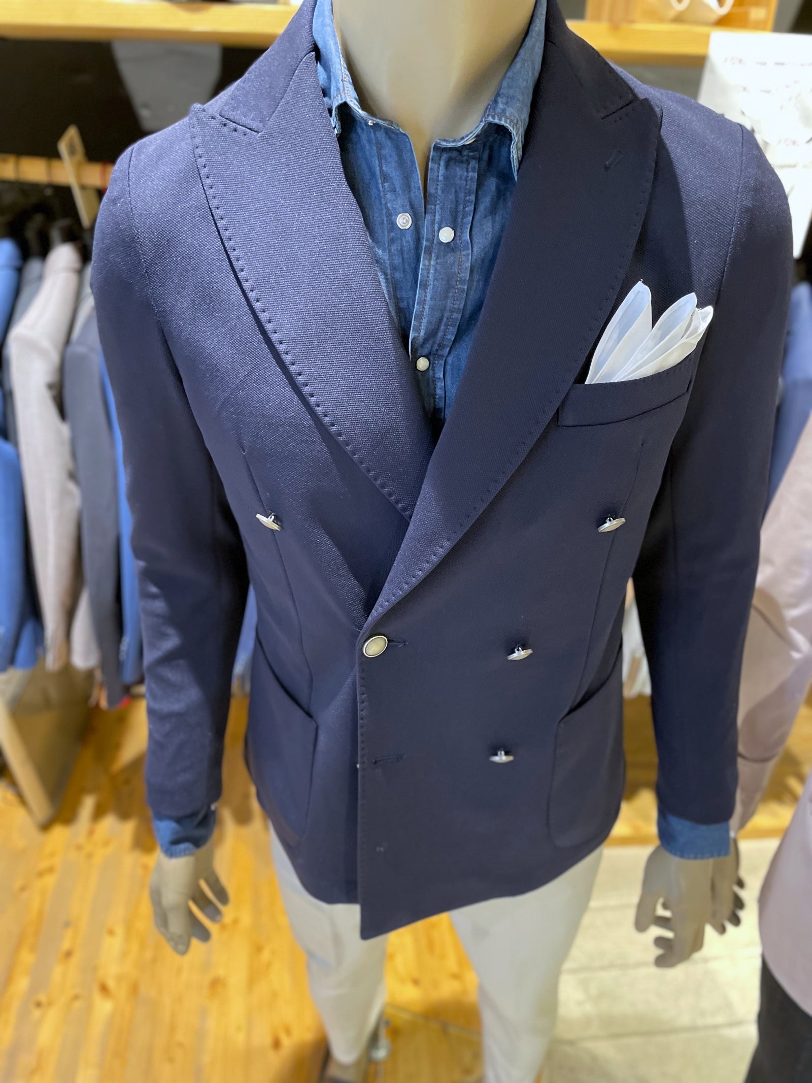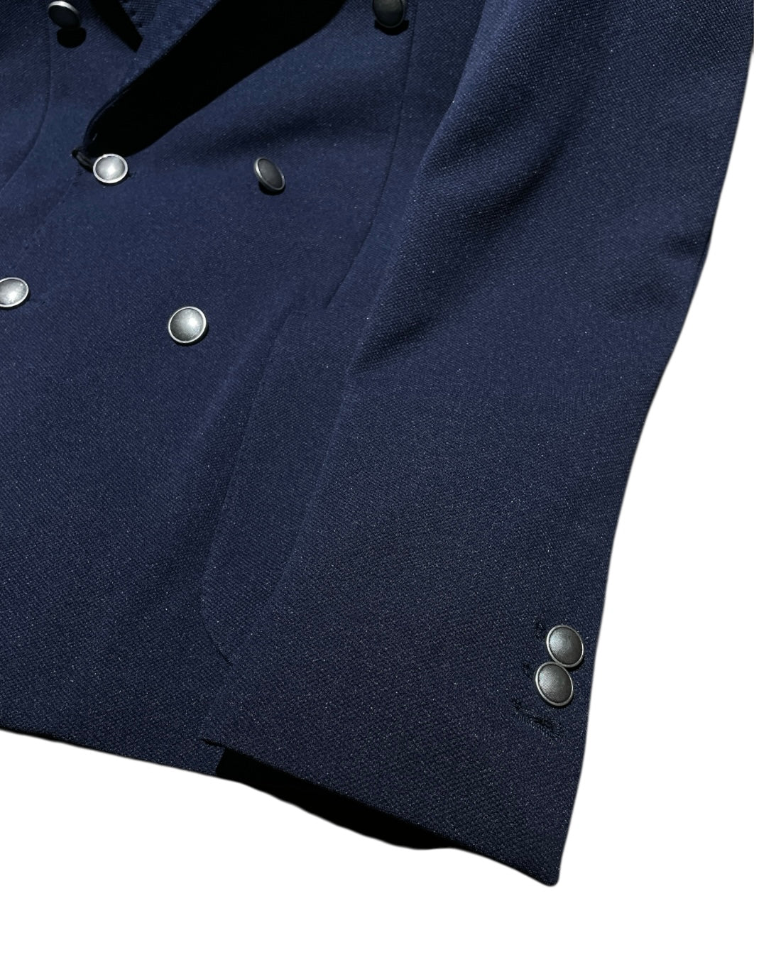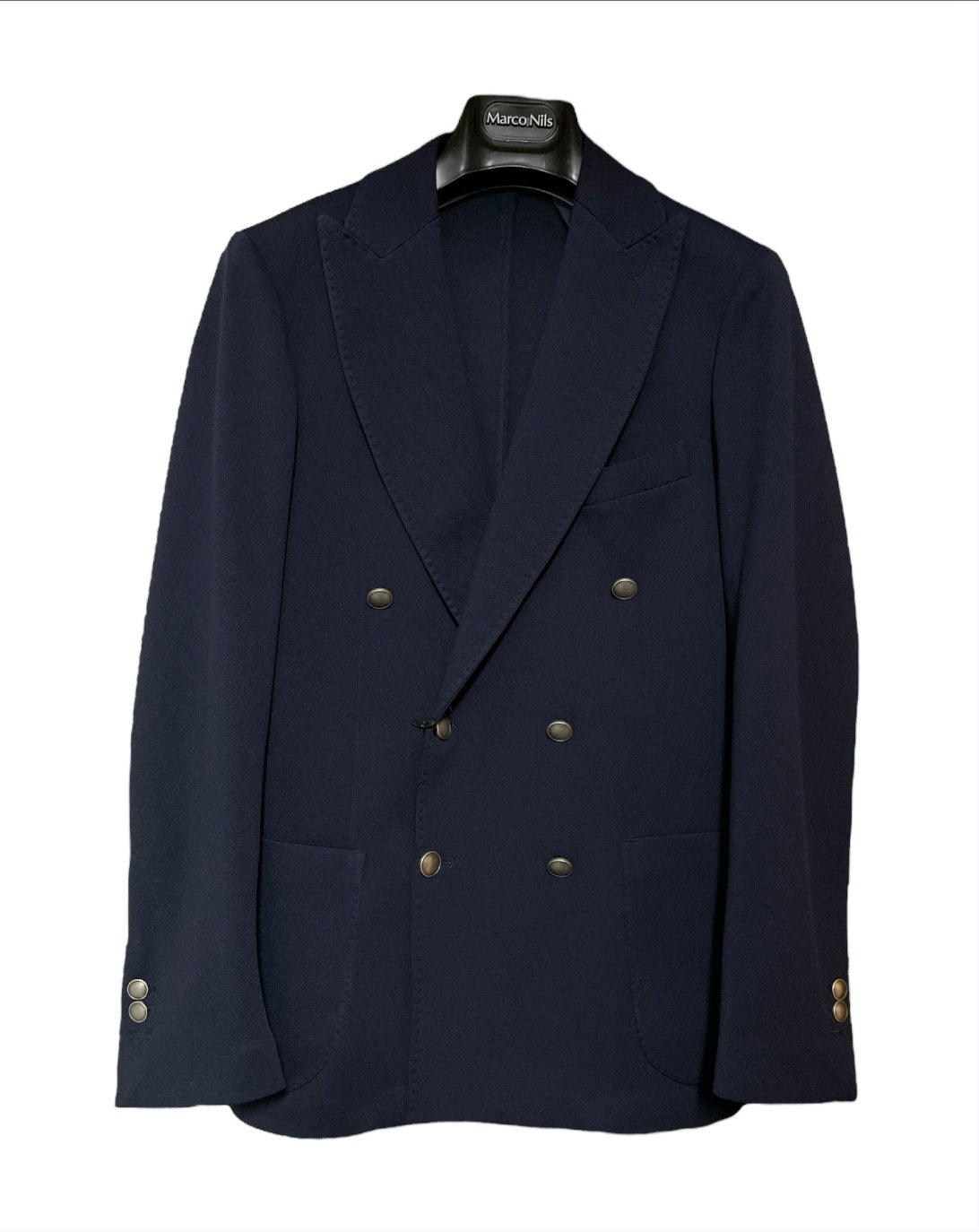 Giacca uomo doppio petto in tessuto elasticizzato. Capo sfoderato. Revers a lancia, chiusura doppio petto con bottoni ottonati. Capo non foderato. Vestibilità regolare.