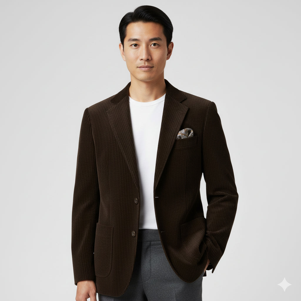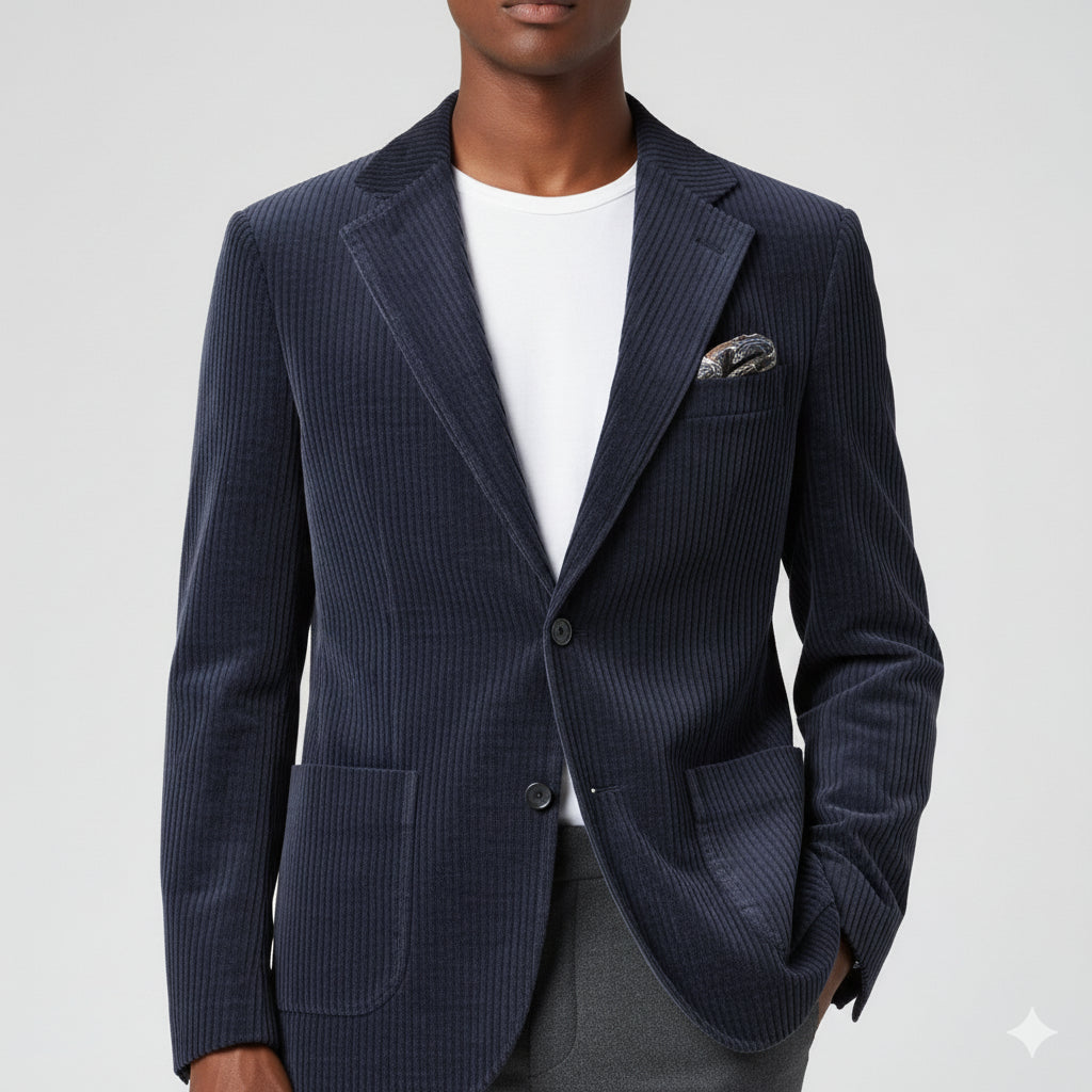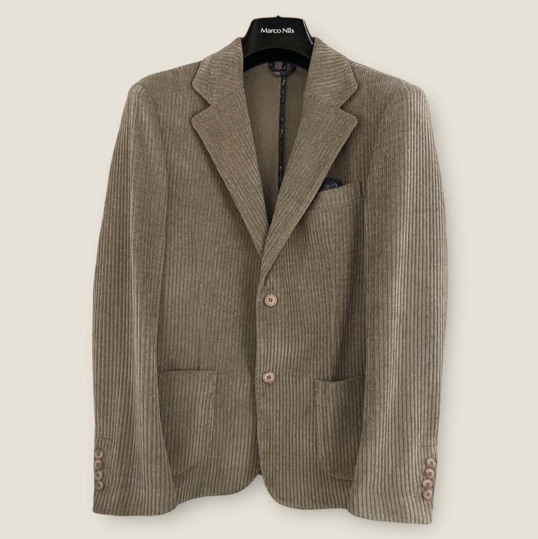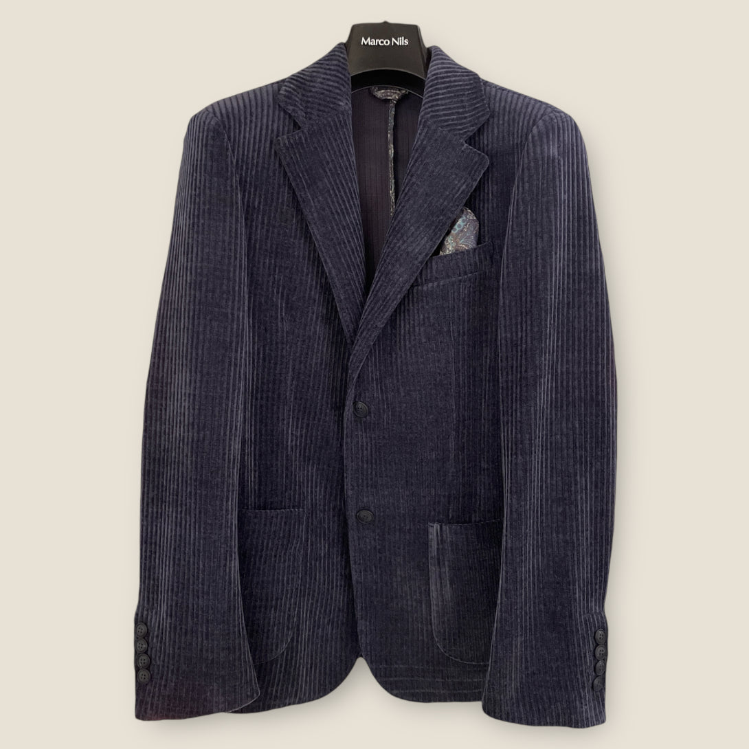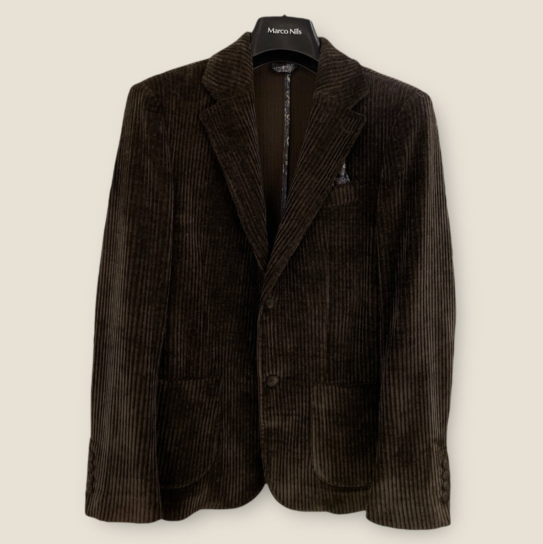 Giacca uomo in tessuto velluto rocciatore. Collo con revers regolari, chiusura con doppio bottone centrale. Taschino sul petto, tasche a toppa applicate. interno del taschino in tessuto fantasia. Vestibilità slim. Capo foderato su spalle ed interno braccia. Composizione tessuto 98% poliestere, 2% elastan.