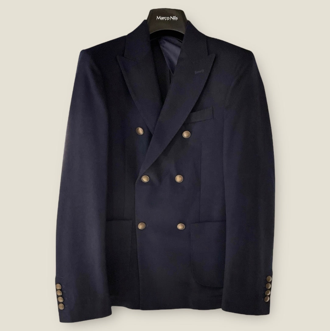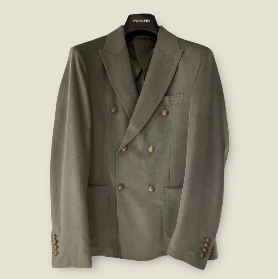 Giacca uomo doppio petto in tessuto fustagno effetto velluto. Collo con revers regolari, tessuto lavorato diagonale. Taschino sul petto, tasche a toppa applicate. Vestibilità slim. Capo foderato su spalle ed interno braccia. Composizione tessuto 97% poliestere 3% elastan.
