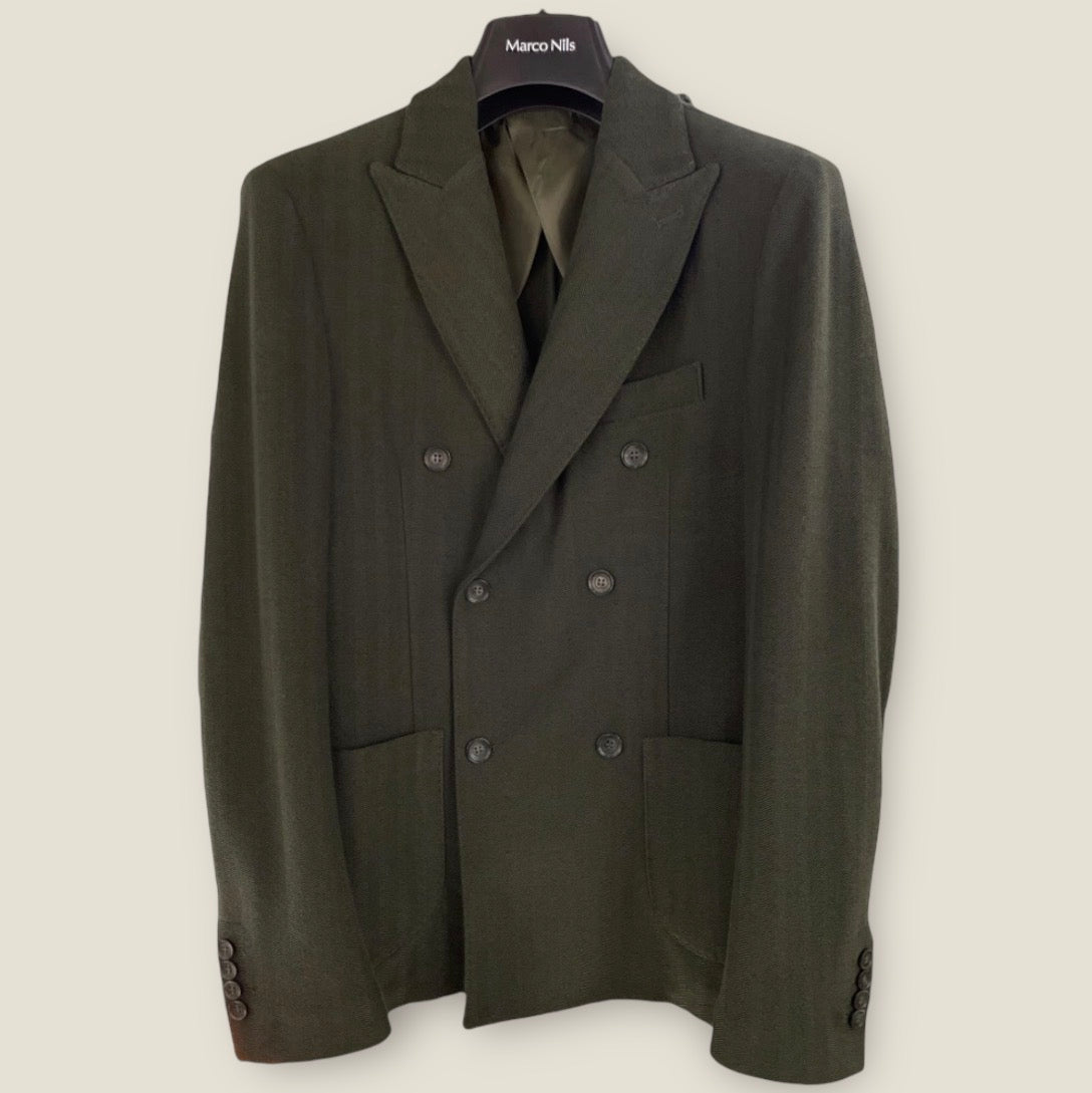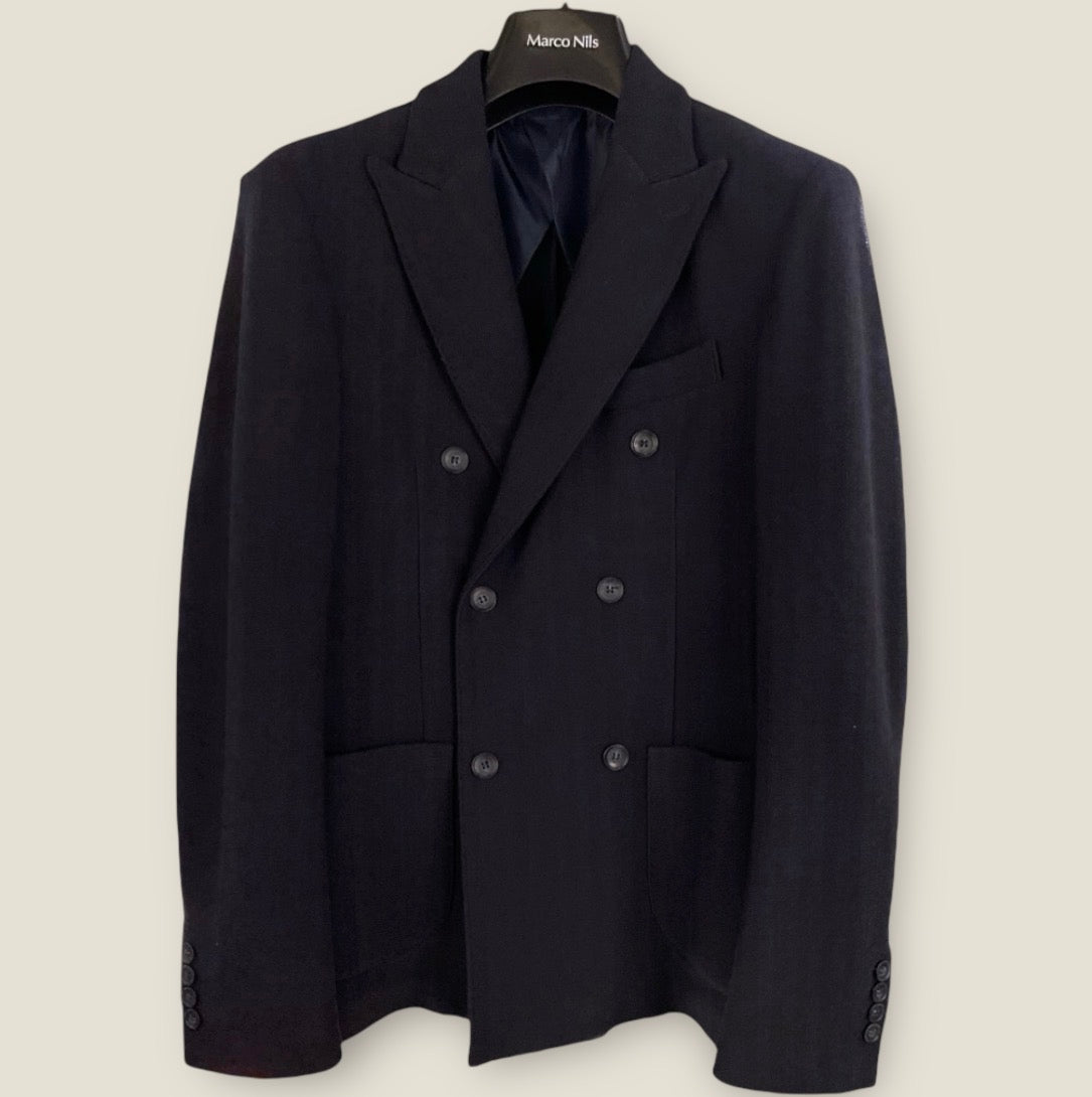 Giacca uomo in tessuto tecnico motivo spigato. Collo con revers a lancia, chiusura doppio petto con bottoni in tinta. Taschino sul petto, tasche a toppa sul davanti. Capo con maniche foderato. Vestibilità regolare. Composizione tessuto 99% poliestere, 1% elastan.
