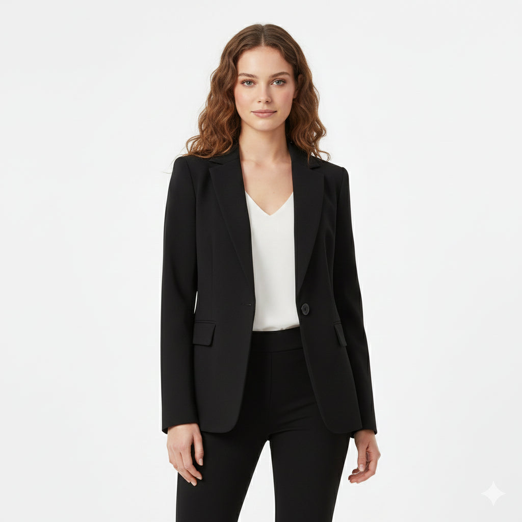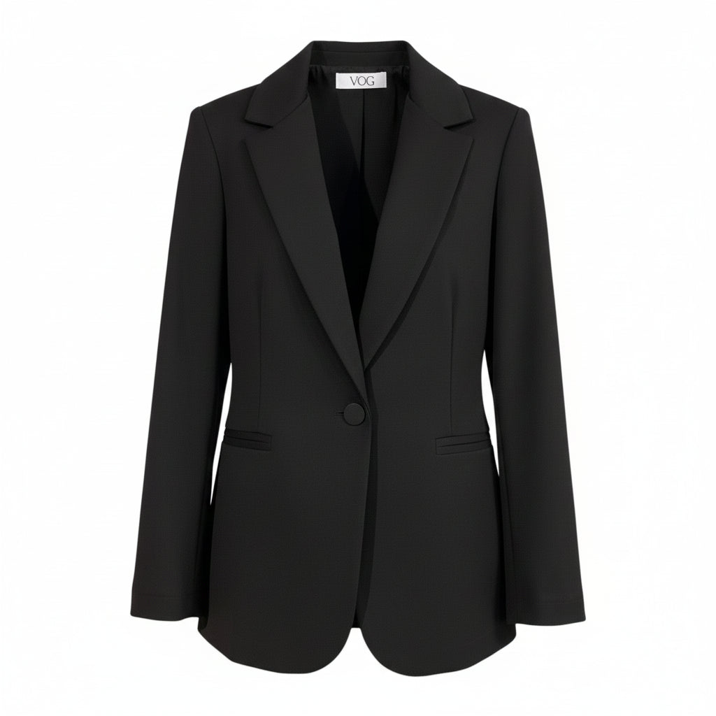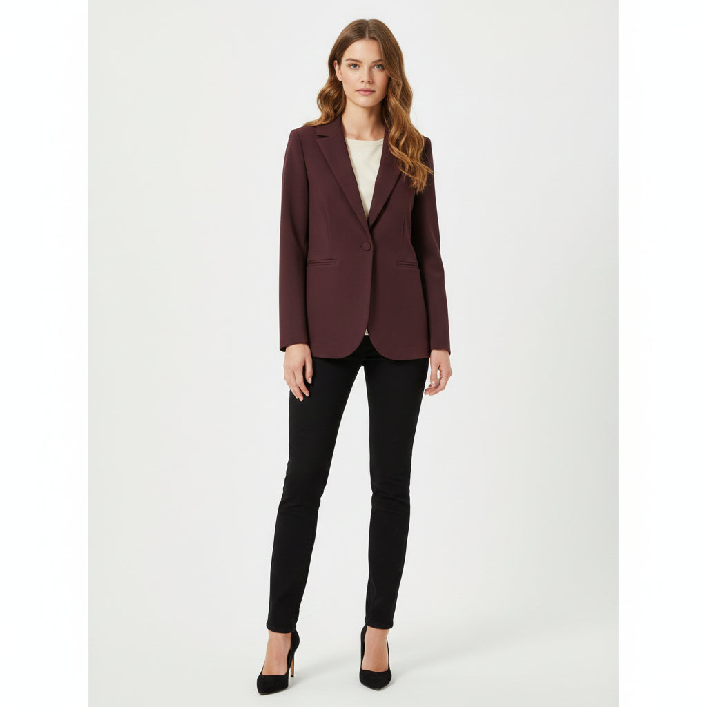 Giacca donna slim fit in tessuto elasticizzato maglina punto milano. Collo con revers classici, chiusura con bottone rivestito. Vestibilità slim regolare. Crea il tailleur con il pantalone abbinato. Composizione tessuto 65% viscosa 30% poliammide 5% elastan.